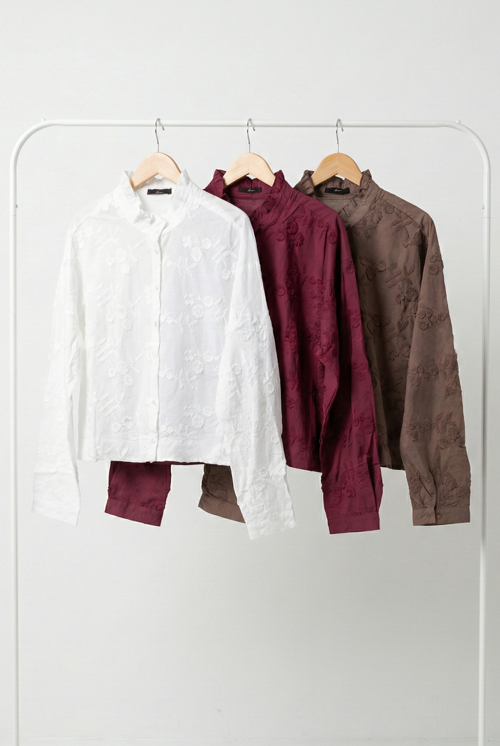 Camisa de mujer importada de calce recto con largo modular hasta la primera cadera. Lleva mangas largas con puños con apertura y botón. El cuello es mo con terminación de volados. También, se concede acceso a la prenda mediante botones de dos orificios forrados con el género base. La prenda está confeccionada con un poplín de algodón con un bordado floral al tono.