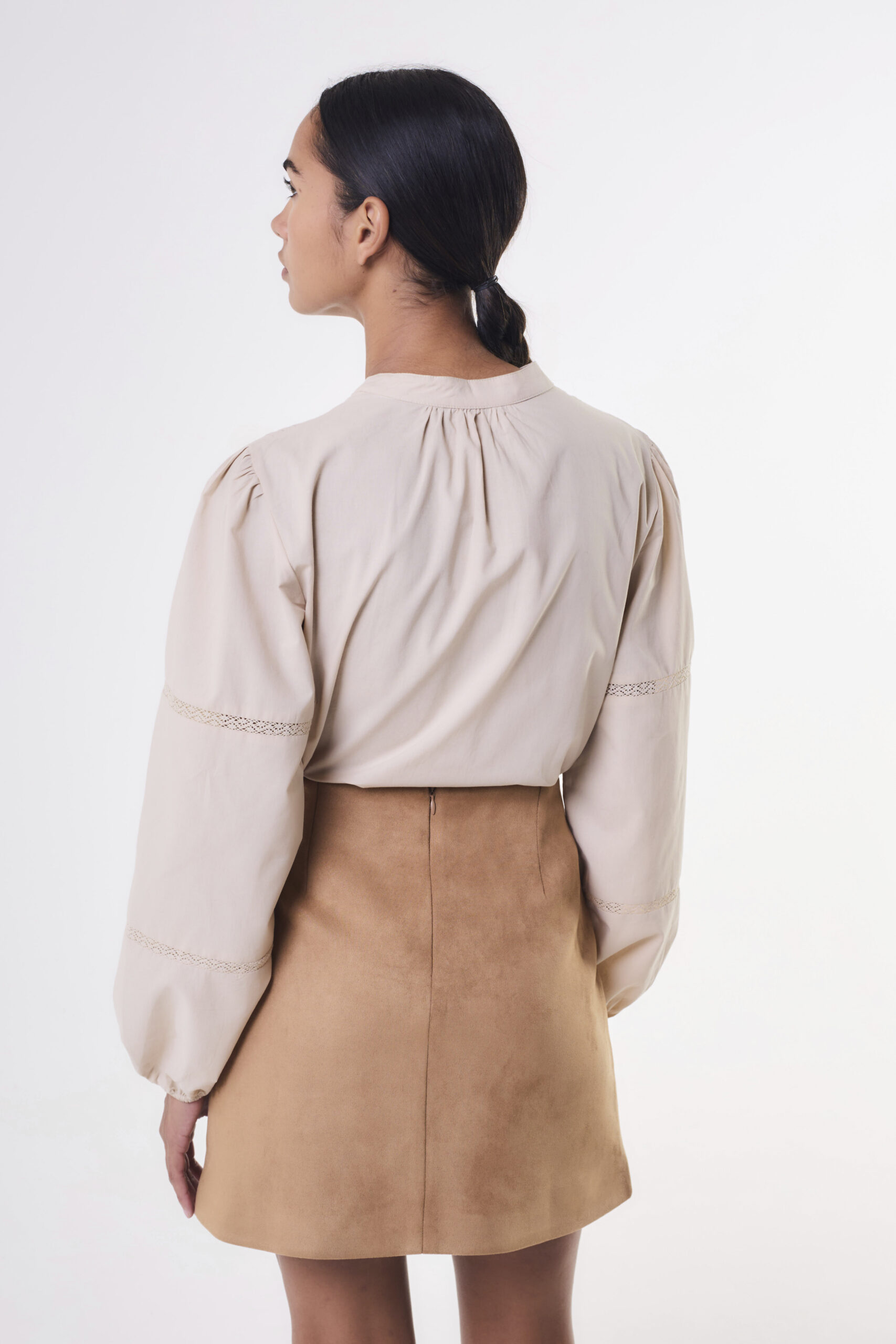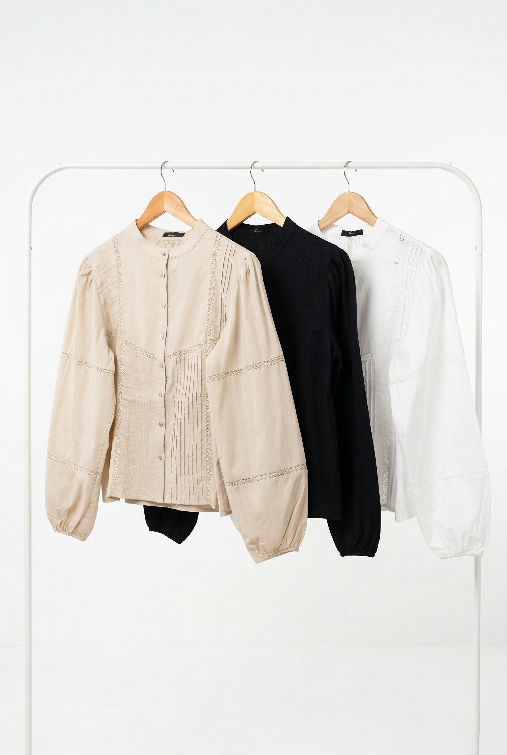 Camisa de mujer importada de calce recto con largo modular hasta la primera cadera. Posee mangas largas abullonadas con puño elástico, y un entredós de algodón al tono. Además, tiene cuello mao y recortes varios en el delantero, delimitados por entredos al tono, al igual que lleva alforzas en todo el delantero. Se concede acceso mediante botones nacarados en la cartera de botones. La camisa está confeccionada en voile de algodón.
