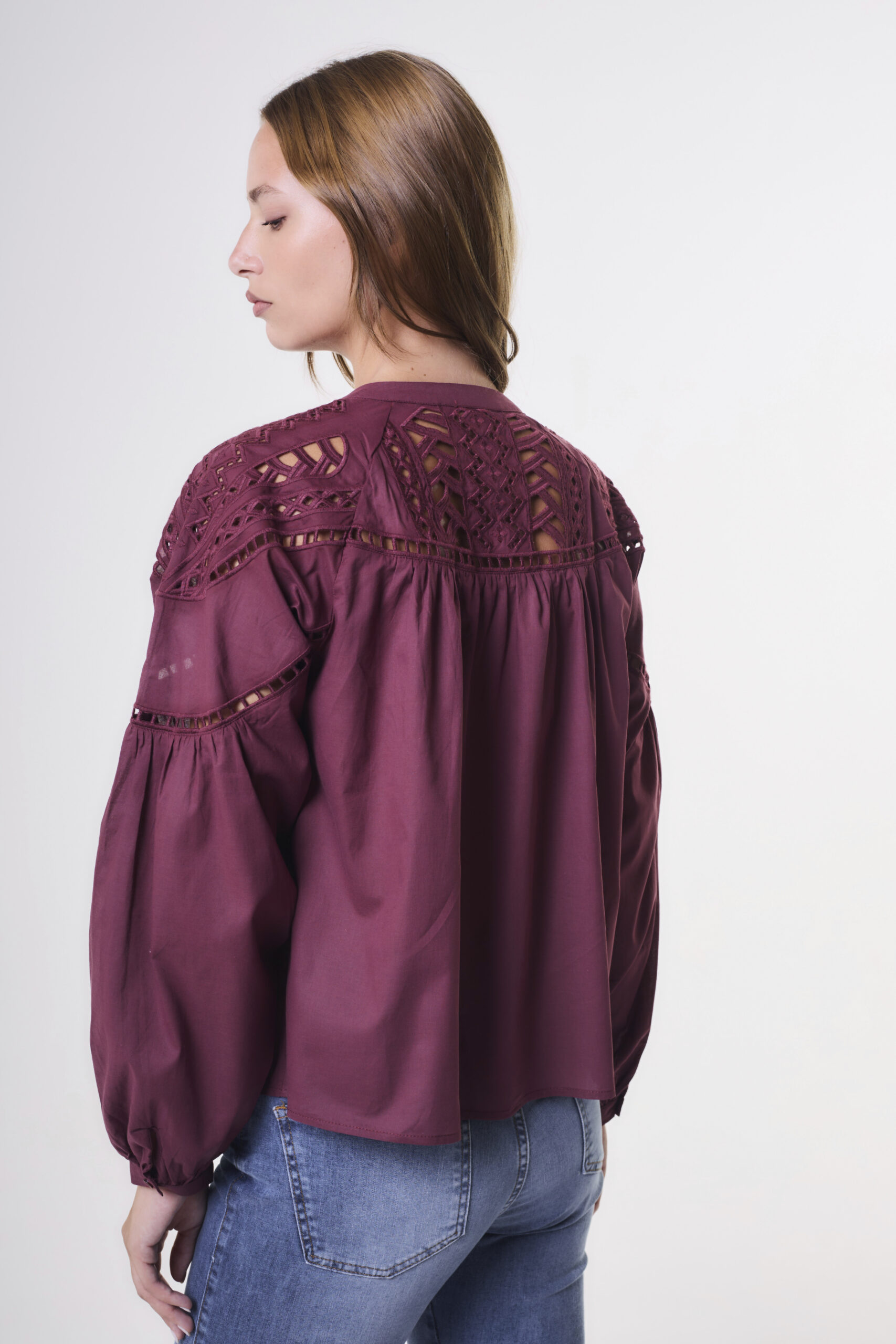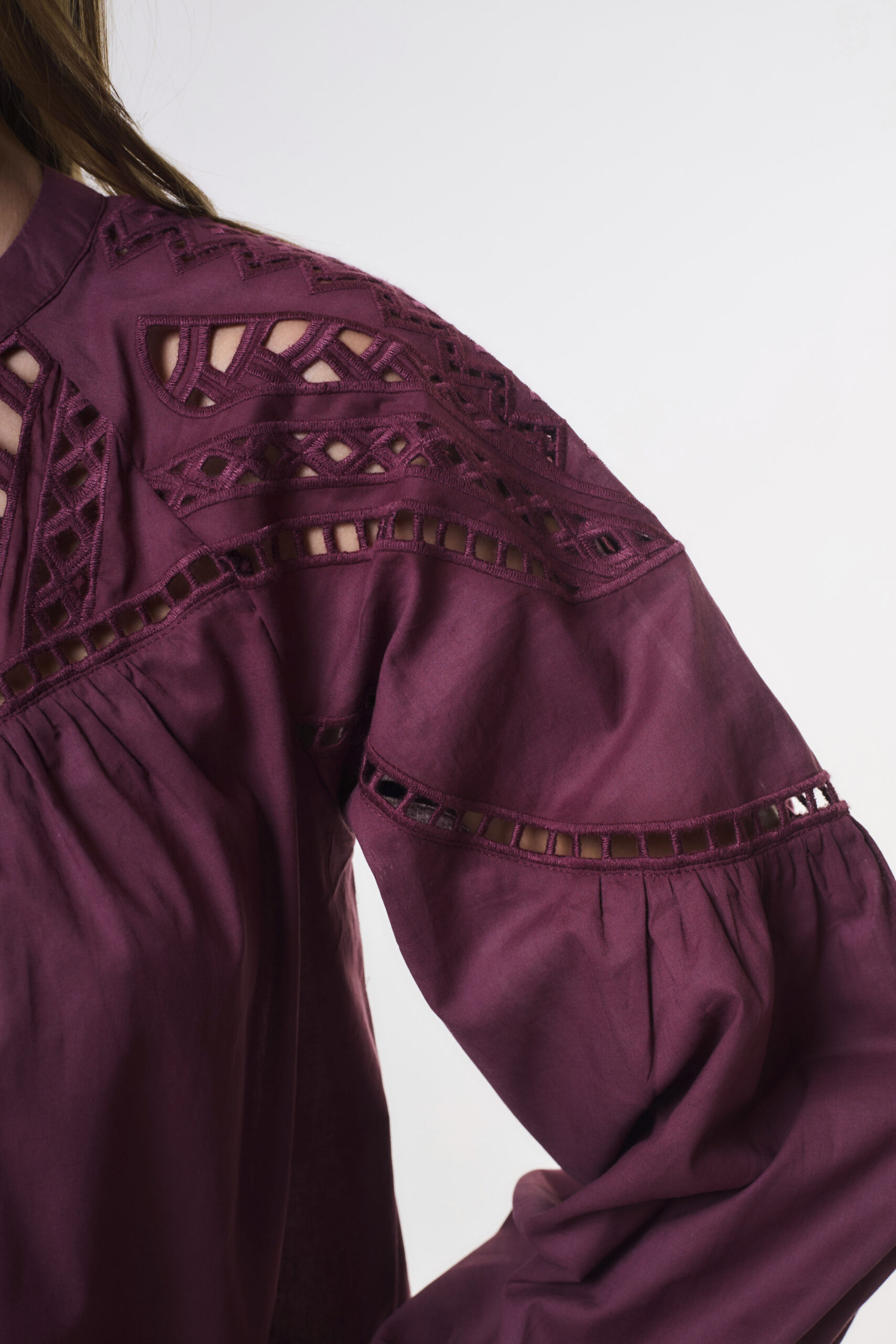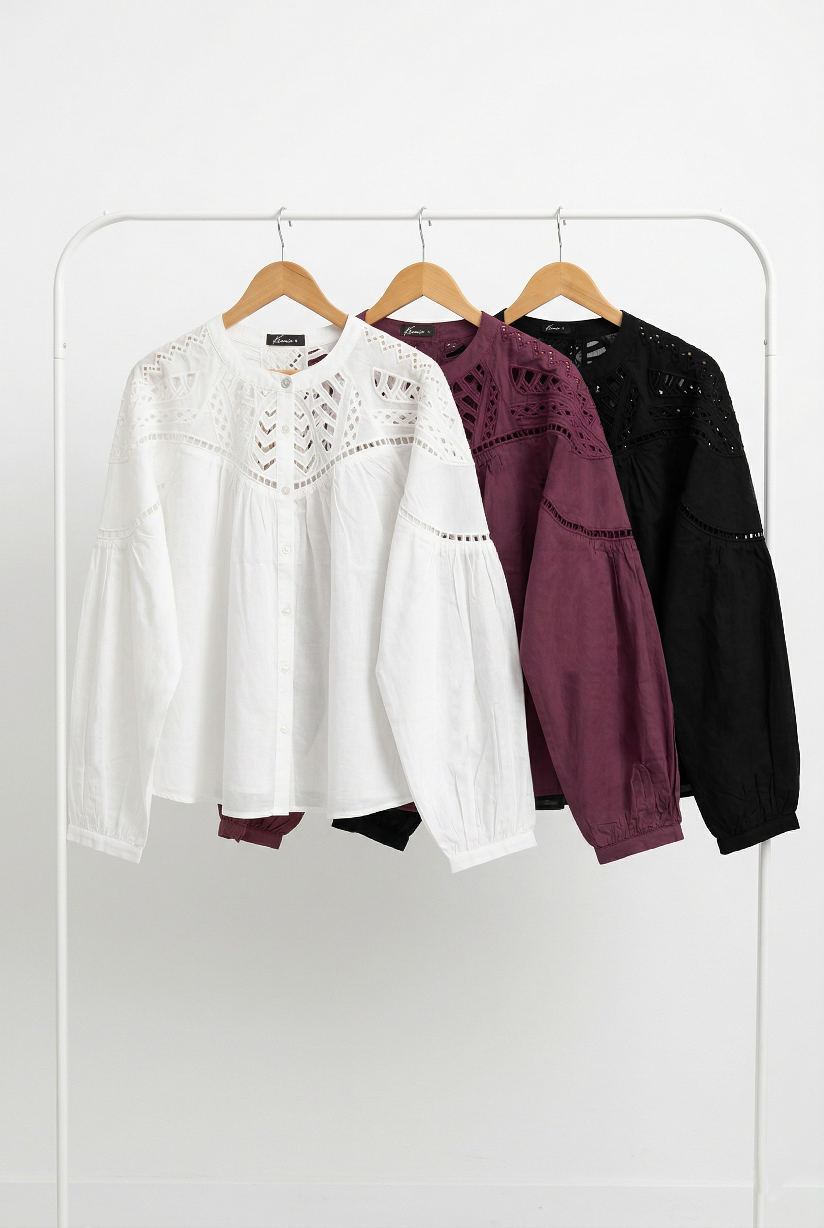 Camisa de mujer importada de calce holgado con largo modular hasta la segunda cadera. Lleva mangas raglán abullonadas con puños con abertura y botón. La prenda se caracteriza por tener recortes en la zona superior de la prenda, los cuales llevan bordado con calados. La terminación del recorte lleva entredos al tono y frunces en bajo recorte. La camisa lleva cuello mao redondo, se concede acceso a la prenda mediante cartera de botones camiseros, con el primer botón de strass diferenciado. La prenda está confeccionada en voile de algodón.