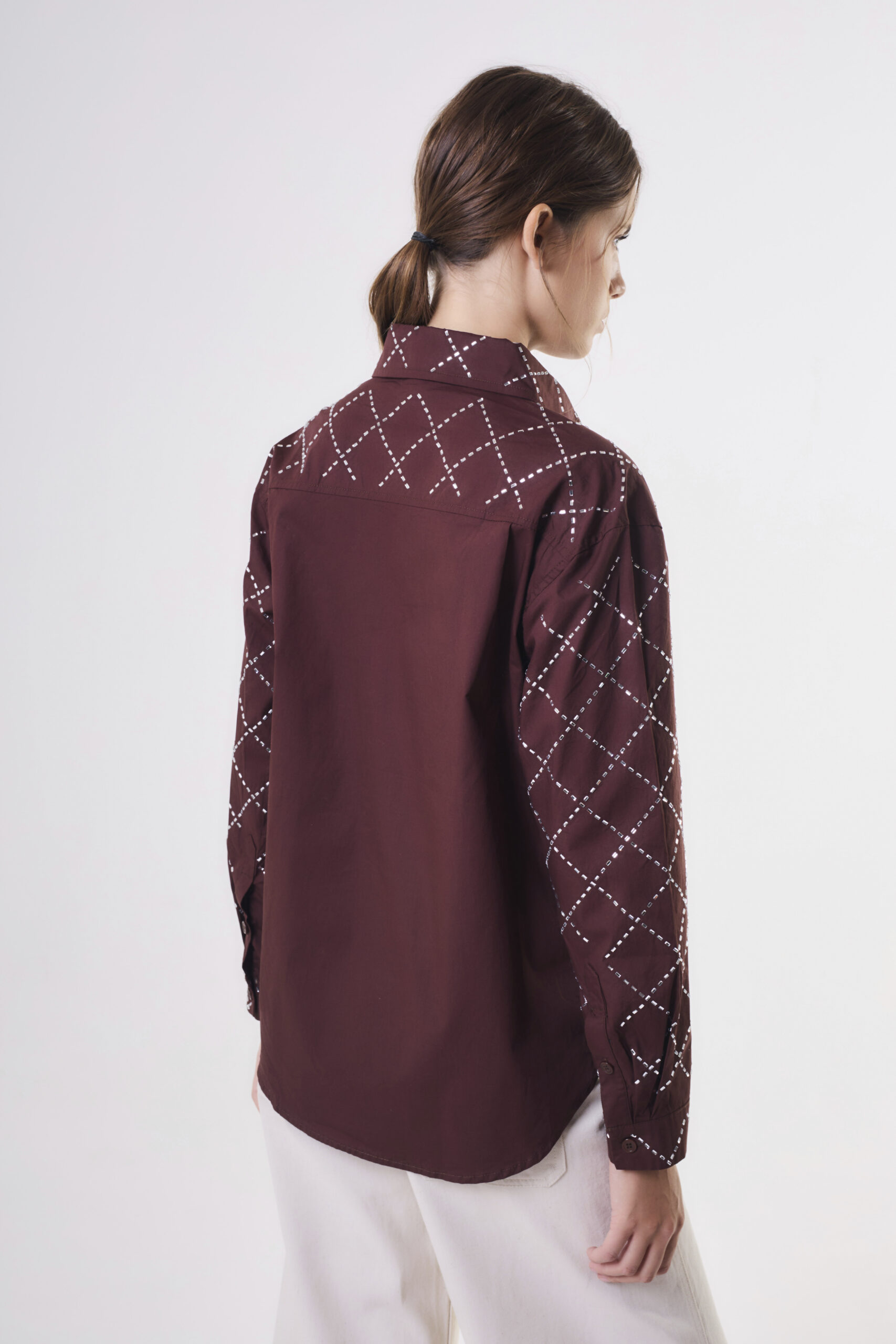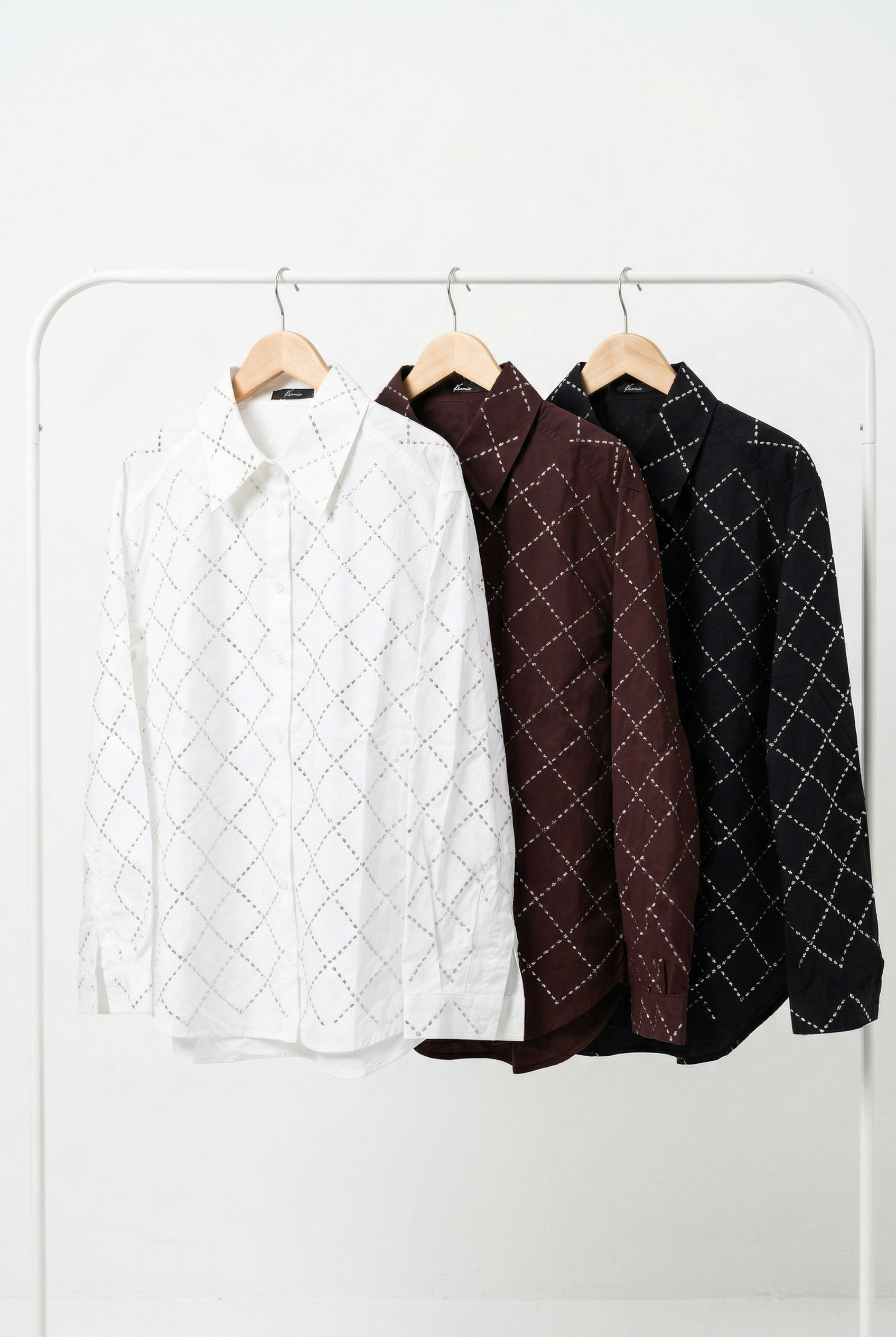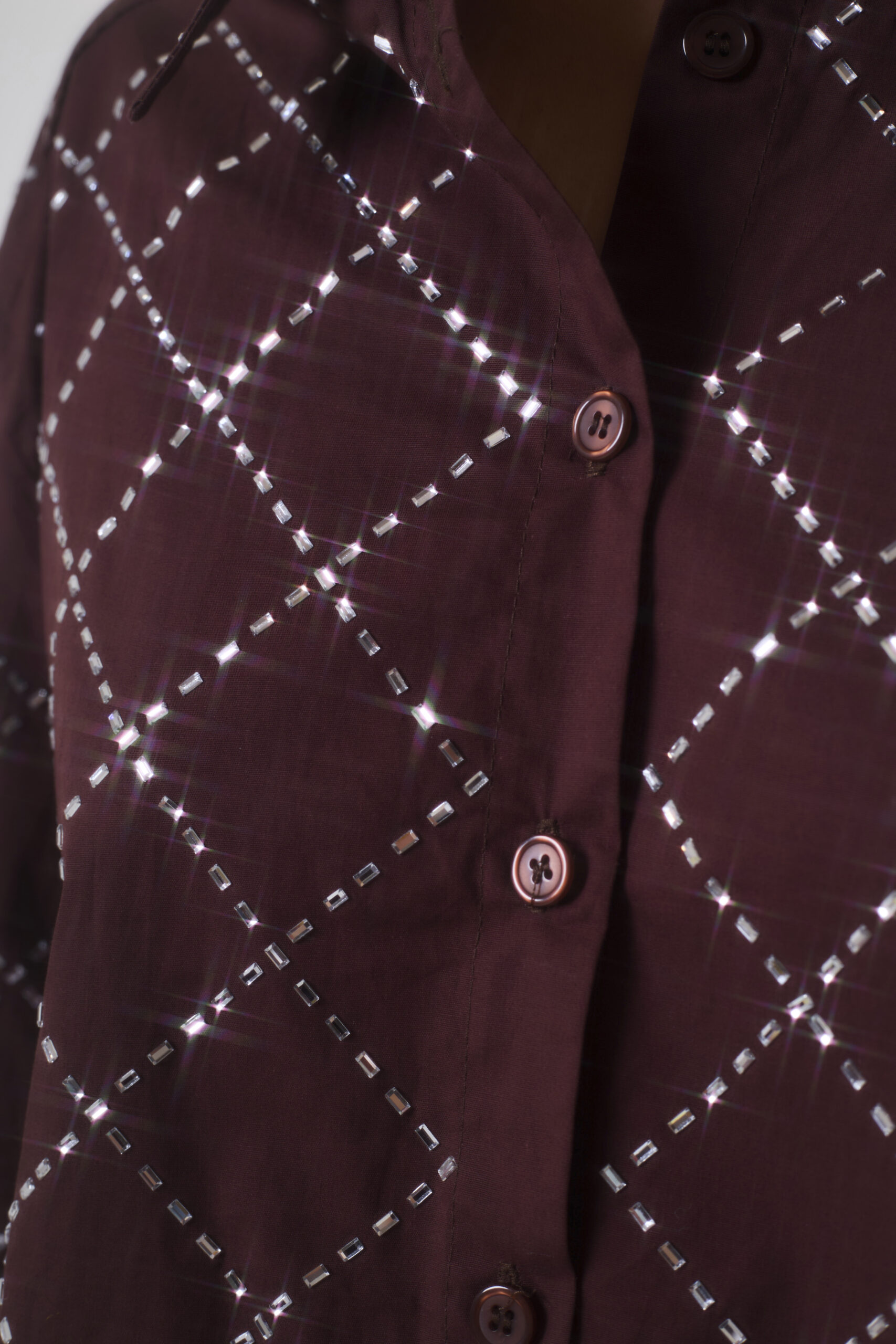 Camisa de mujer importada de calce oversize y costura de hombros ligeramente adelantada. Su largo modular se extiende hasta la segunda cadera, ofreciendo una caída relajada y cómoda .La pieza se distingue por un patrón geométrico de rombos realizado con aplicaciones de hotfix cristal. Este detalle de brillo recorre todo el delantero, el cuello y las mangas, extendiéndose hacia el recorte de la espalda para un acabado integral de lujo. Cuenta con un pie de cuello de estilo clásico y acceso frontal mediante botones al tono, grabados con el logo exclusivo de la marca. La prenda está confeccionada en voile de algodón.