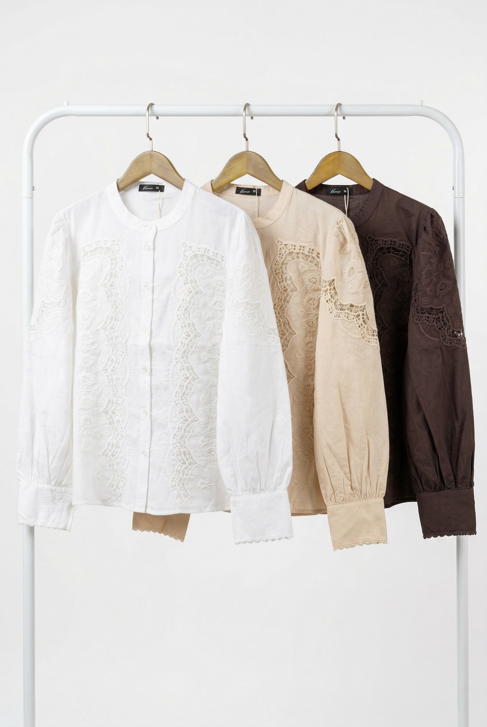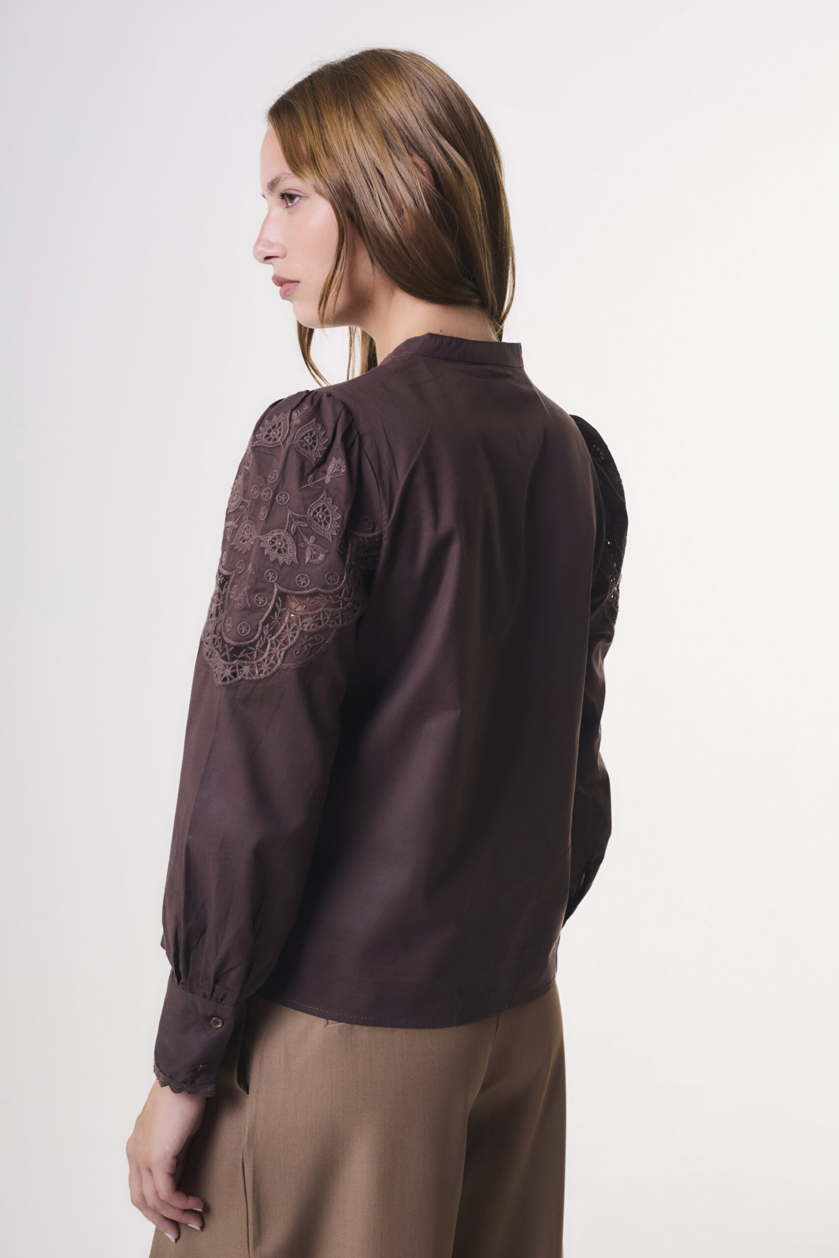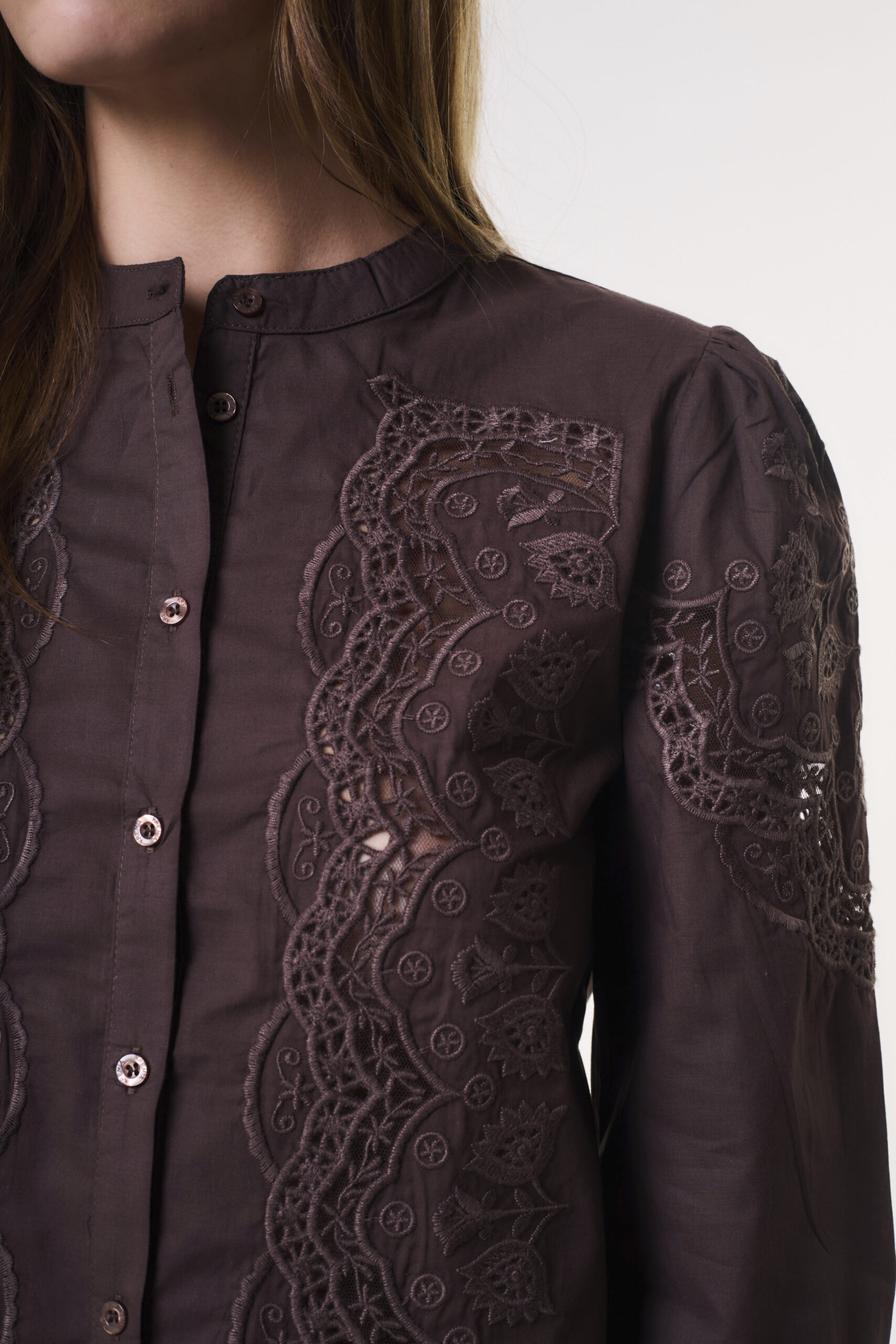 Camisa de mujer importada de calce recto y silueta relajada. Esta prenda se destaca por su exquisito diseño de aplicaciones de encaje calado con motivos florales, dispuestas de forma simétrica en el delantero para crear un patrón vertical.El modelo cuenta con un elegante cuello mao y una cartera central con botones camiseros al tono, grabados con el logo exclusivo de la marca. Sus mangas semi-abullonadas presentan un detalle de bordado calado en la parte superior que aporta una caída fluida.Los puños finalizan con un sutil fruncido y terminaciones bordadas. La camisa está confeccionada en voile de algodón.