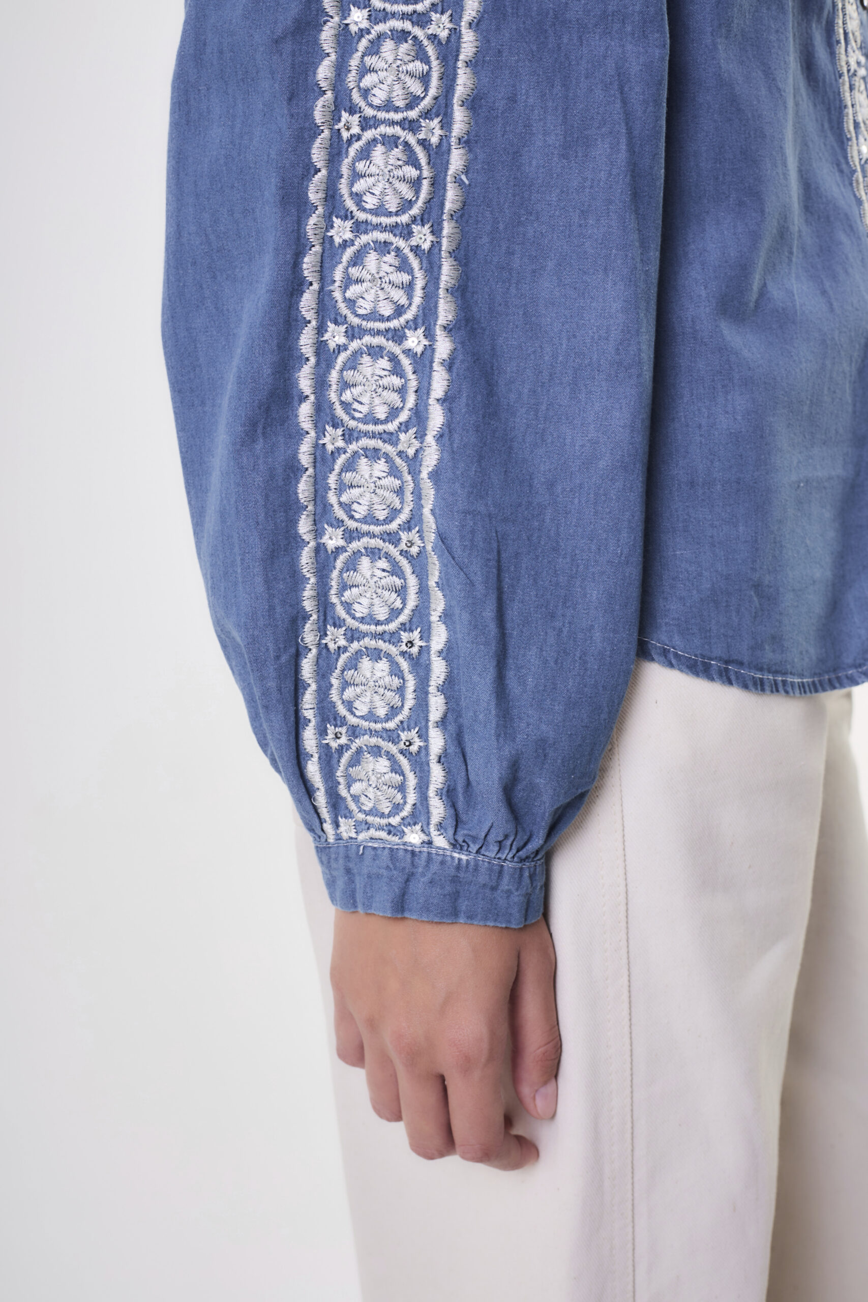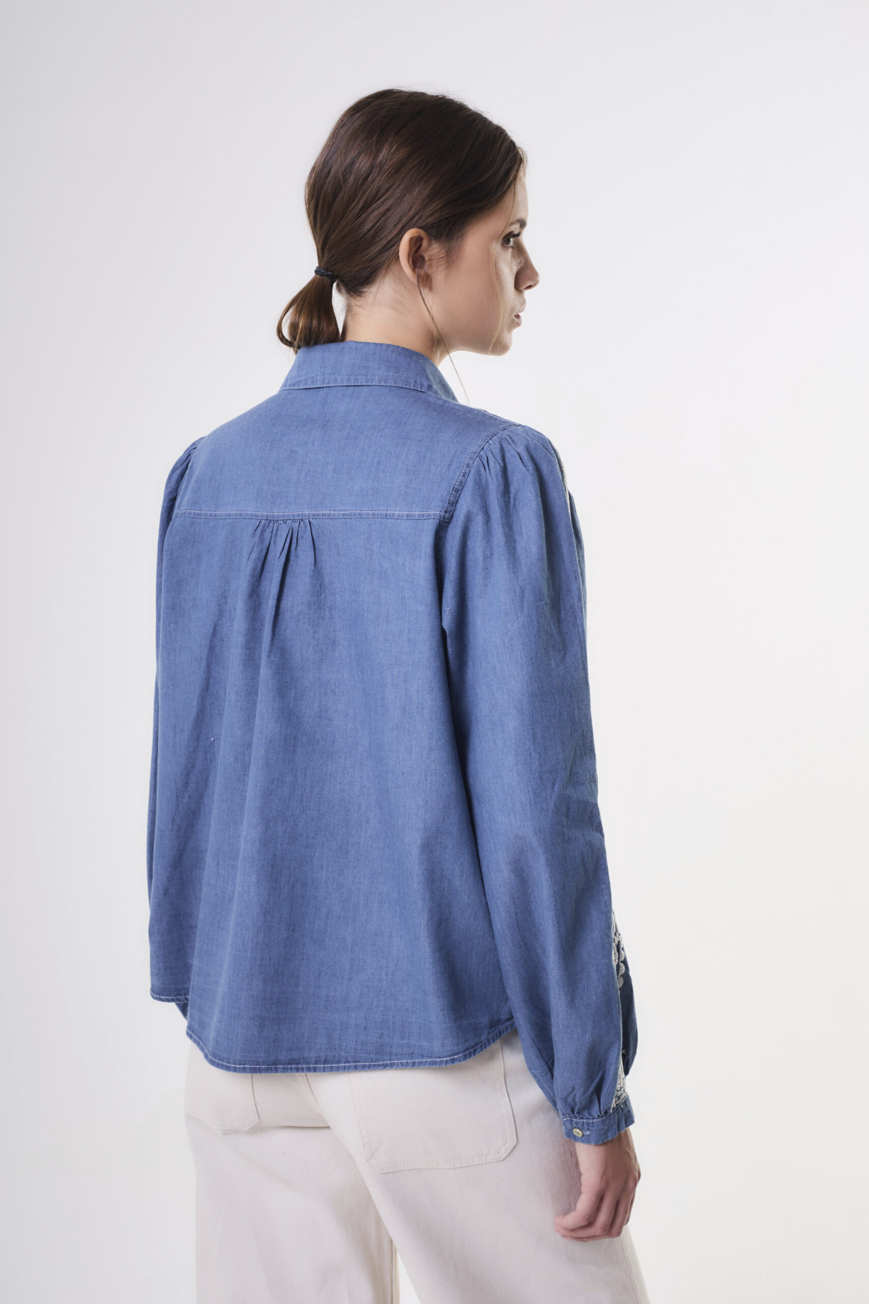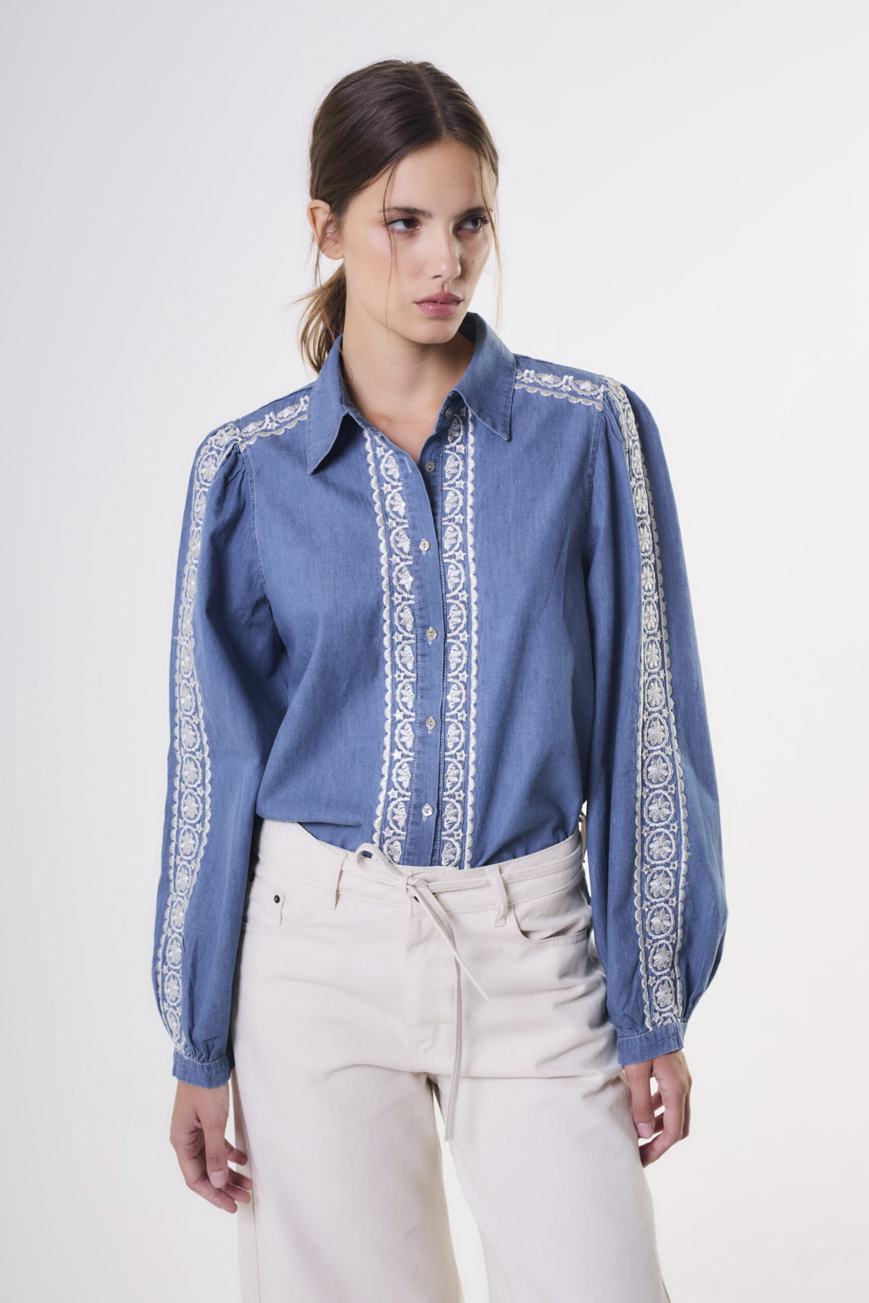 Camisa de mujer importada denim de calce recto y silueta holgada.Largo modular hasta primera cadera. La prenda lleva cuello de pie clásico lo que más destaca son unos detalles de bordados y puntos de lentejuelas creando un patrón floral puestos en vertical que llegan hasta las mangas dando así un efecto de recorte. El acceso es frontal mediante unos botones nacarados. Las mangas son abullonadas con detalles de pliegue y puño. Está confeccionado en género Denim de algodón ligero.