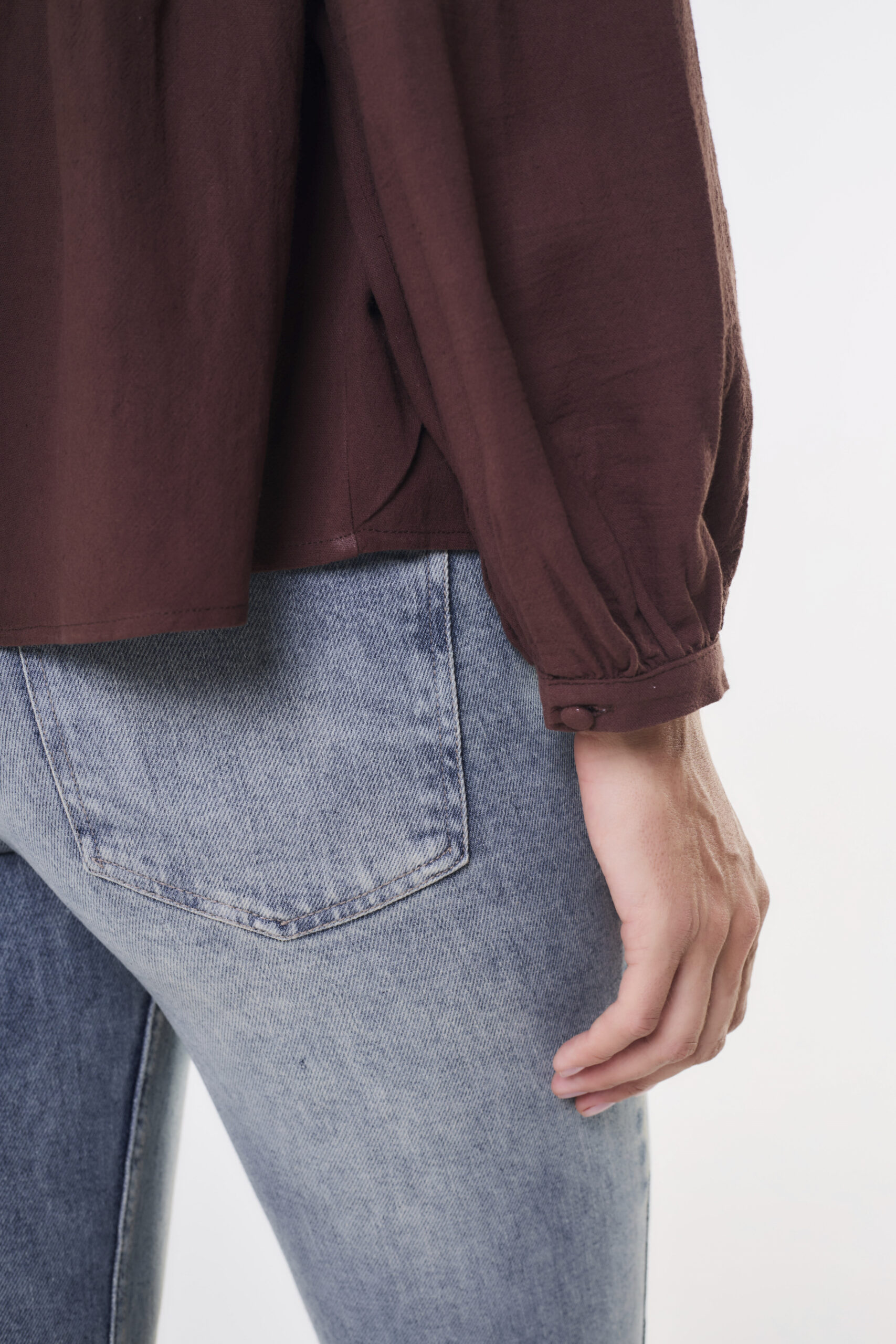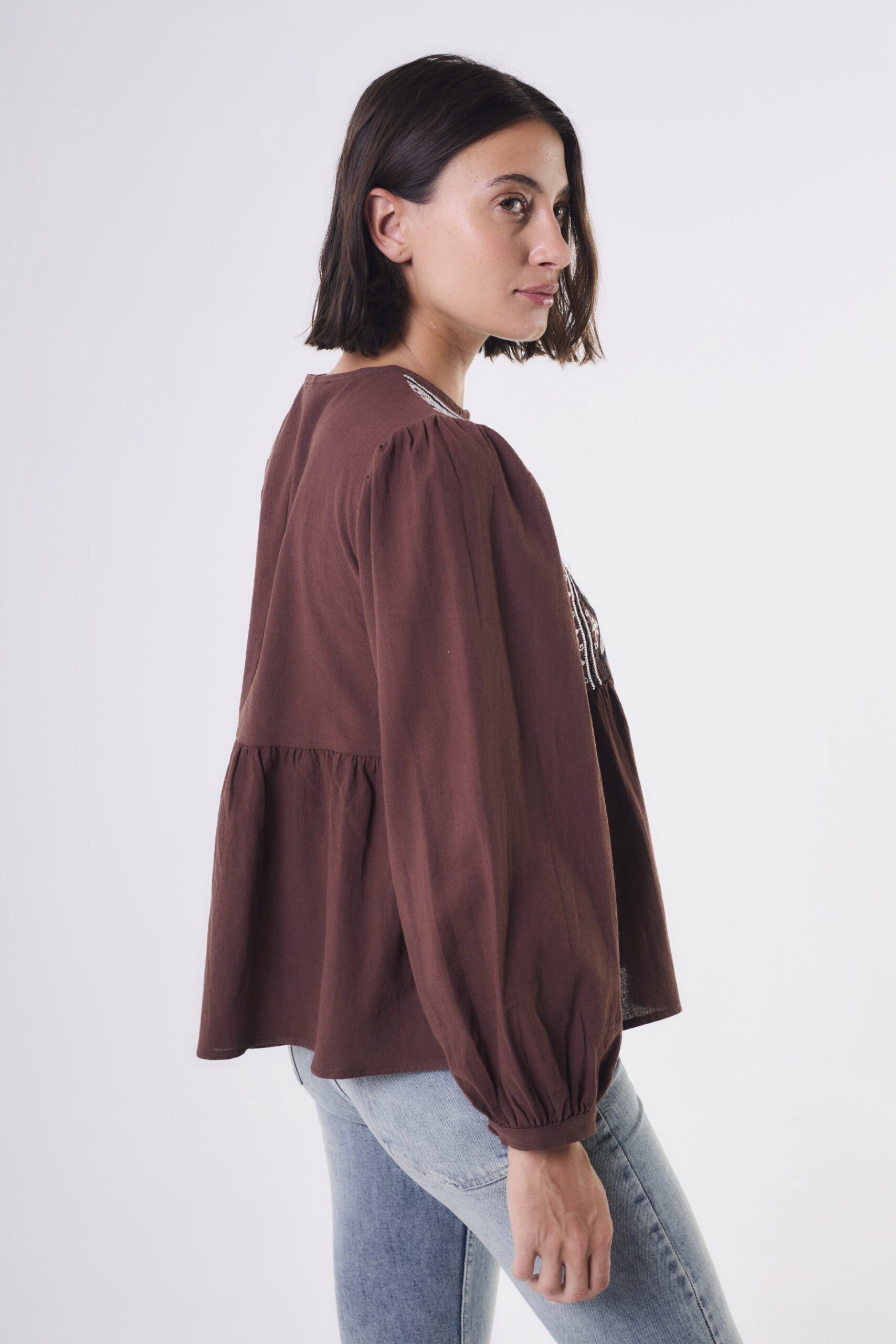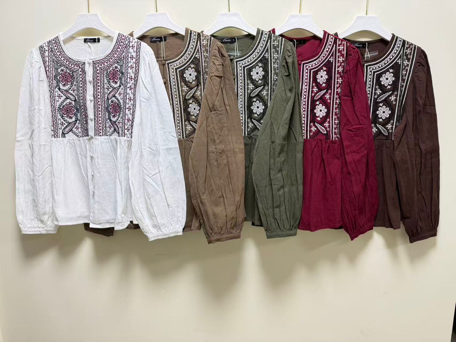 Camisa de mujer importada con botones forrados y bordado en el delantero.