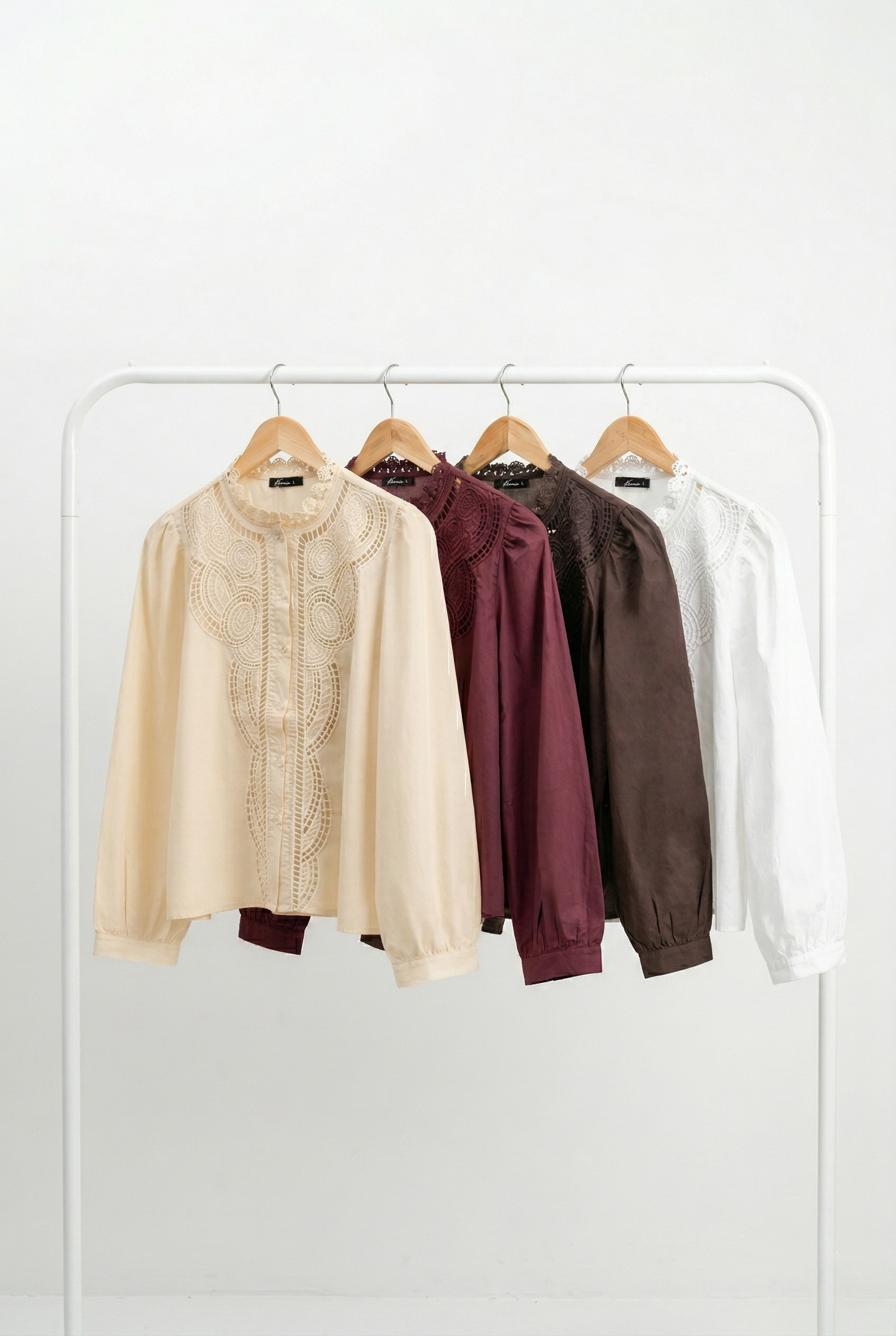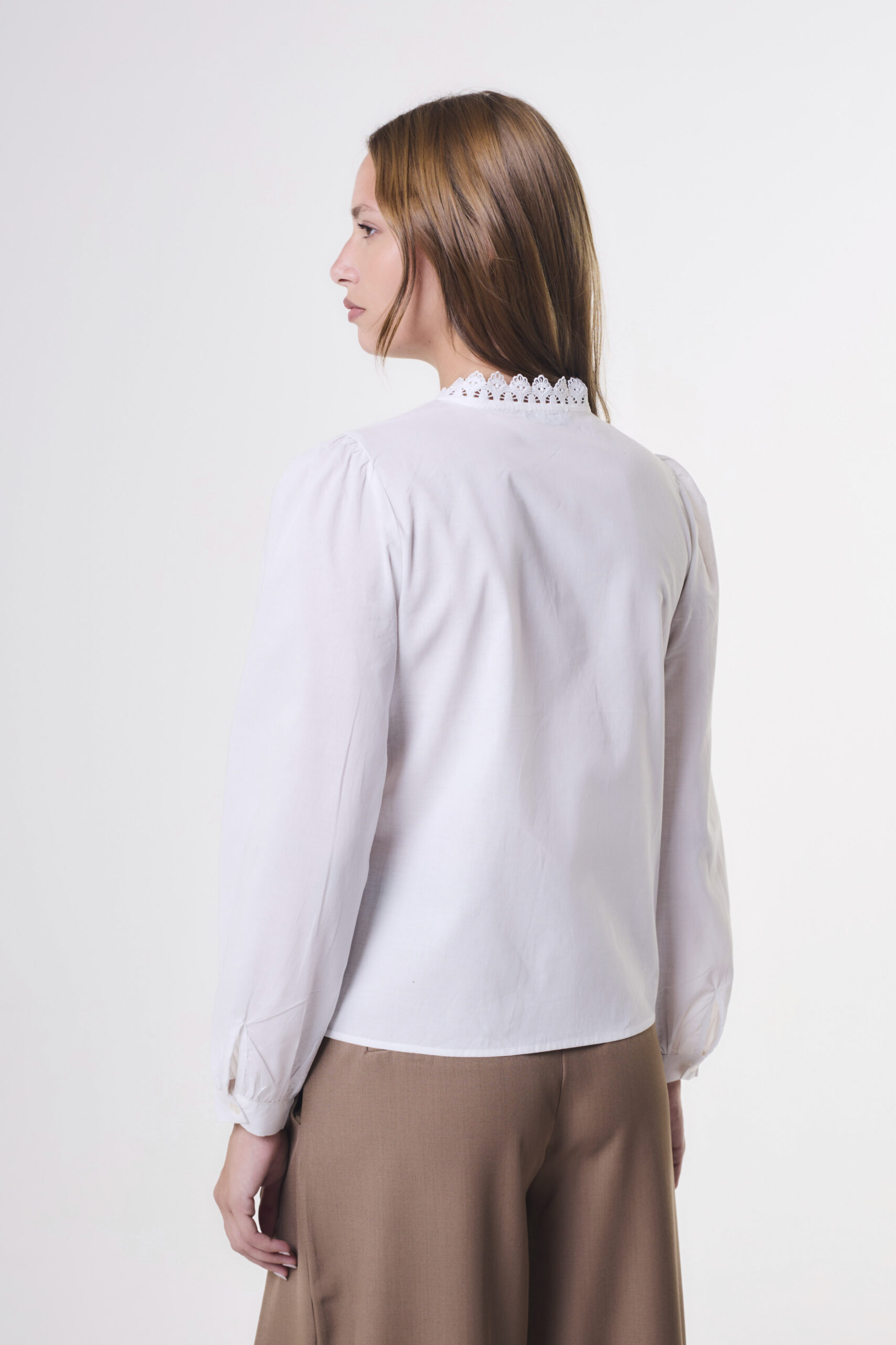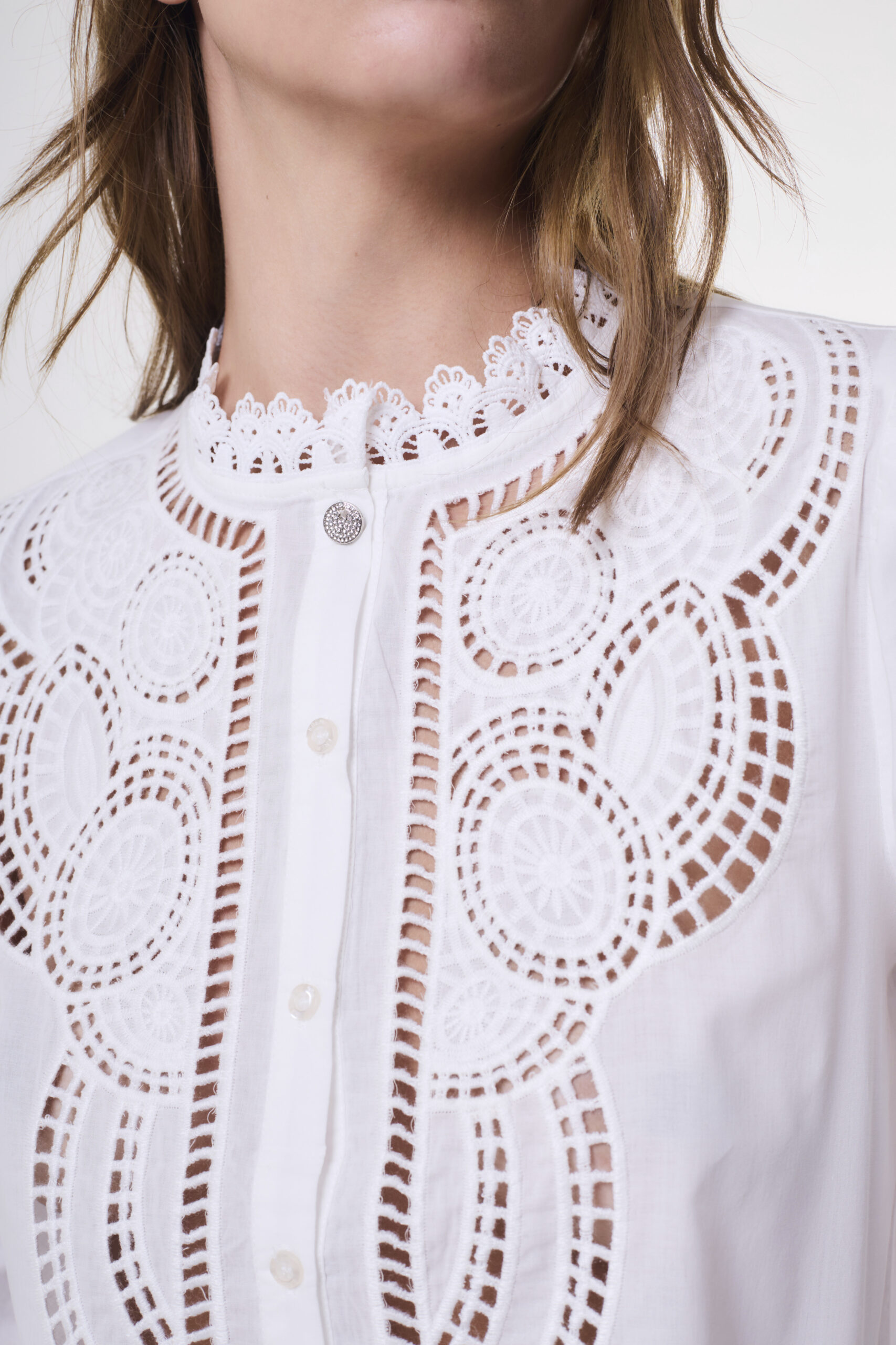 Camisa de mujer importada de calce recto largo modular hasta primera cadera. Lleva mangas semi-abullonadas con puño. Presenta cuello redondo con terminación de puntillas en vuelo motivos florales. La prenda presenta calados con patrones orgánicos y lineal en el delantero. El acceso es frontal mediante unos botones camiseros y un detalle diferencia de botón metálico exclusivo de la marca. Está confeccionado en voile de algodón.