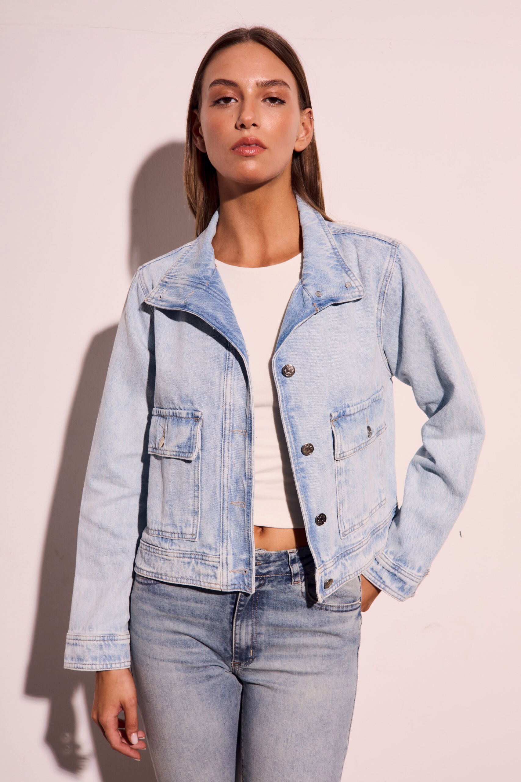 Campera de jean rígida con bolsillos plaqué.