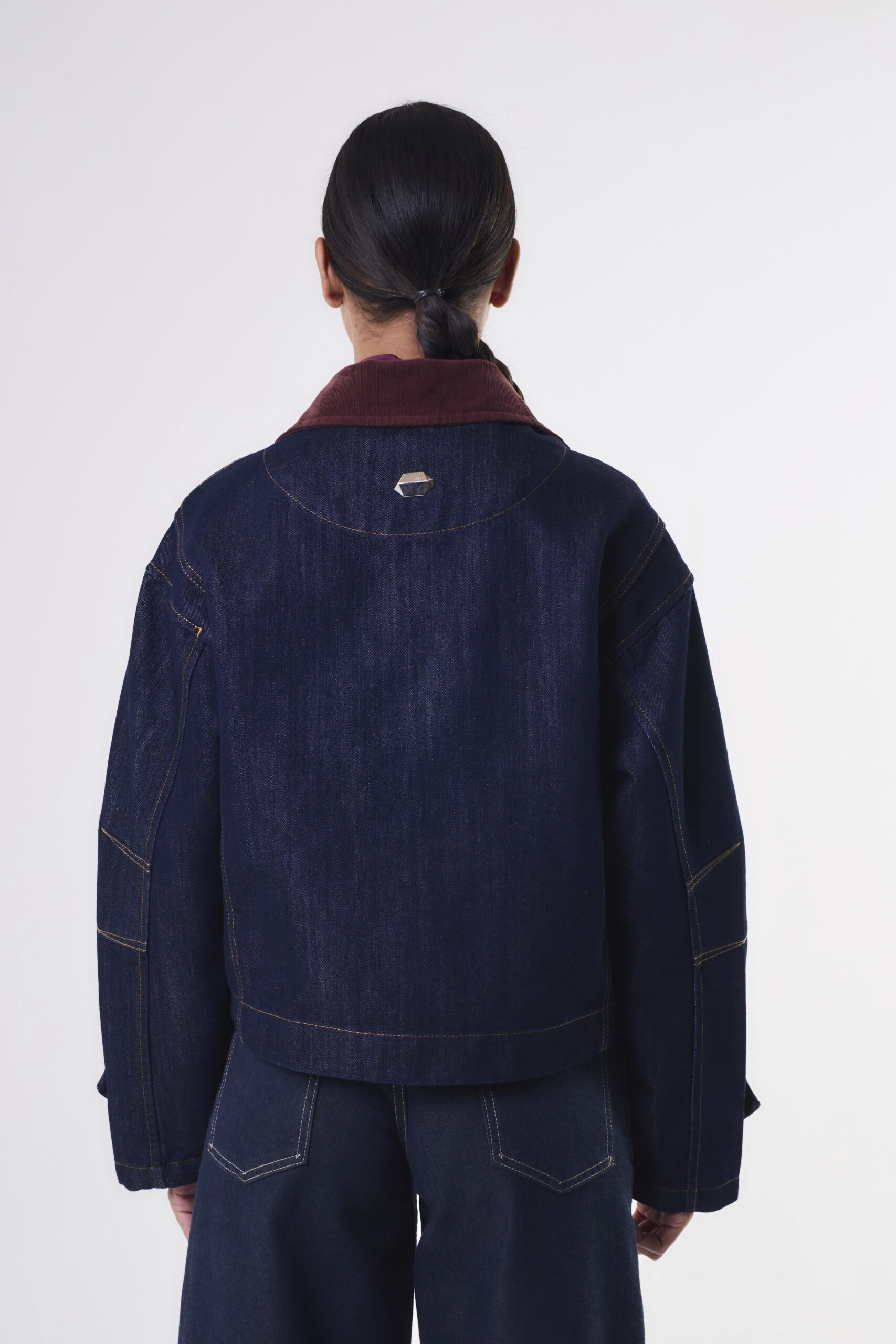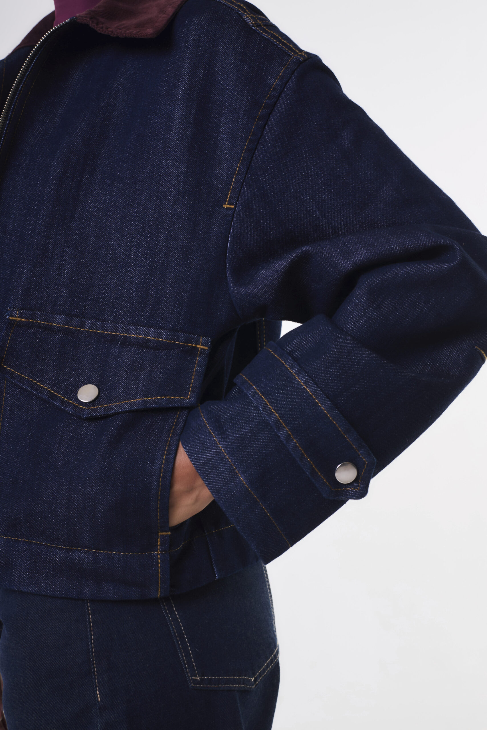 Campera de jean con combinación de corderoy a contratono en cuello.