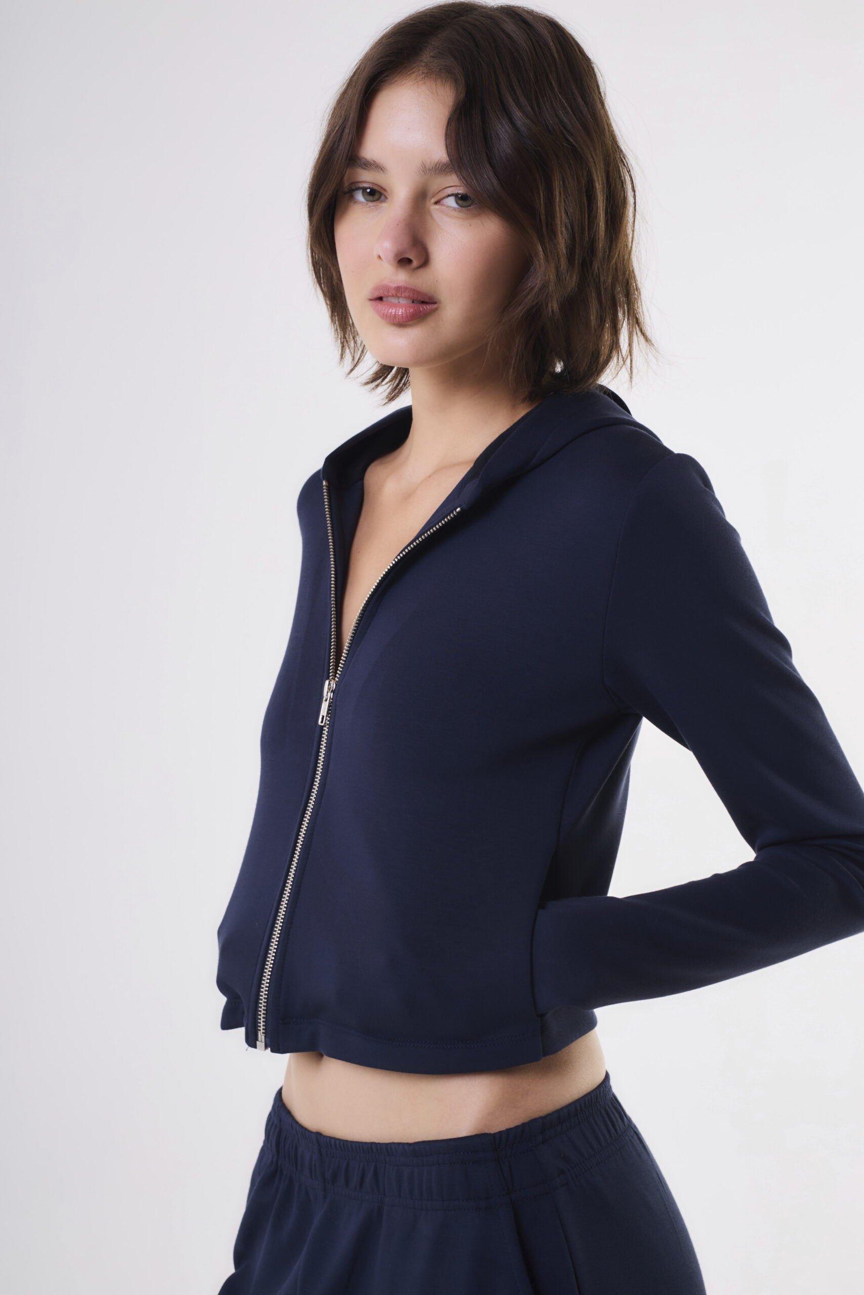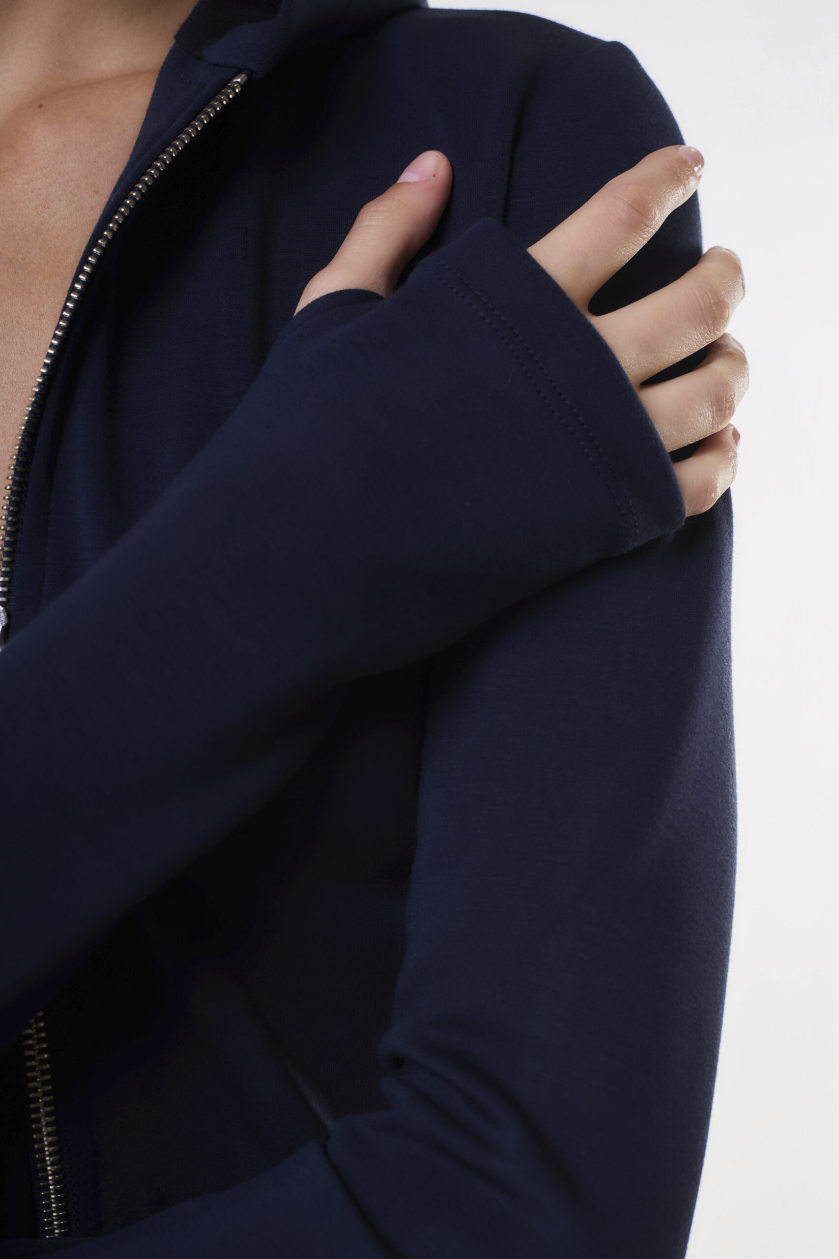Campera de mujer de calce adherente con largo modular hasta primera cadera. Lleva mangas largas con recortes funcionales para el dedo pulgar. Tiene capucha y el acceso a la prenda es mediante cierre metálico. Confeccionada en rústico diferenciado.