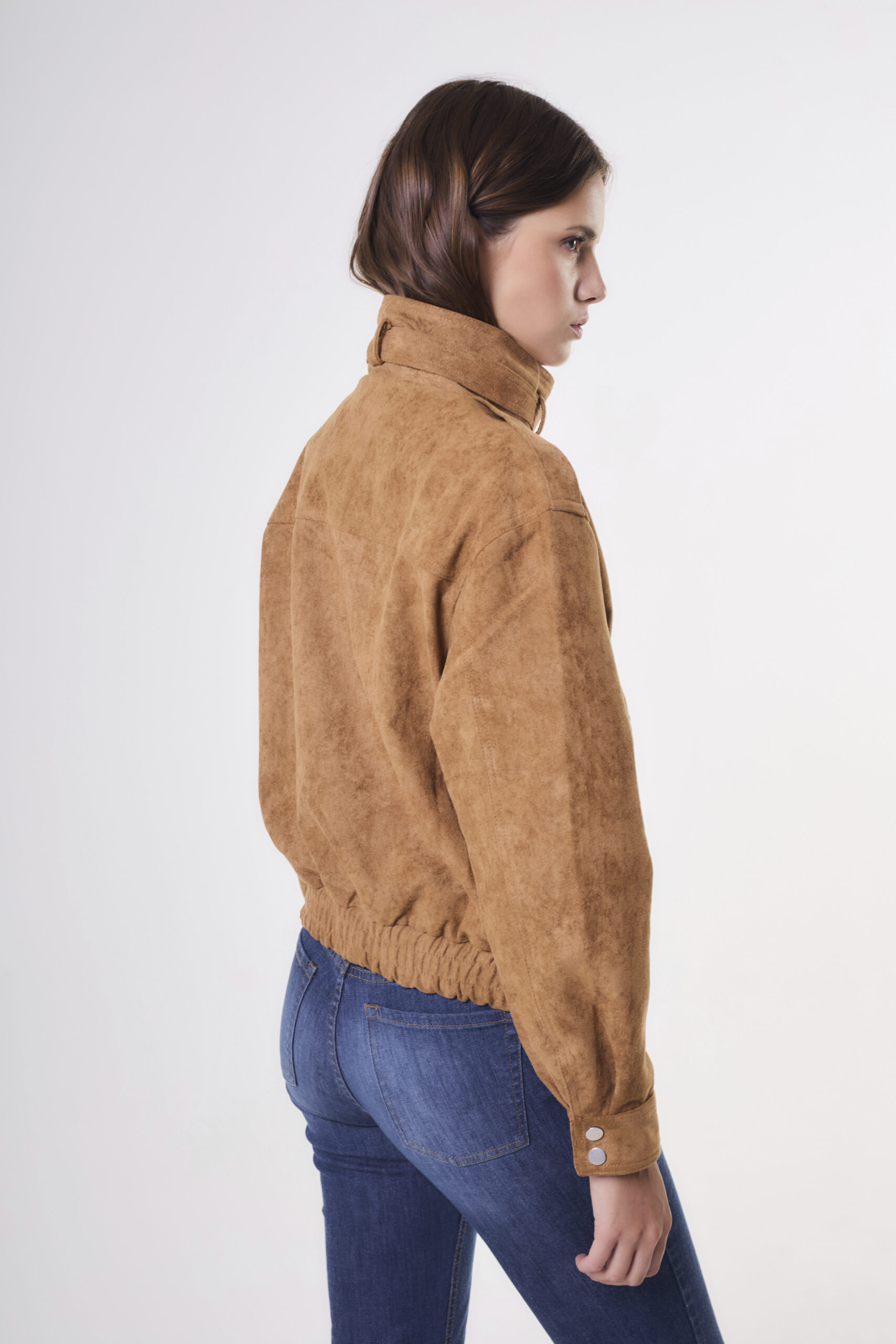 Campera de mujer importada bomber simil cuero gamuzado, con detalle de bolsillos con tapa, con cierre de broches metálicos y bolsillos ojales en los laterales, la prenda tiene acceso por un cierre metálico desmontable pero lleva una solapa que cubre mediante broches metálicos. Además en el cuello tiene el detalle de hebilla con lazo para ajustar. En la cintura lleva elástico. La prenda está forrada con tafeta al tono.