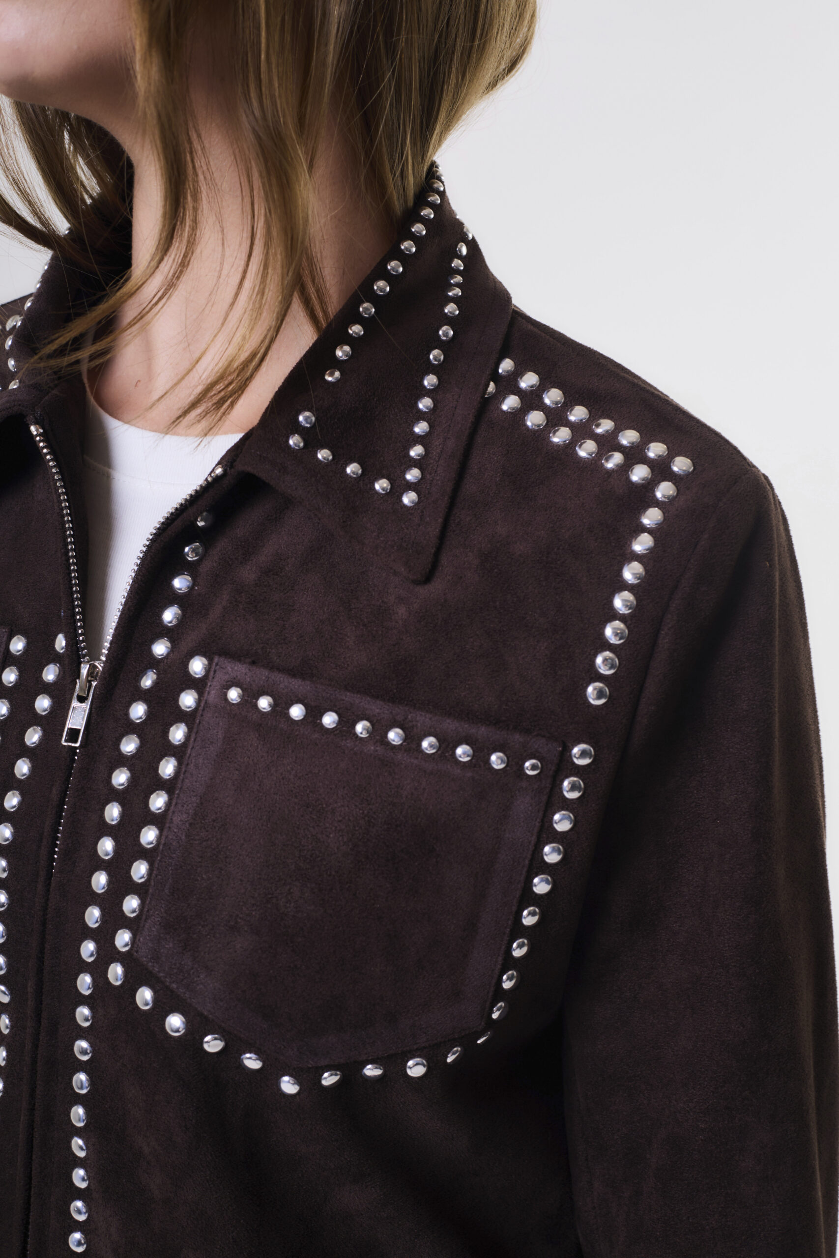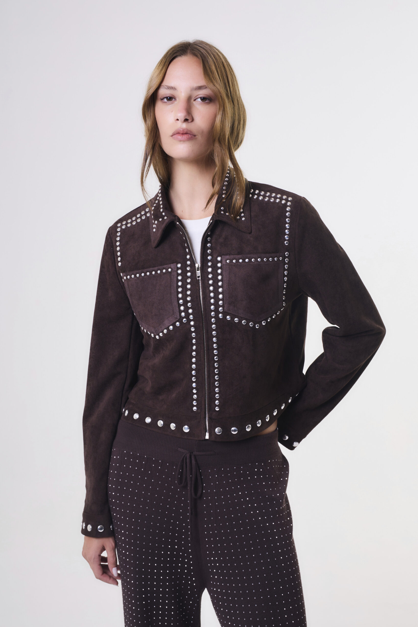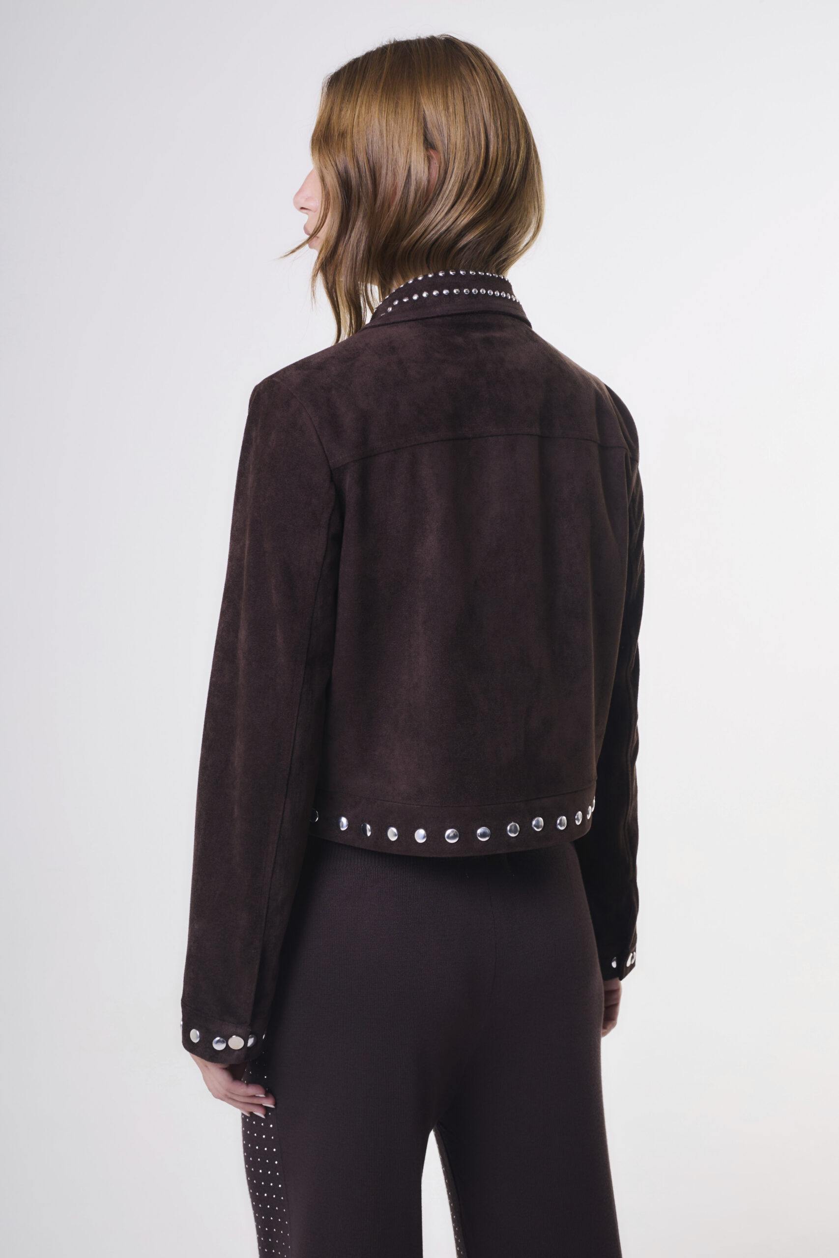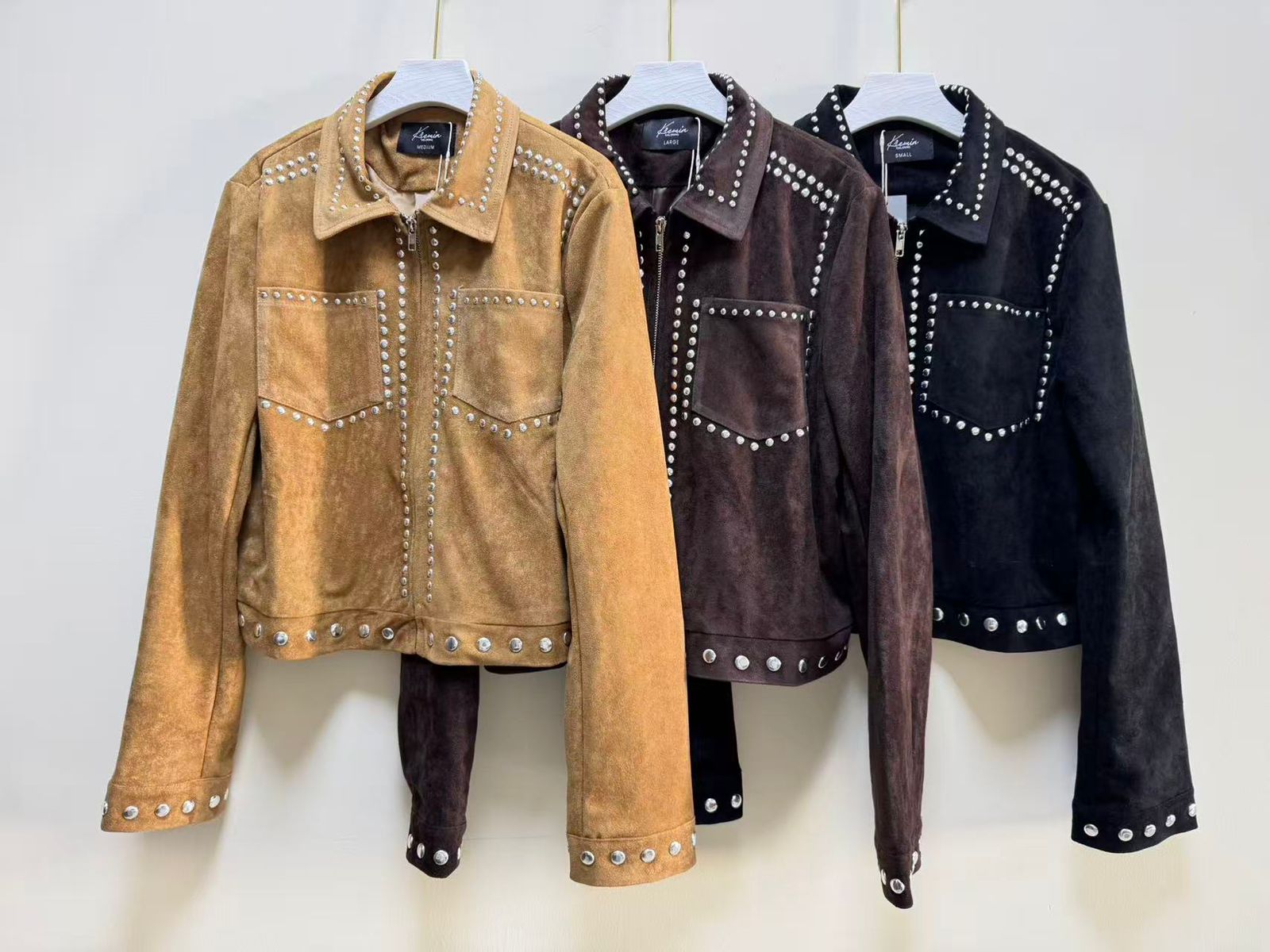 Campera de mujer importada de calce recto largo modular hasta primera cadera con bolsillos en delanteros lleva cuello solapa el acceso es mediante un cierre metálico en el delantero y acompañado unos broches metálicos en puños, detalles que destacan son unos hotfix color níquel en todo el contorno de la prenda incluyendo en ruedos tanto como en parte inferior y puños haciendo contraste de tamaños. Está confeccionada con tela gamuza en el interior lleva forro de tafeta al tono.