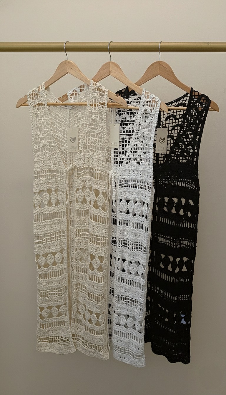 Tejido tipo cardigan confeccionado en tejido red con tramados varios. Es de calce holgado, escote en V y largo modular midi. Acceso mediante lazo en escote.