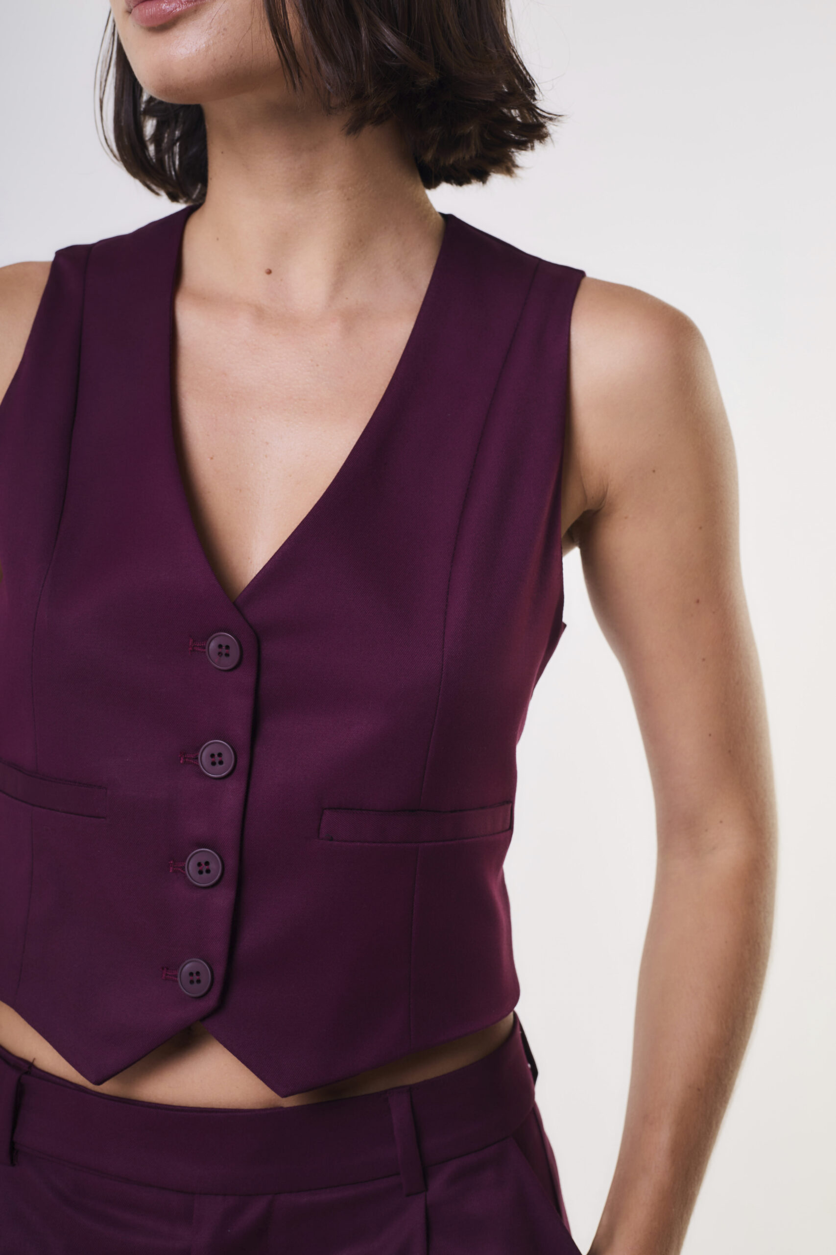 Chaleco sastrero con pinzaas y detalle de bolsillo ojal en el delantero.