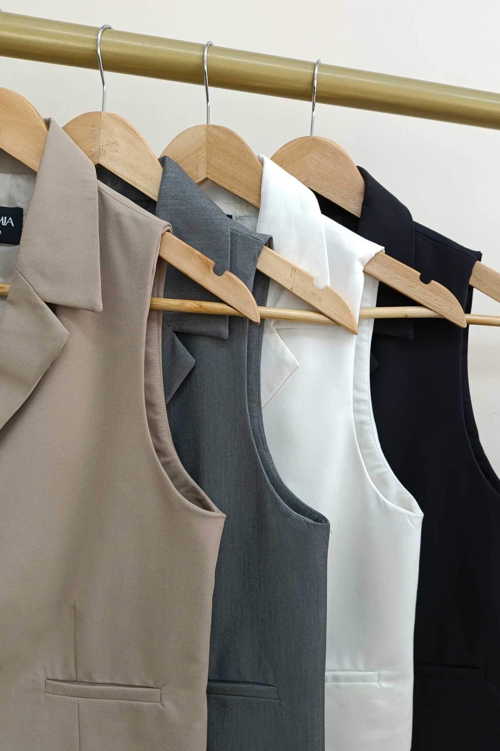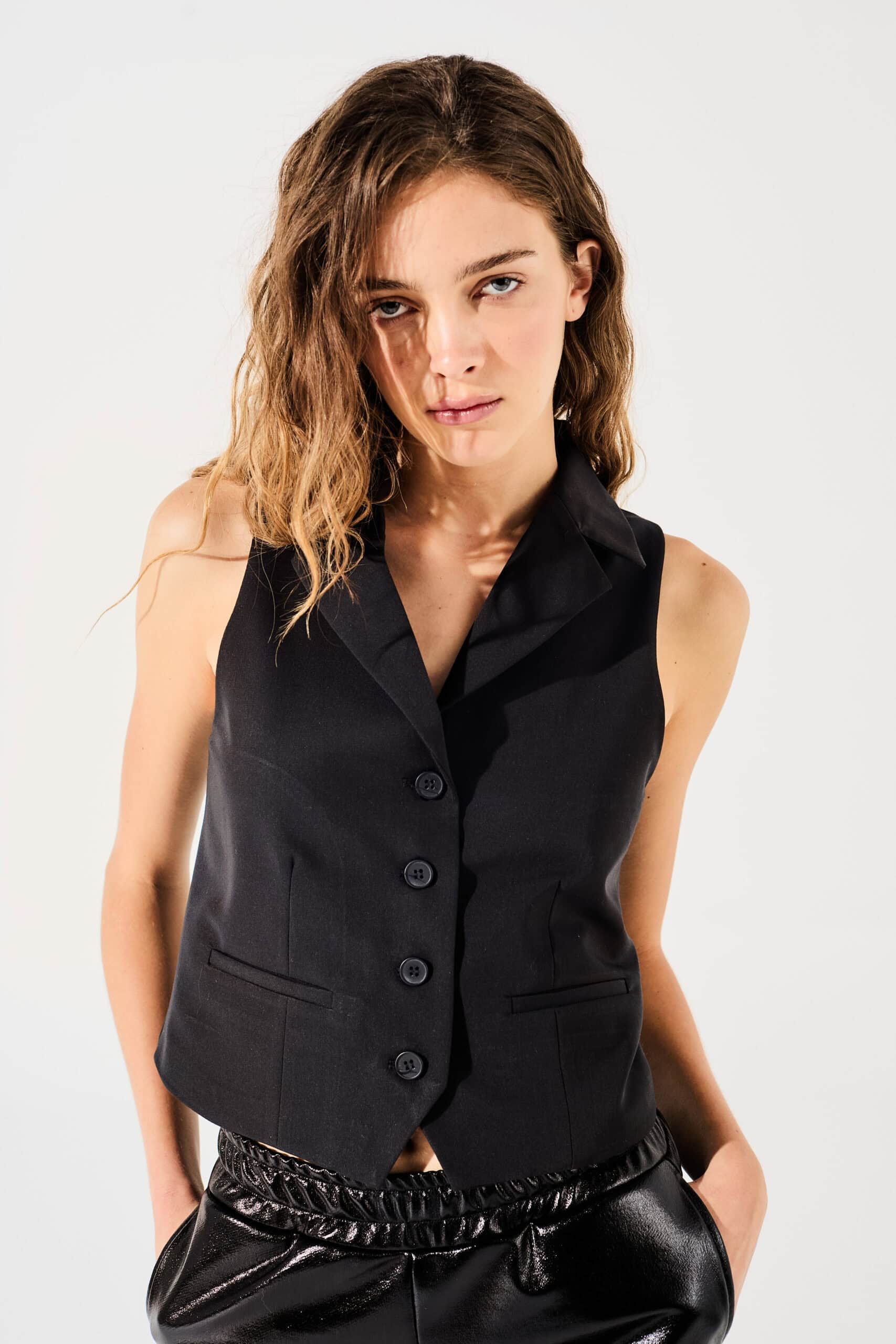 Chaleco de mujer corto de cuatro botones con cuello y solapa. Bolsillos ojal fantasía, está confeccionado en tela sastrera y forrado completamente con tafeta.
