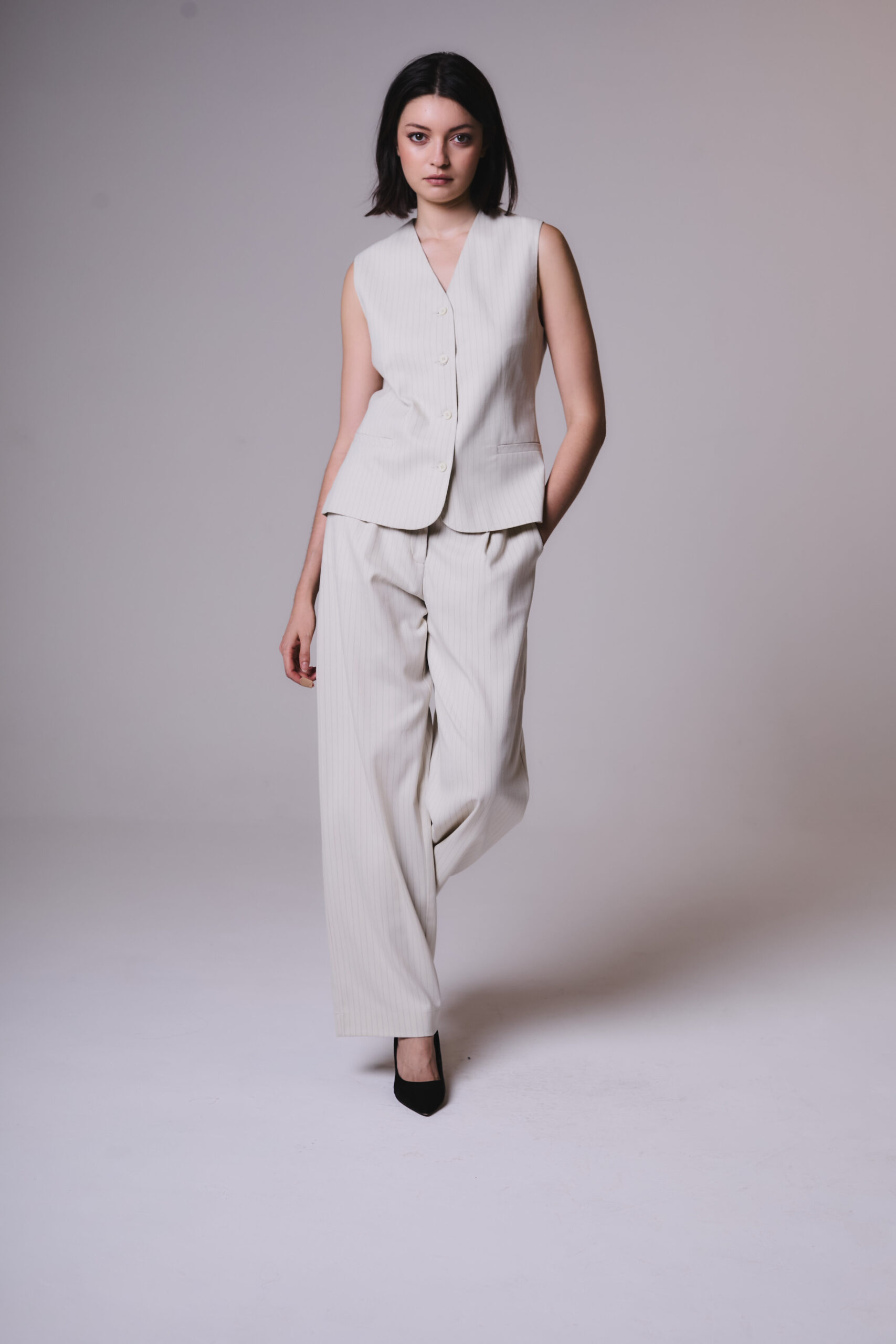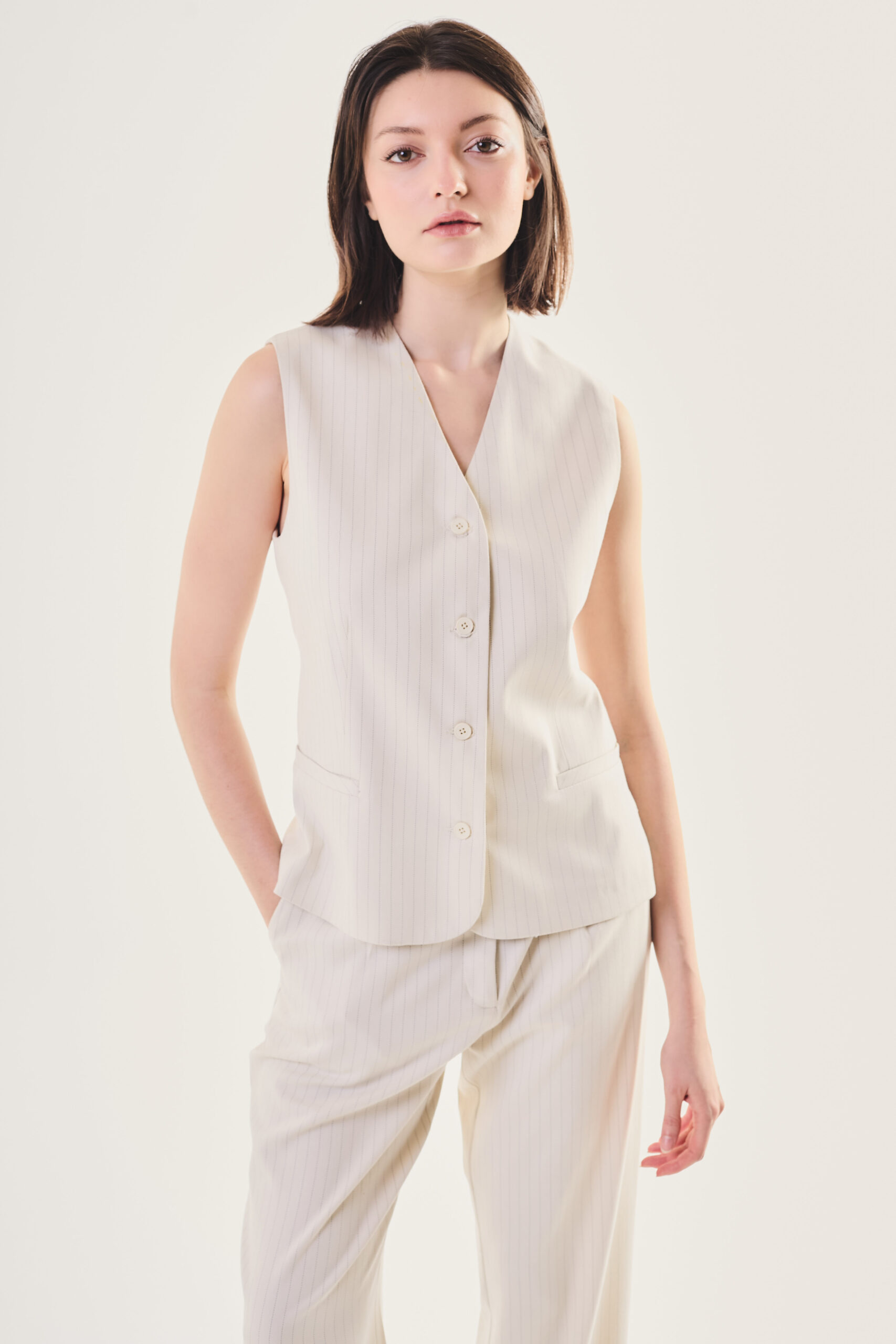 Chaleco de mujer sastrero con bolsillos ojales y accesos con 4 botones, hecho en sastrero rayado forrado con tafeta.