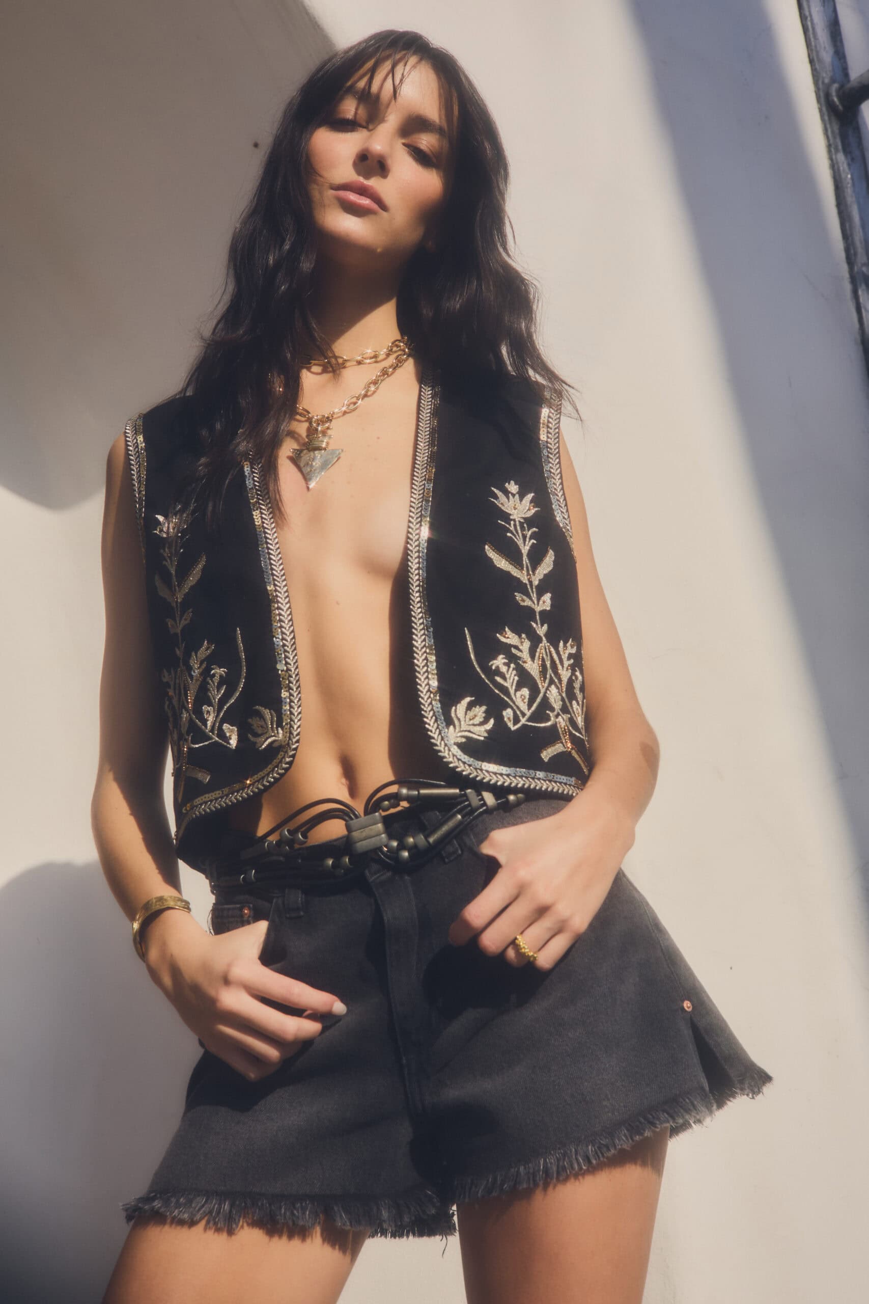 Chaleco importado de mujer estilo boho chic de calce recto abierto. Lleva bordado en hilo lúrex y lentejuelas foradas que recorren todas las terminaciones de la prenda. Al igual que un bordado en dibujo de flor realizado con hilo lúrex y detalles con lentejulas y mostacillas. Largo modular hasta primera cadera. Confeccionado en lino, forrado en voile.