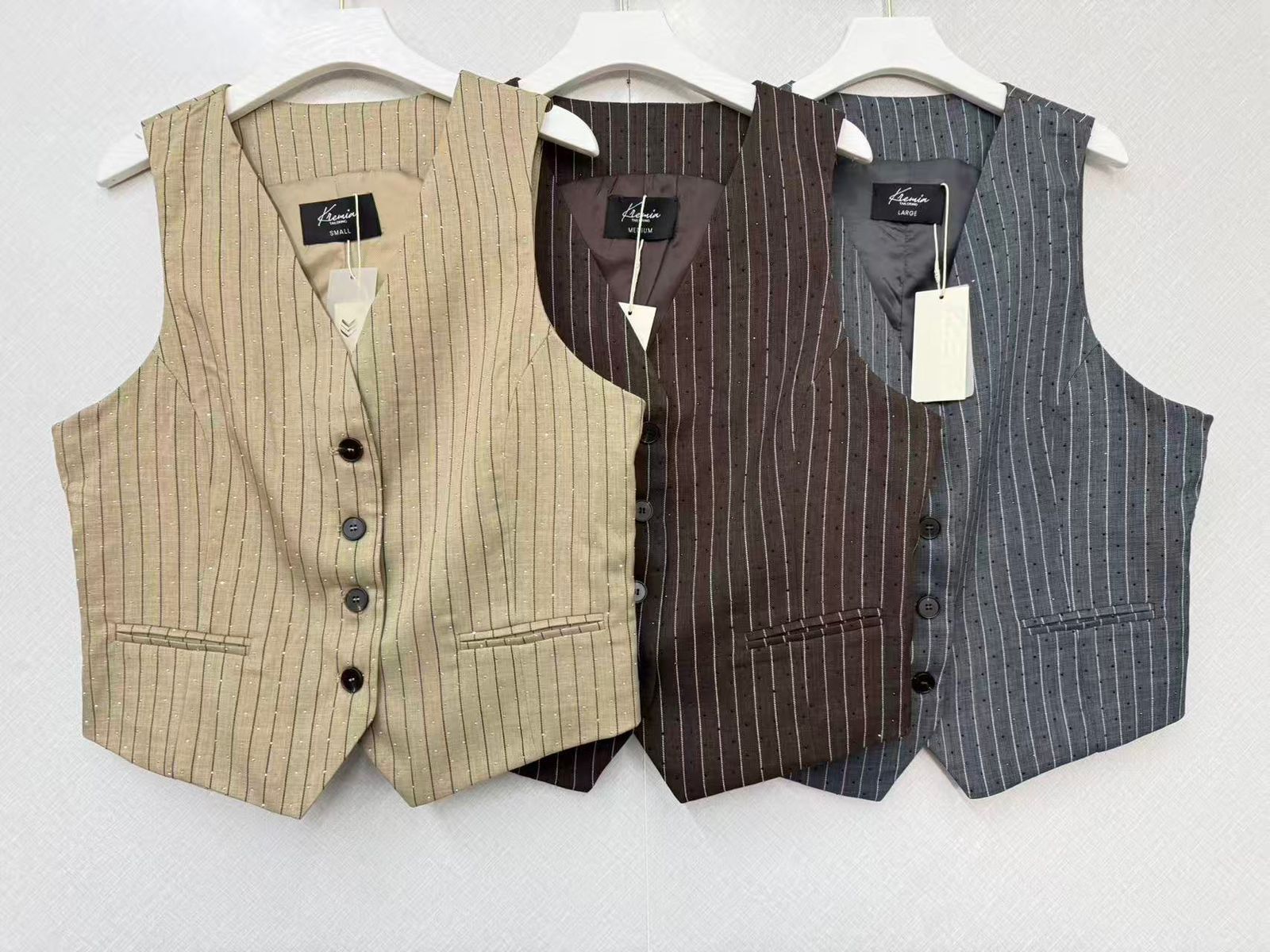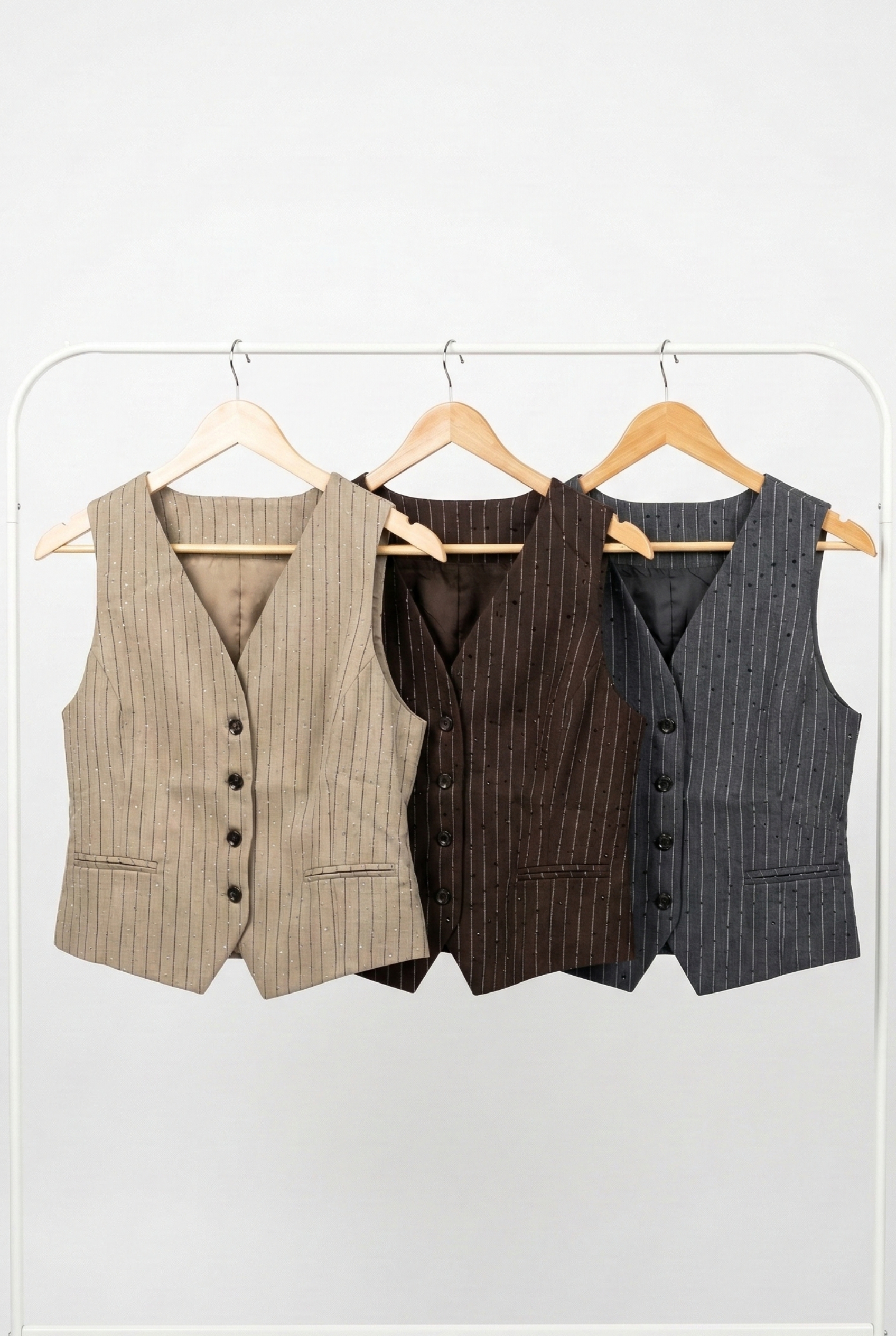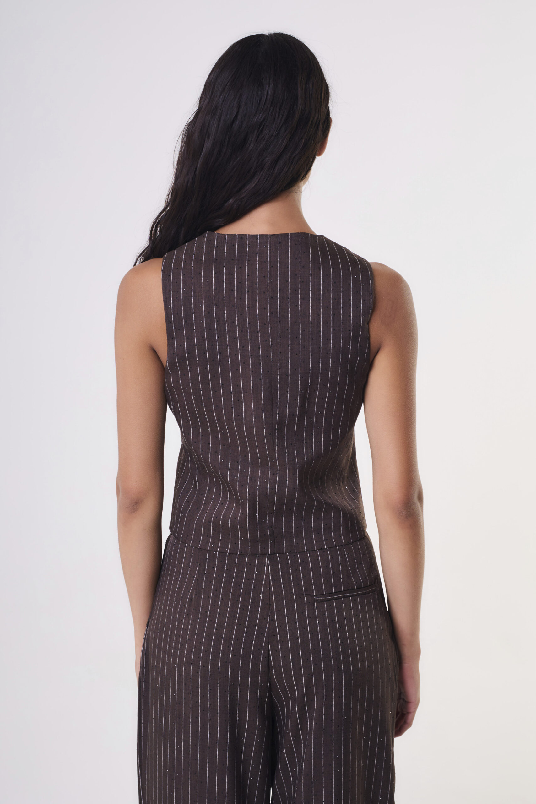 Chaleco importado confeccionado en género sastrero rayado con hotfix facetados al tono.