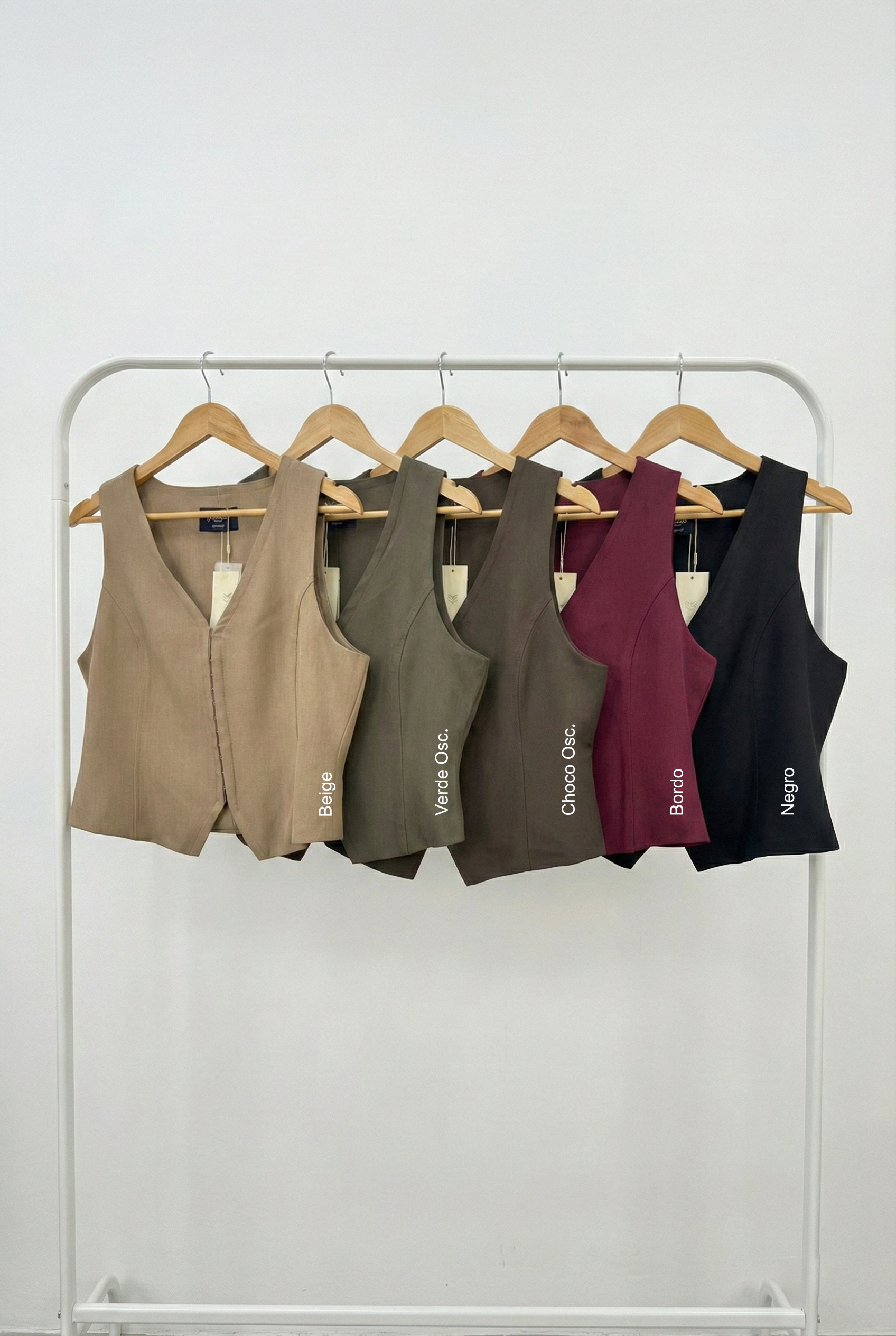 Chaleco de mujer importada de calce adherente con largo modular hasta la primera cadera. Además, posee escote en V y pinzas de entalle dior. La prenda se caracteriza por su acceso, el cual es mediante una cinta corsetera en el recorrido del delantero. El chaleco está confeccionado en género sastrero y está completamente forrado con tafeta.