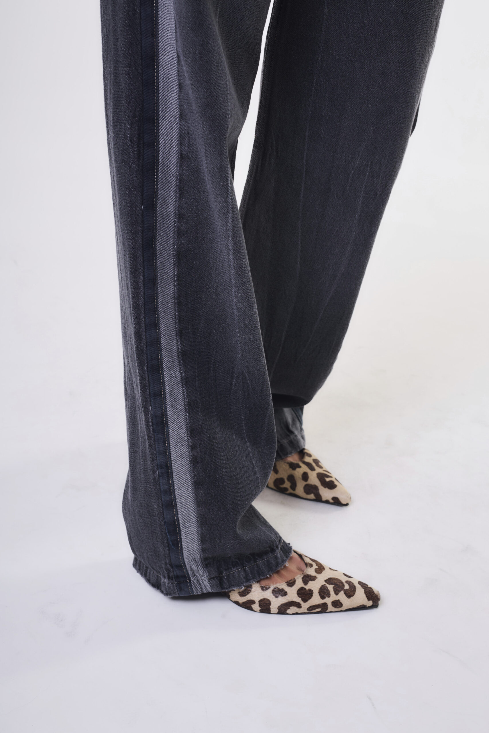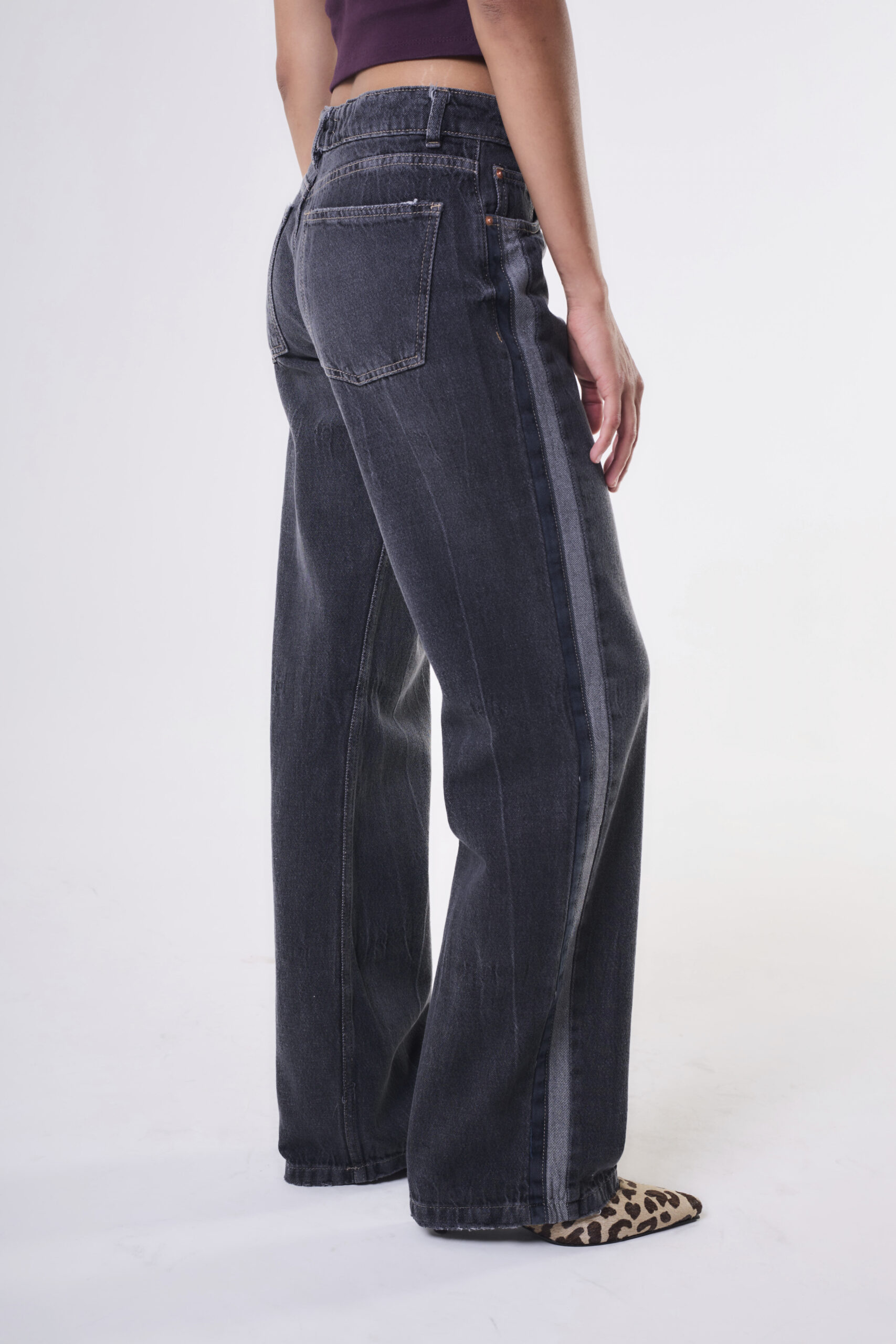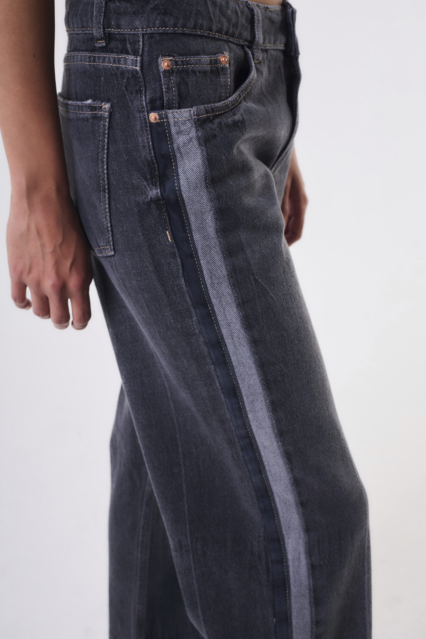 Jean tiro medio rígido con tiras laterales.