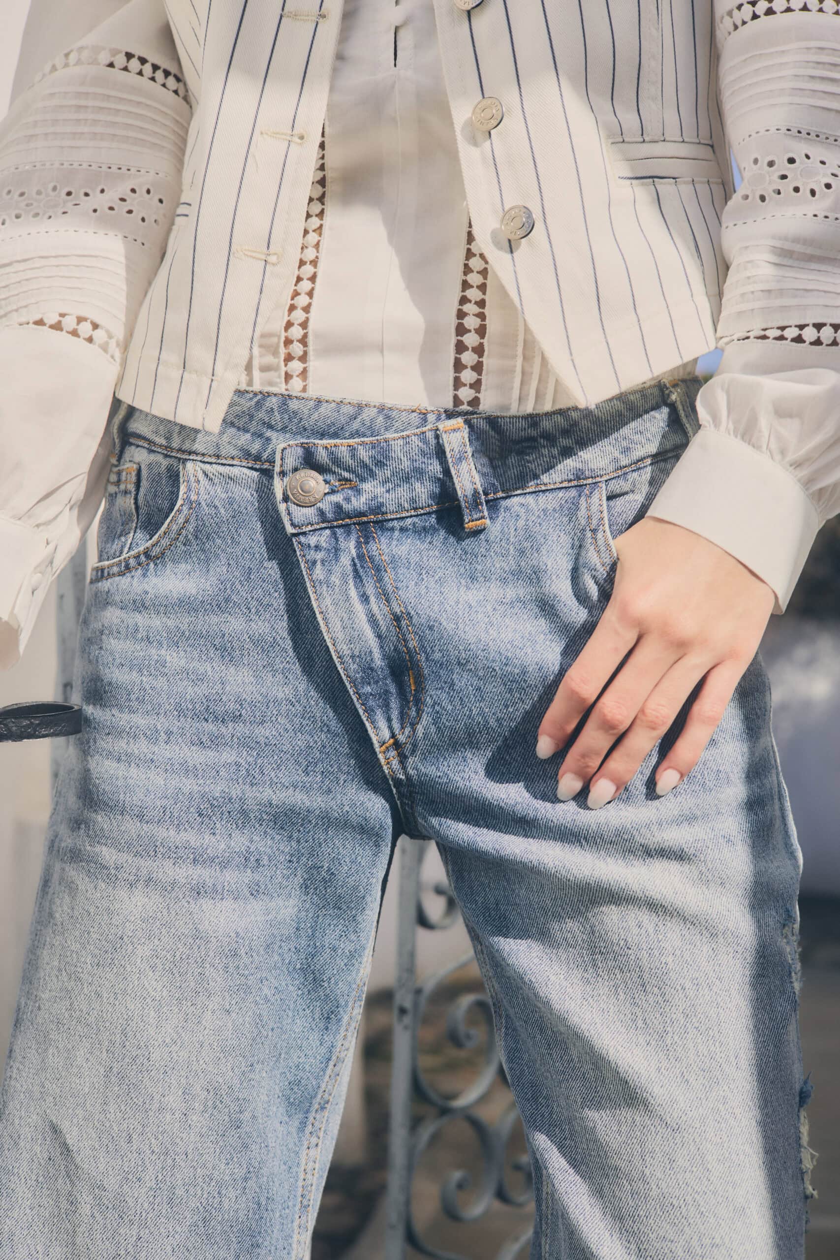 Jean de mujer de calce recto tiro medio con cartera irregular, un botón personalizados a la vista, un botón de pasta cristal interno, badana personalizada y cierre YKK. La tela es importada de excelente calidad.