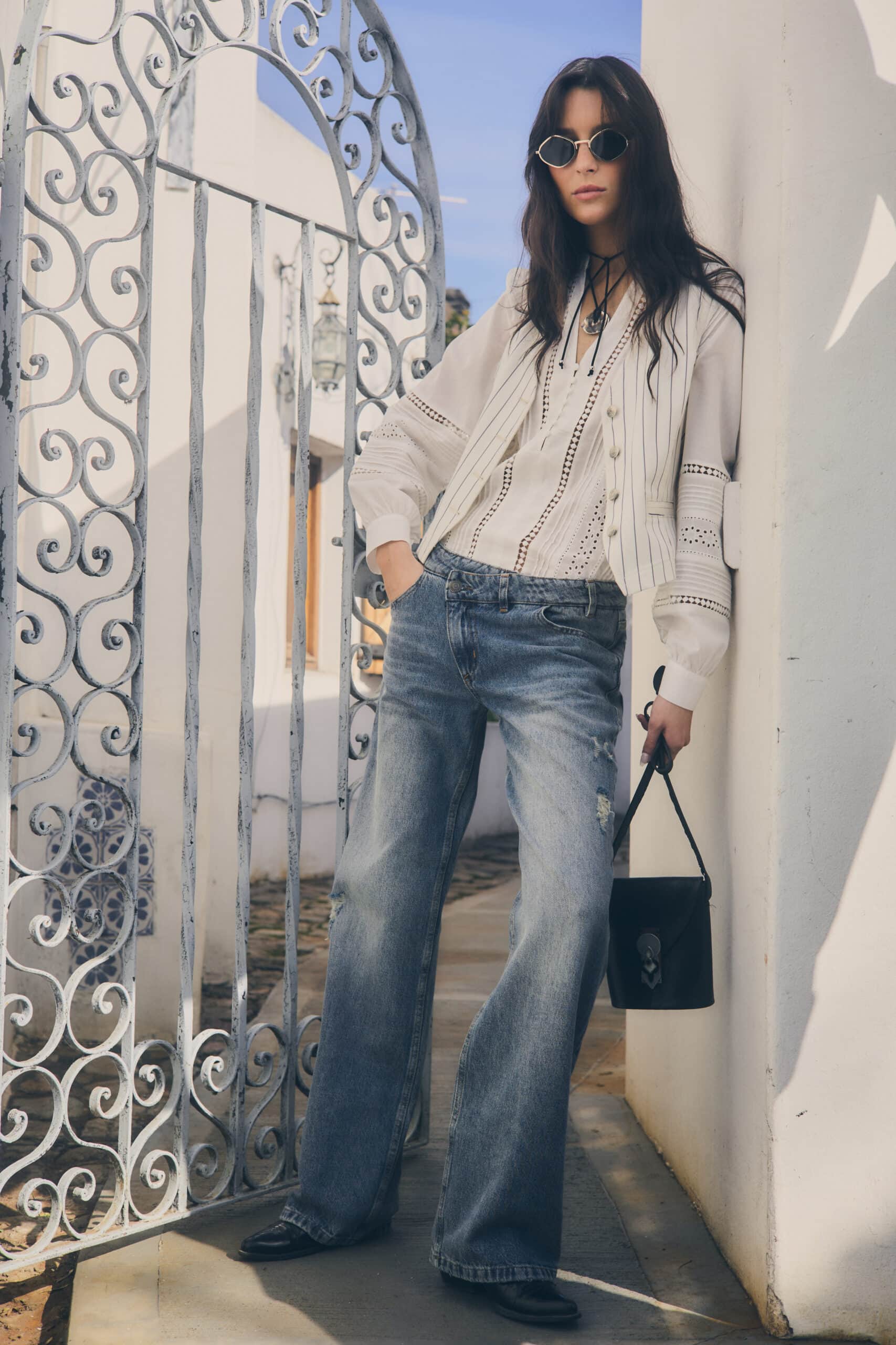 La modelo está usando talle 26 color Azul