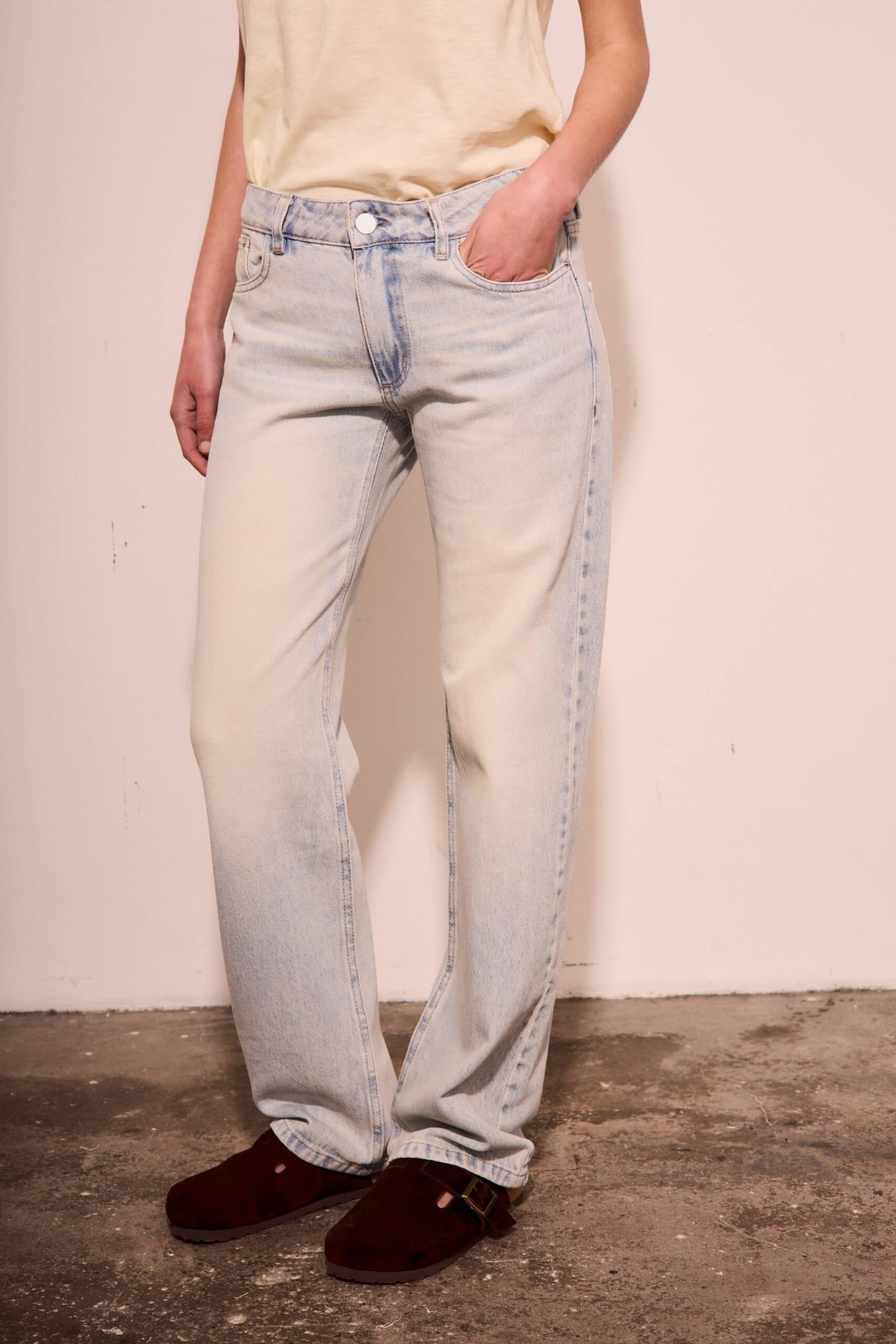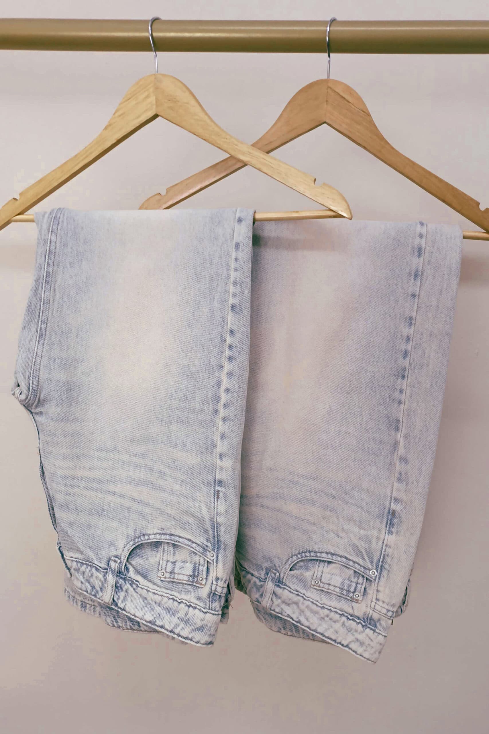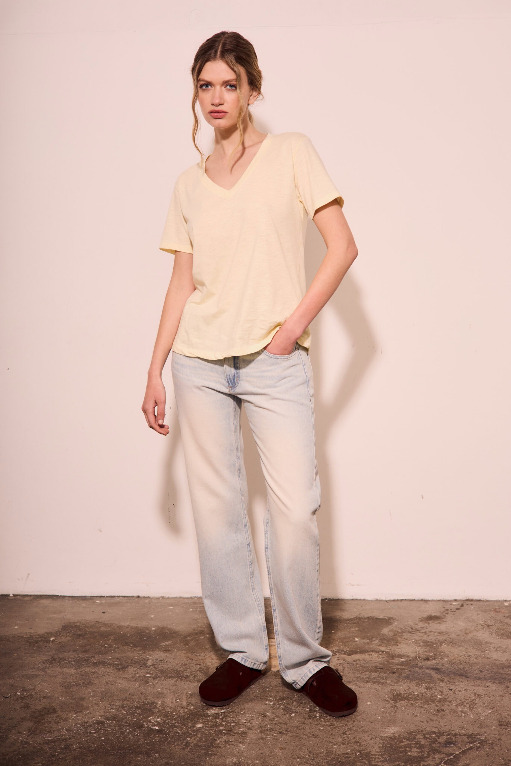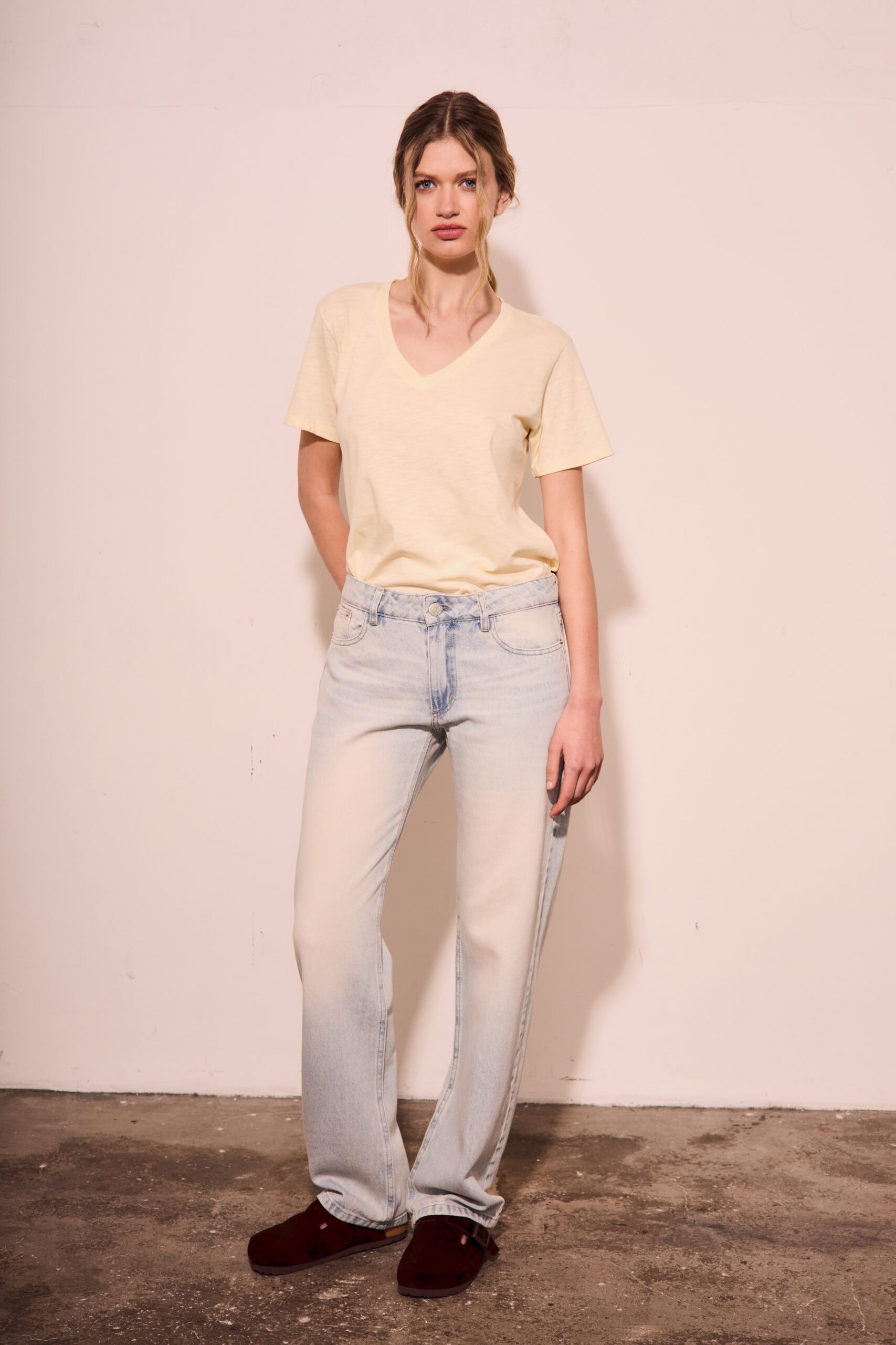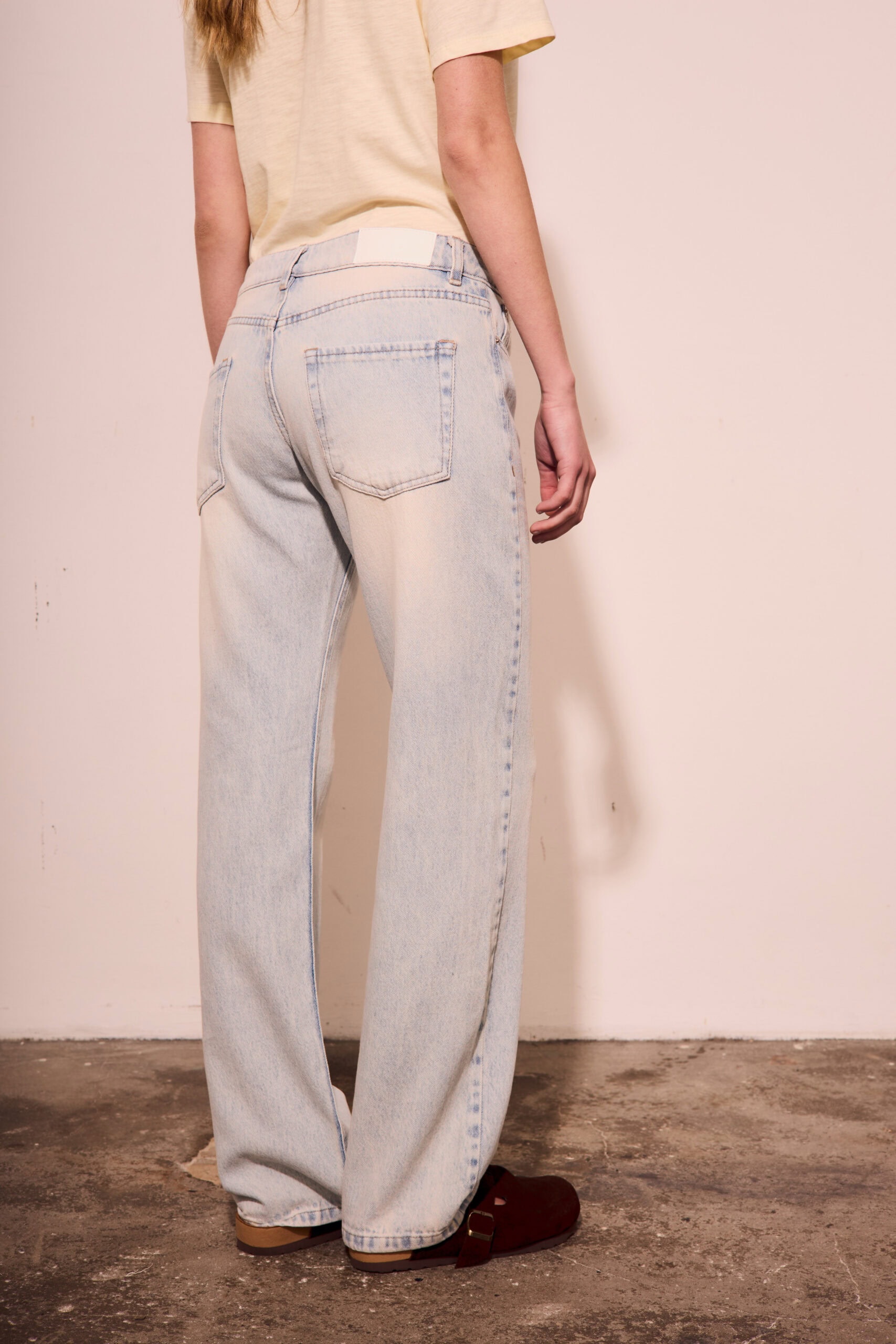 La modelo está usando talle 26 color Celeste con lavado Amarillo