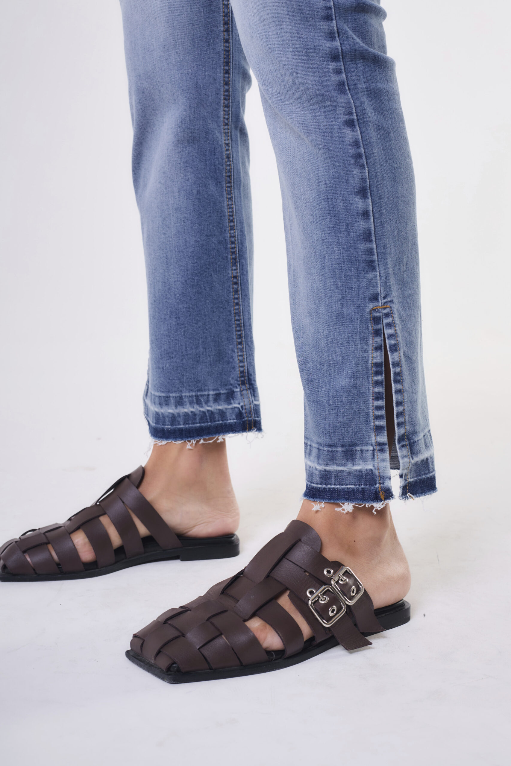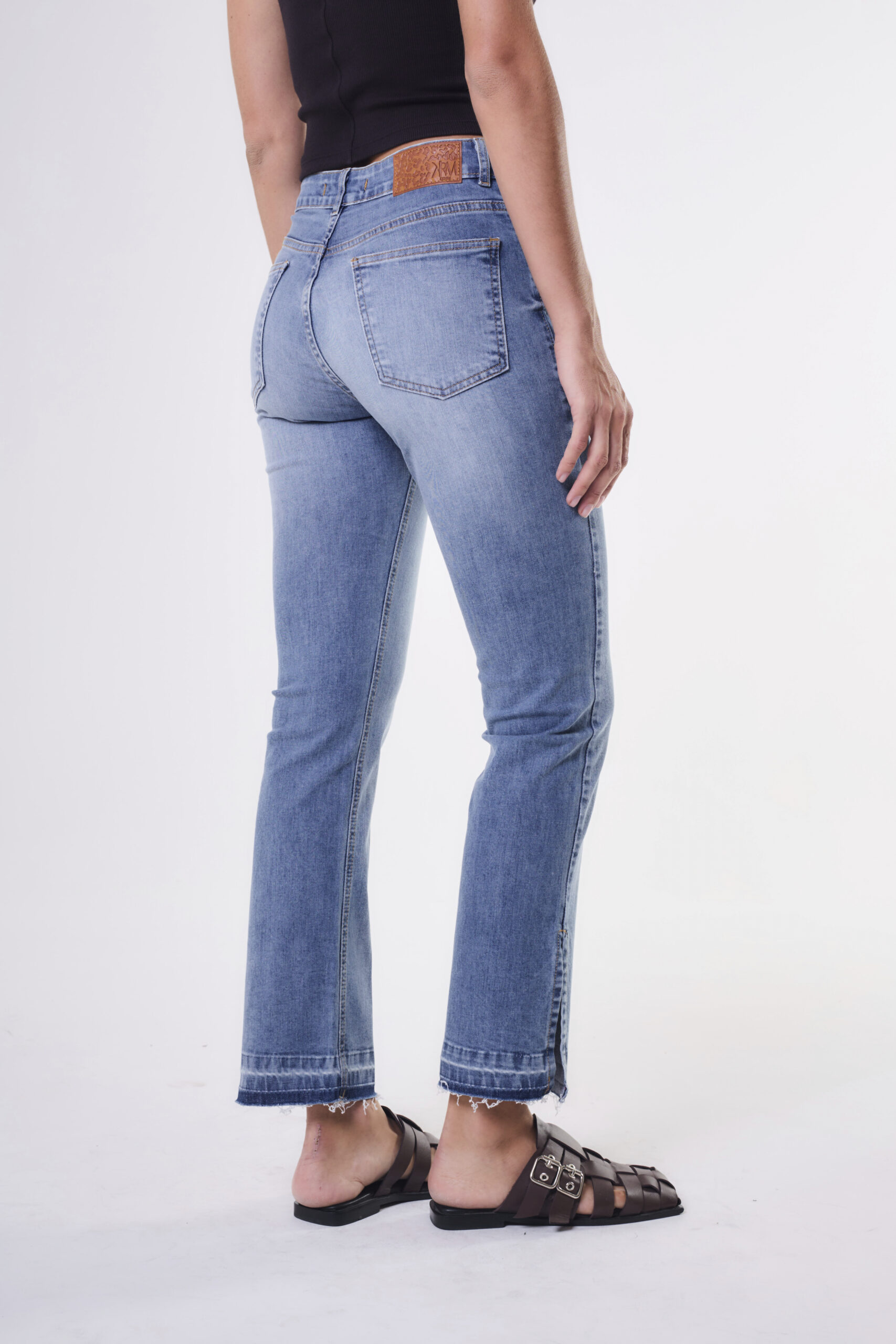 Jean de mujer tiro medio slim fit con tajos en lateral y bajada de ruedo. Apertura de botón personalizado y cierre YKK. Viene con remaches y badana personalizada.