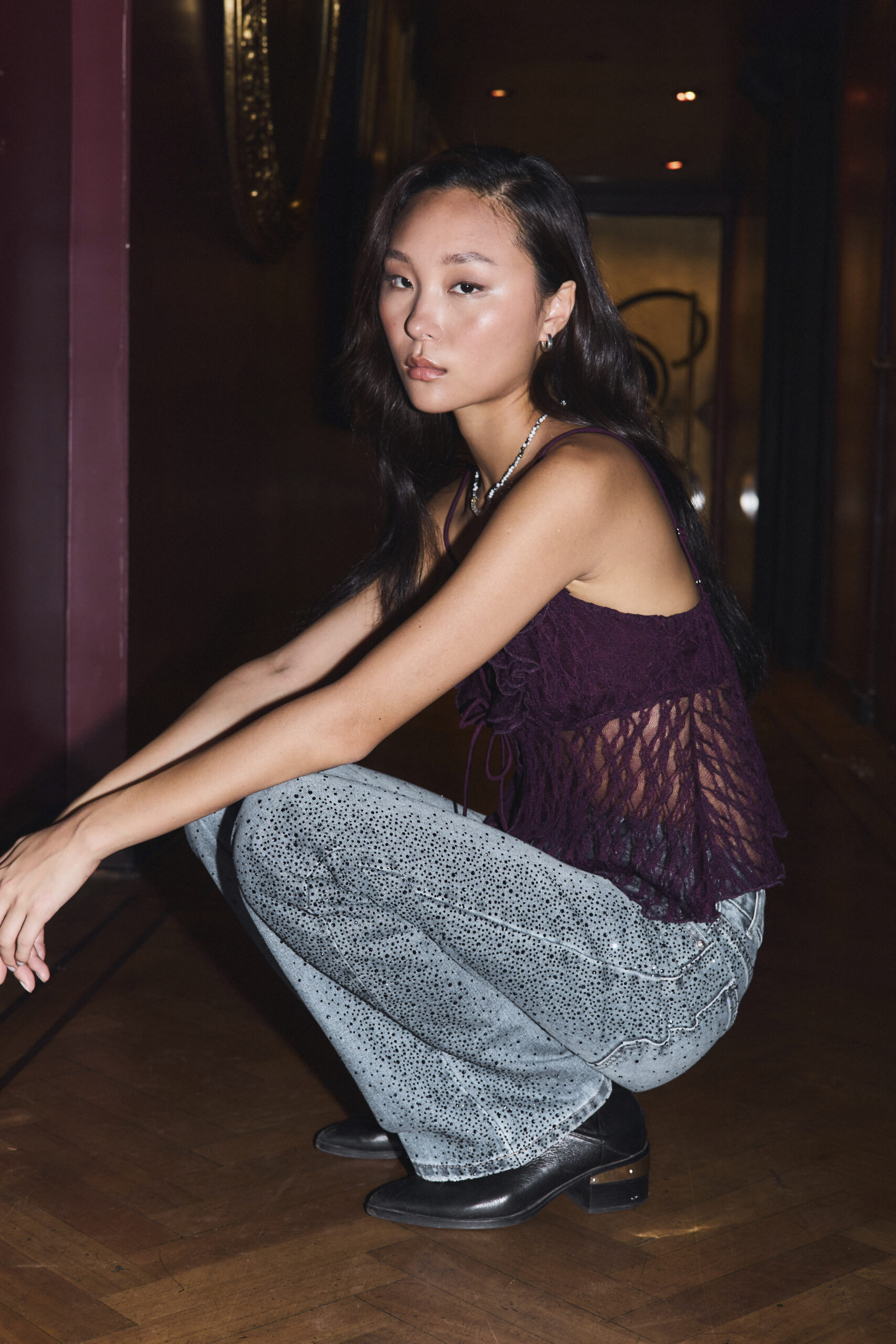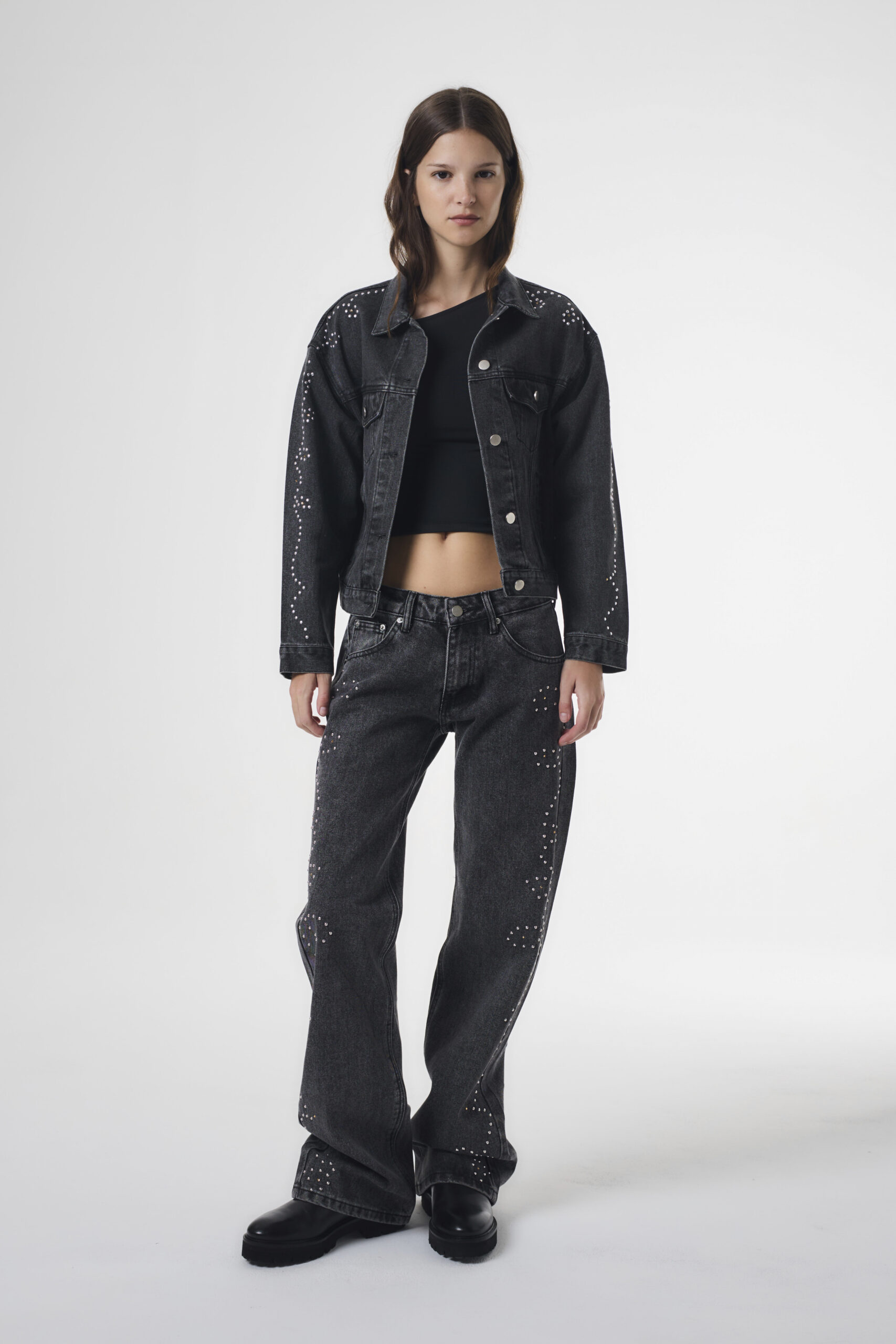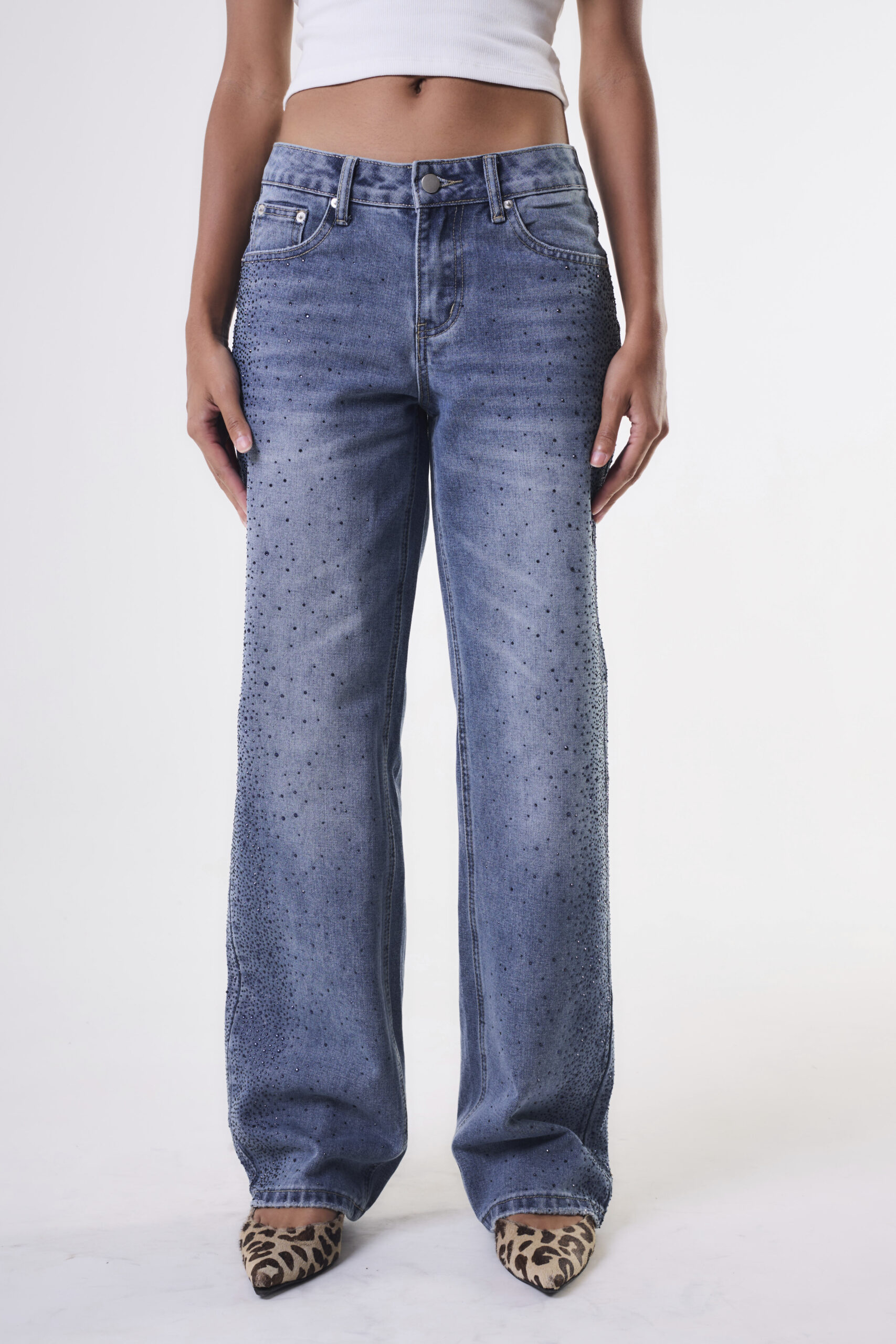 Jean de mujer importado de tiro medio de calce recto de cinco bolsillos con presillas en cintura y remaches en terminaciones. La prenda está lavada con detalle de bigotes. Además, el jean se destaca por tener una lluvia de hotfix strass de distintos tamaños de color azul, donde los hotfix están posicionados en estilo degradé. Se concede acceso a la prenda mediante cierre y botón jeanero y está confeccionada en denim de algodón.