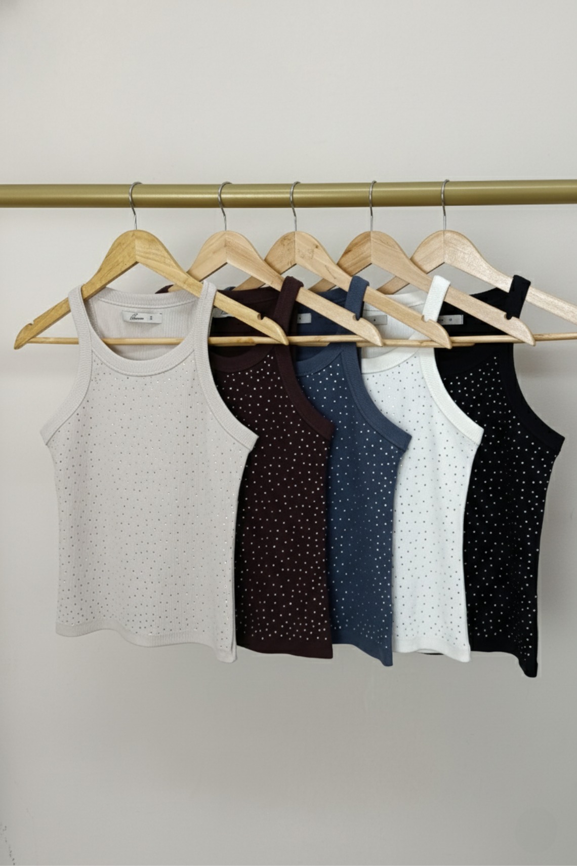Musculosa en morley con hotflix y con escote redondo con collareta ancha.