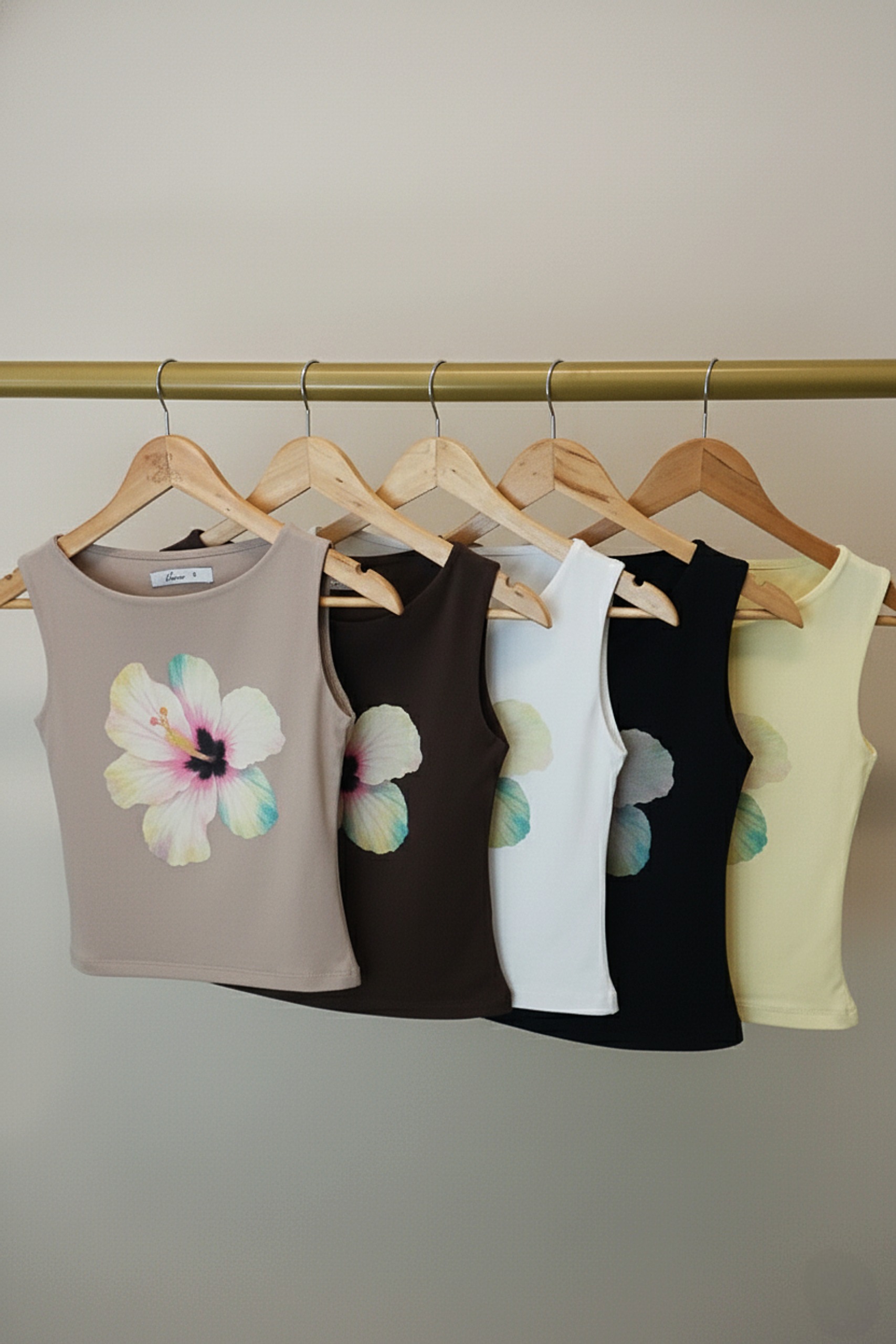 Musculosa de mujer adherente de cuello barco con estampa de flor de hibiscus en el delantero. Delantero doble.