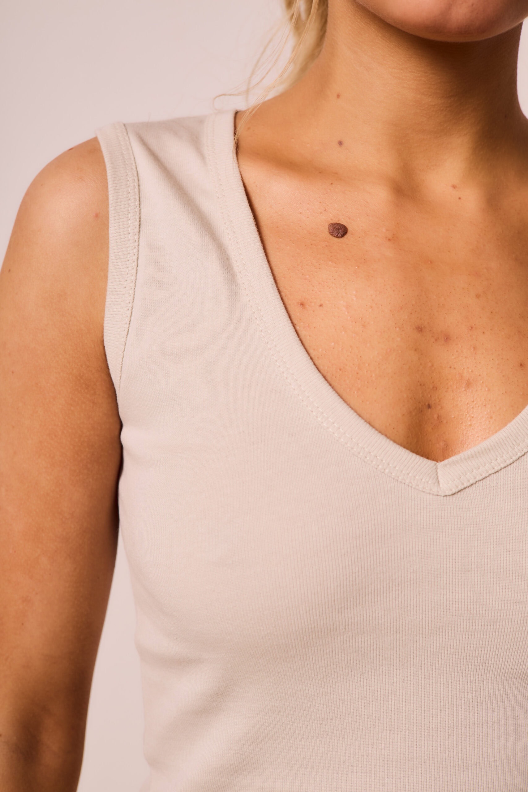Musculosa de mujer de calce adherente de escote en V y collareta ancha. Confeccionada en rib de algodón 100%.