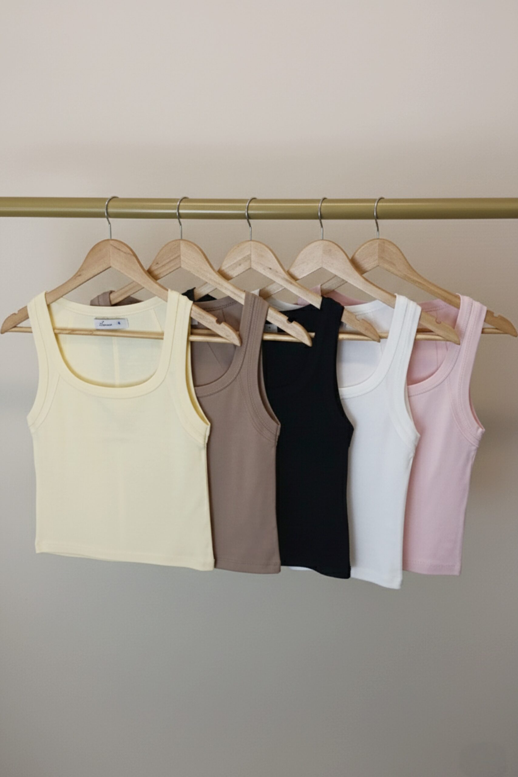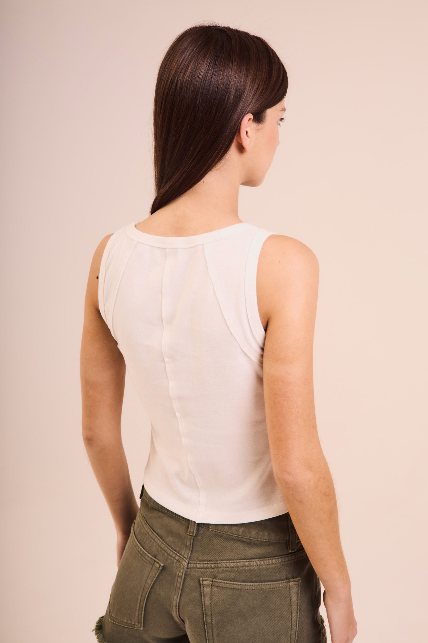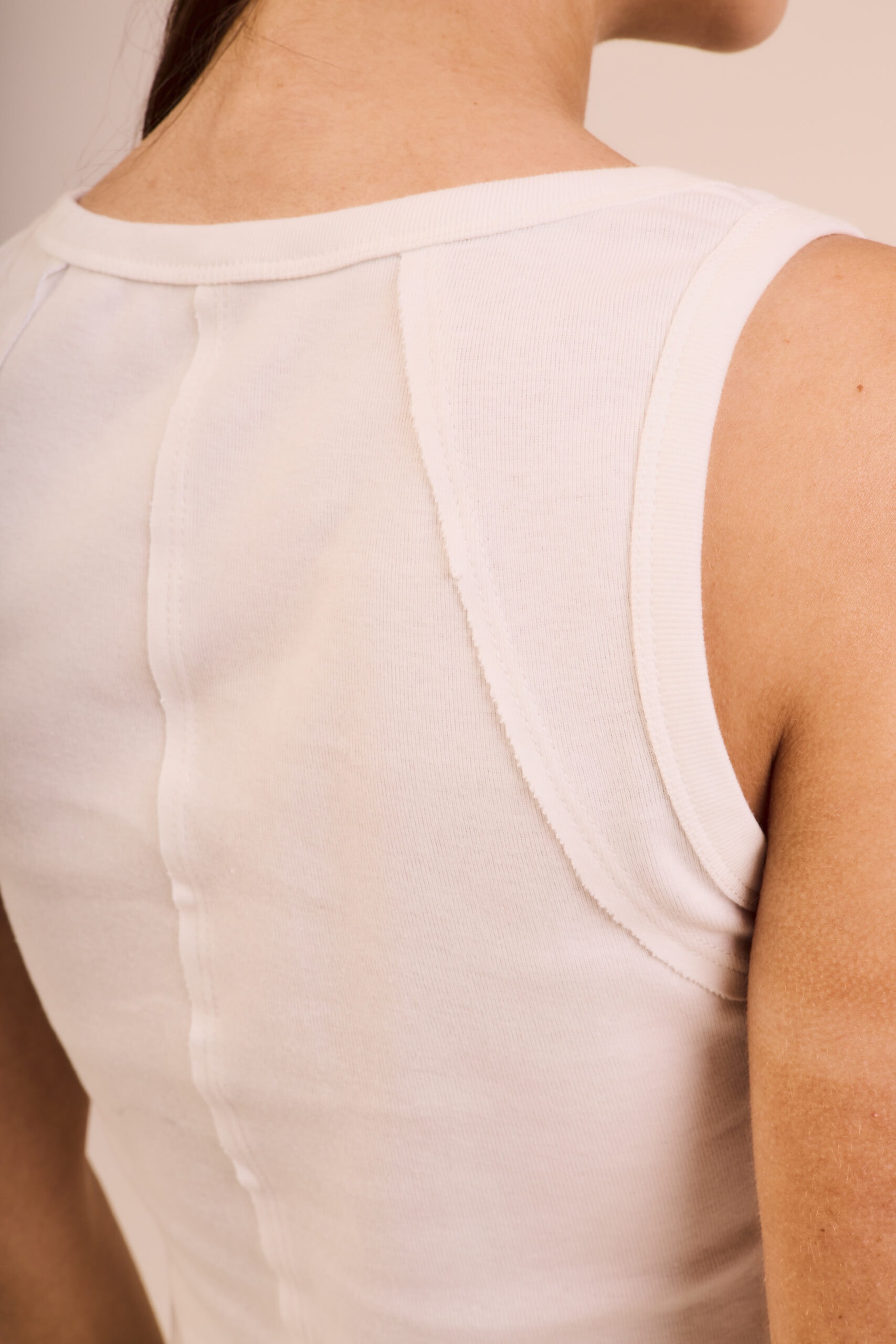 Musculosa de mujer de calce adherente con escote redondo amplio, con detalles de recortes en hombros y centro de espalda. El cuello y sisas tienen detalle de superposición a contratono. Largo modular hasta primera cadera. Confeccionada en rib de algodón 100%.