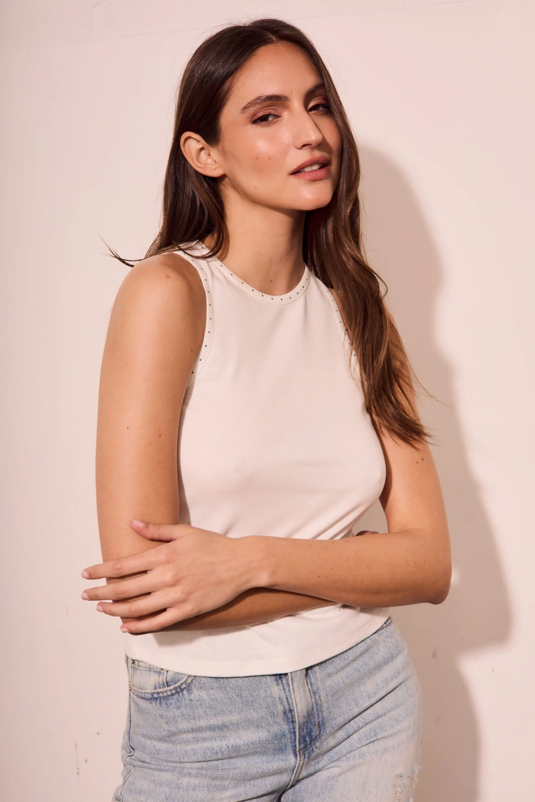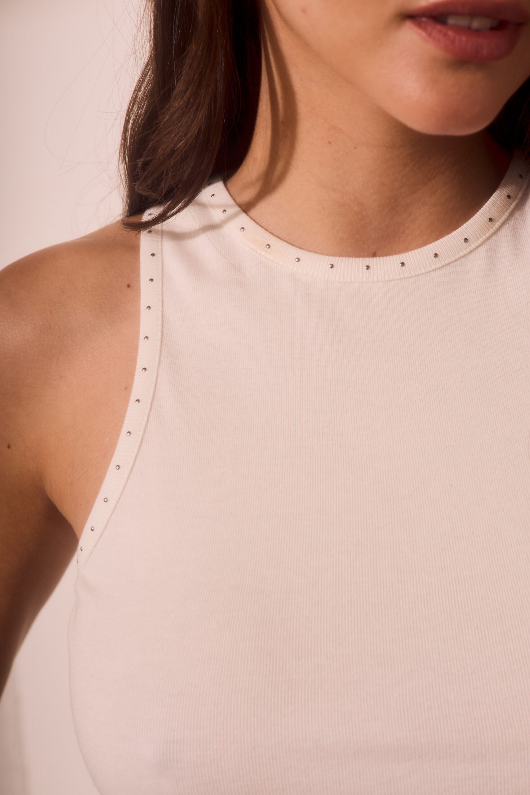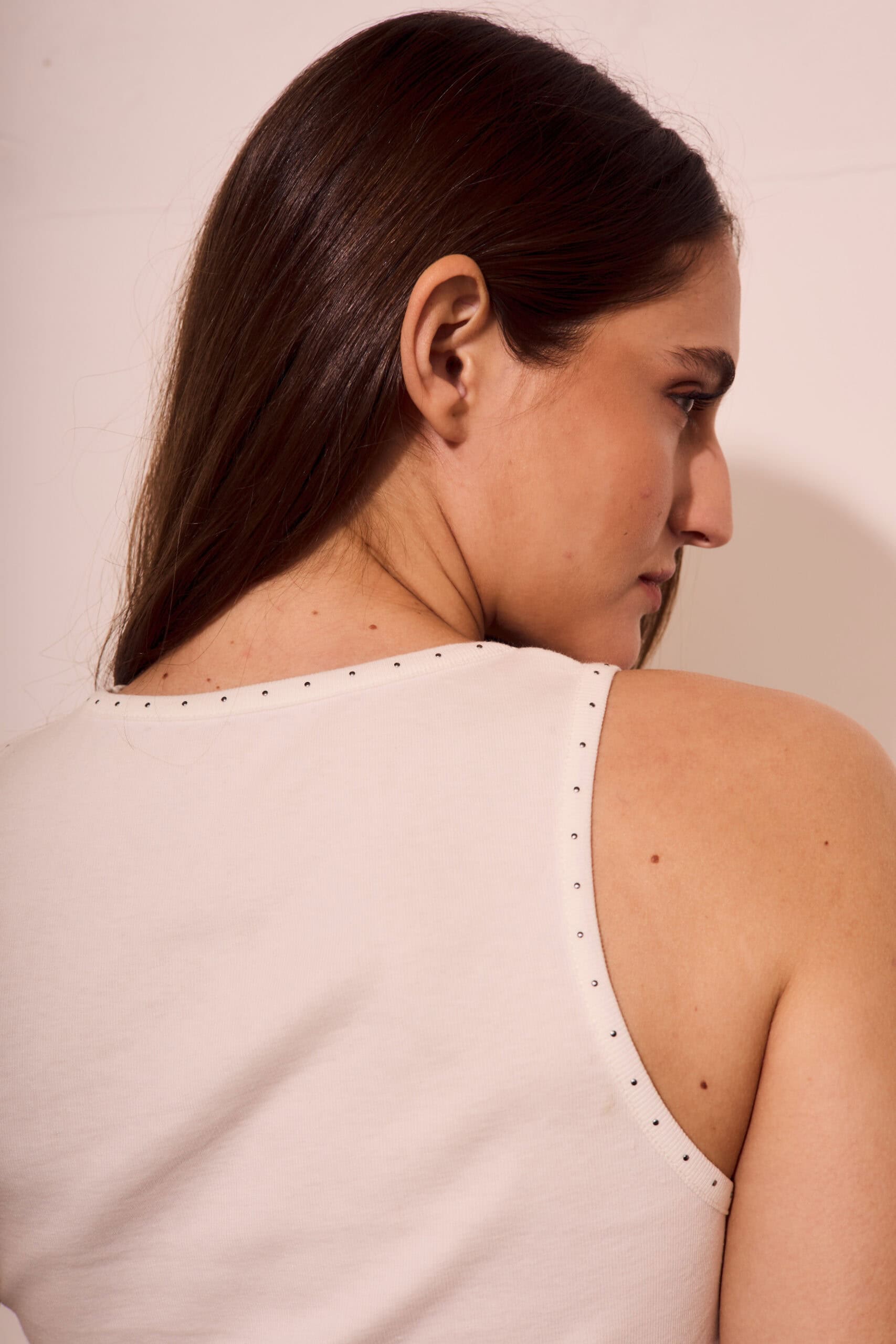Musculosa de mujer cuello halter con hotfix en collareta calce adherente hecho en rib de algodon.