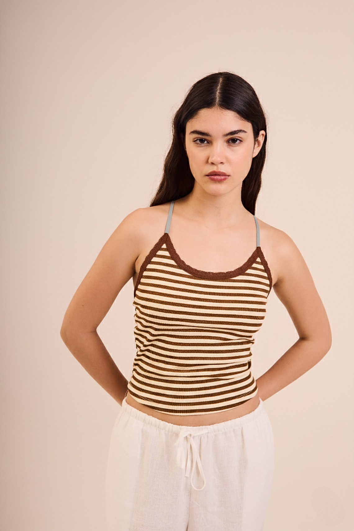 Musculosa de mujer con escote redondo con puntilla en recorrido. Lleva espalda abierta con tiras cruzadas. De calce adherente y largo modular hasta primera cadera. Confeccionada en morley rayado.