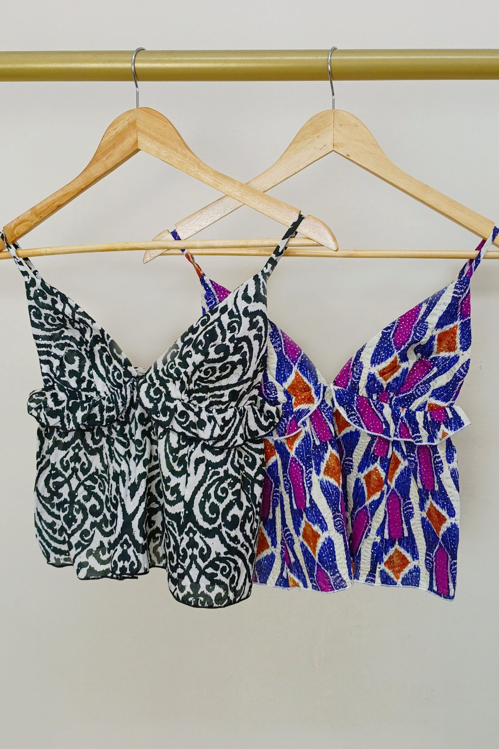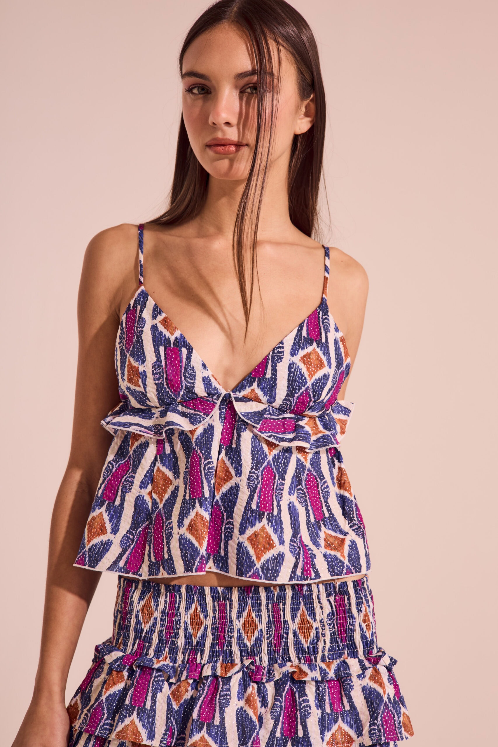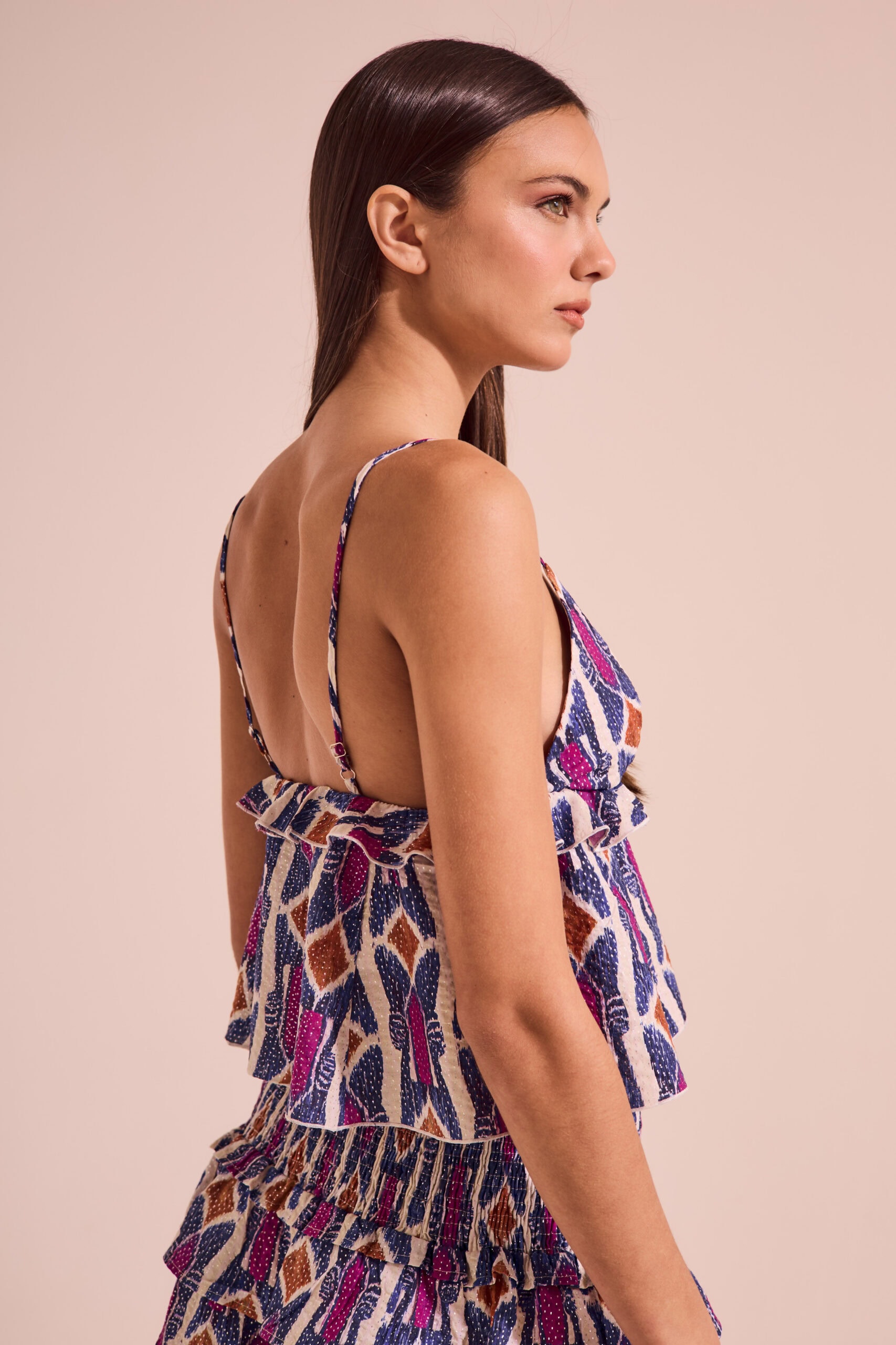 Presenta escote en V con delicados volados bajo el busto, lo que realza su diseño. Además, posee breteles regulables que garantizan un ajuste perfecto. La prenda está confeccionada en voile estampado con mini lunares foil.