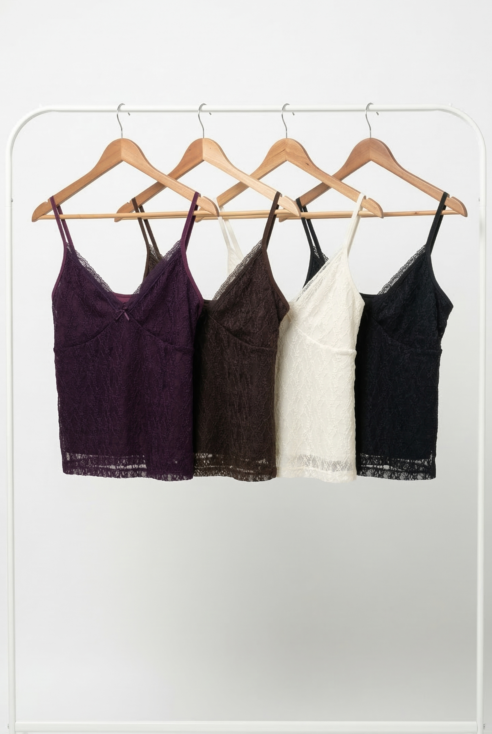 Musculosa de mujer calce adherente con largo modular hasta primera cadera. Lleva breteles finos regulables. Además, posee escote en V con una puntilla que recorre el escote. La prenda está confeccionada con encaje y forrada con microfibra.