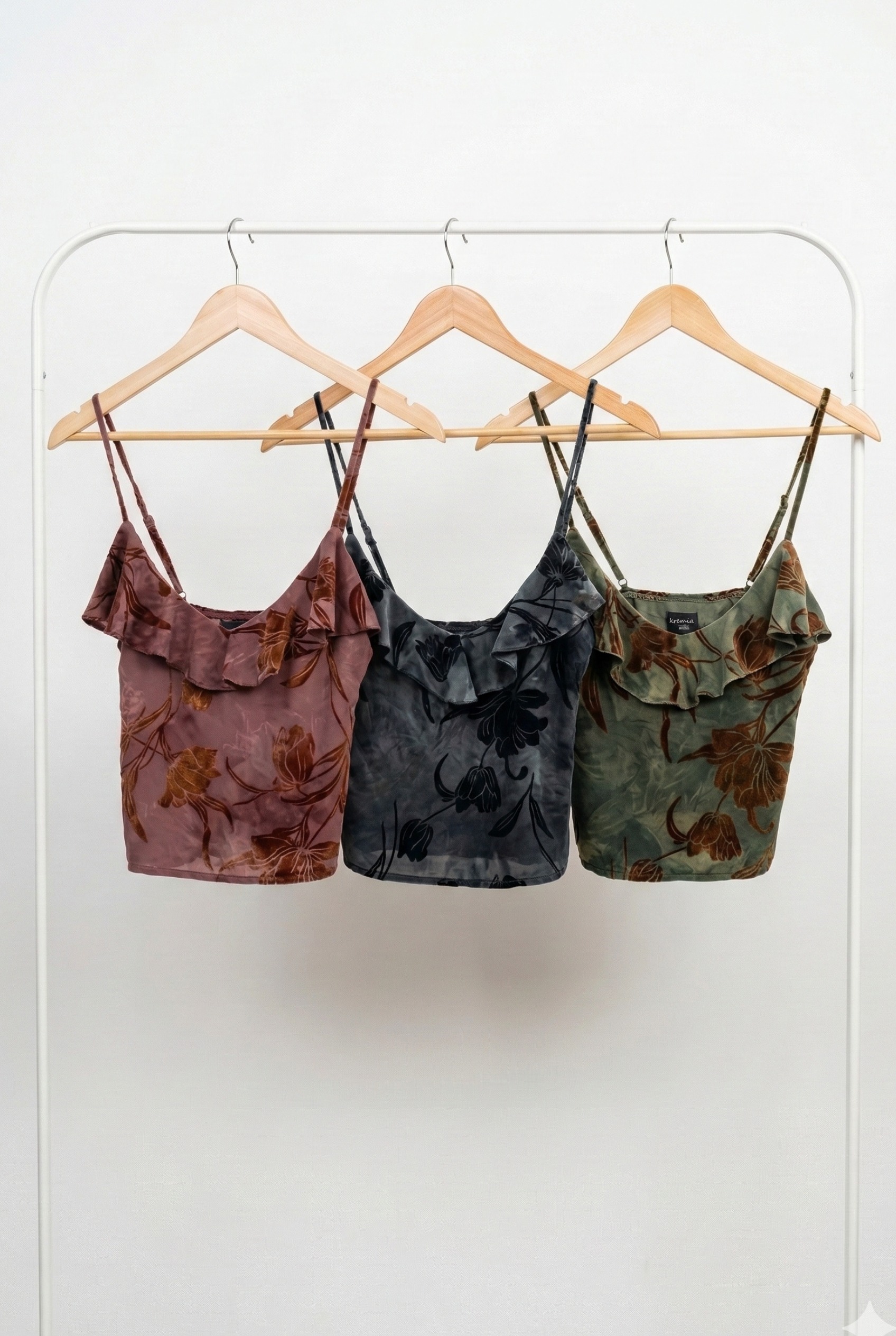 Musculosa de mujer de calce adherente con largo modular hasta primera cadera. Lleva breteles finos regulables y escote en V. Además, tiene un detalle de volados en el recorrido del escote. La prenda está confeccionada en una microfibra diferenciada con lavado vintage y diseño floral de flock.