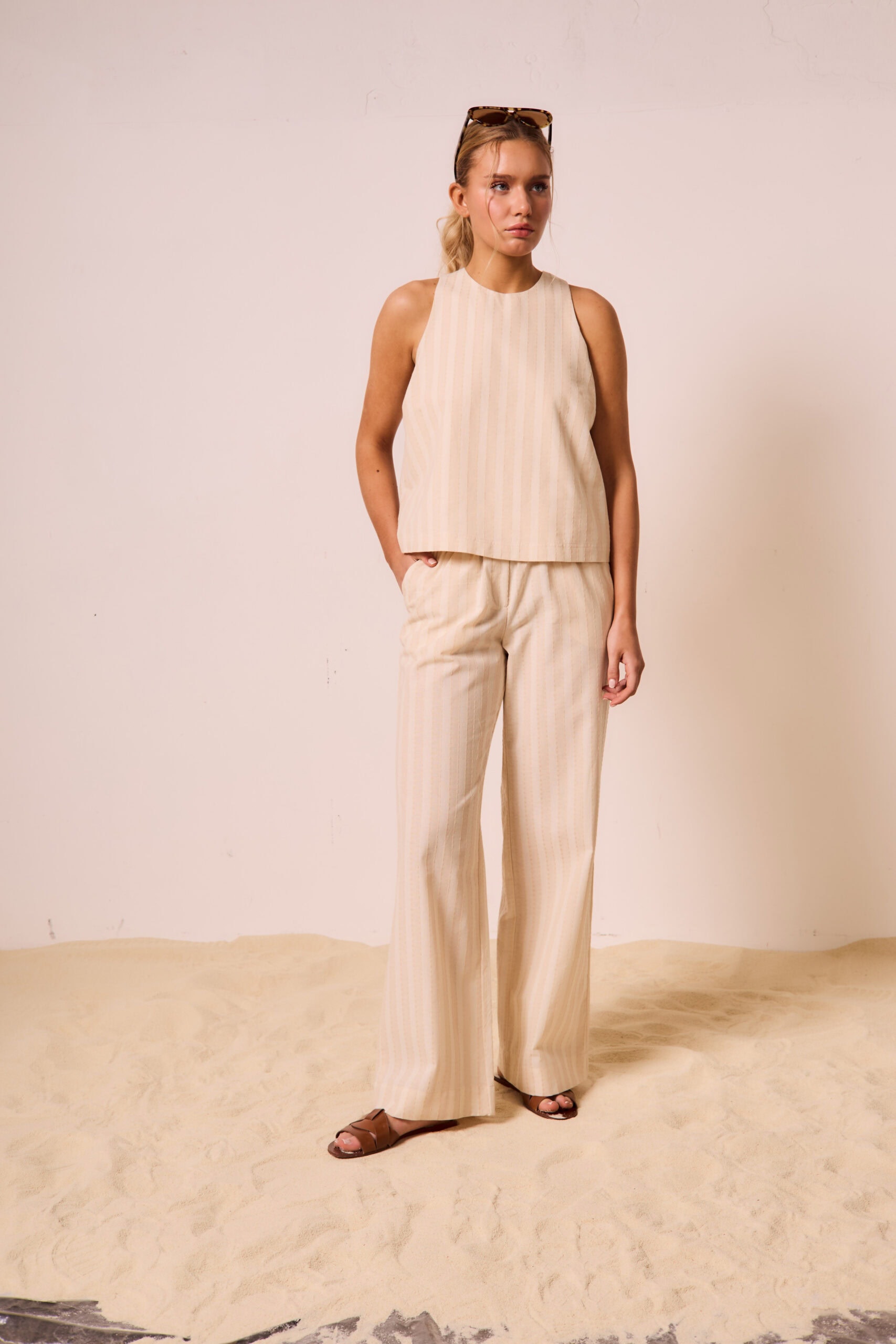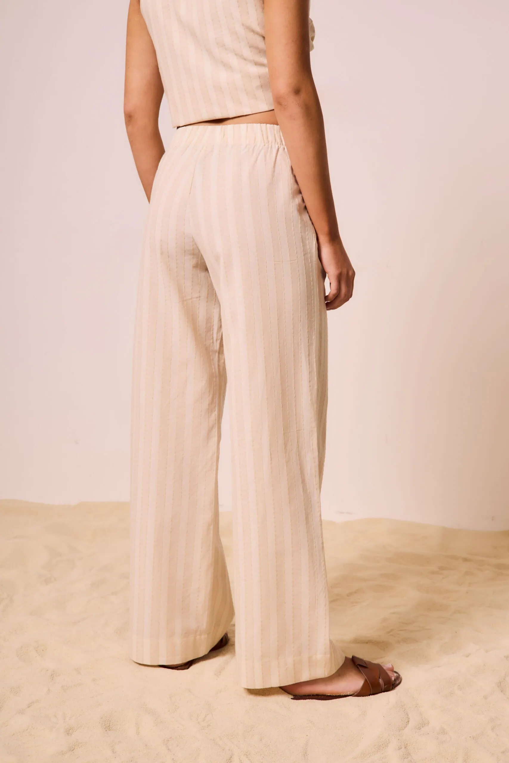 Pantalón tiro medio con pierna recta y cintura elástica. Lleva bolsillos en laterales. Confeccionado en voile pesado de algodón con trama diferenciada a contratono.