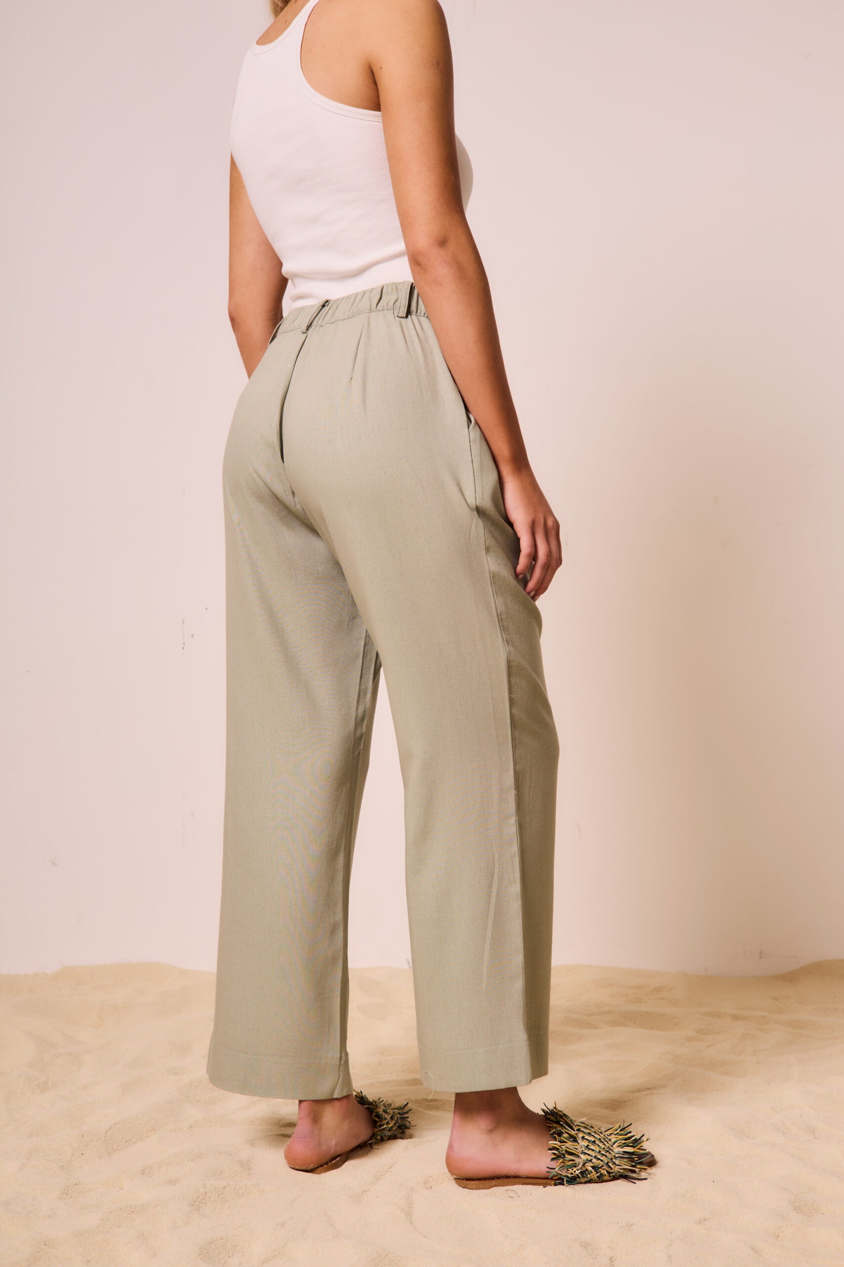 Pantalón de mujer recto tiro alto con pinzas en el delantero y presillas en cintura. Lleva elástico en la espalda de la cintura.