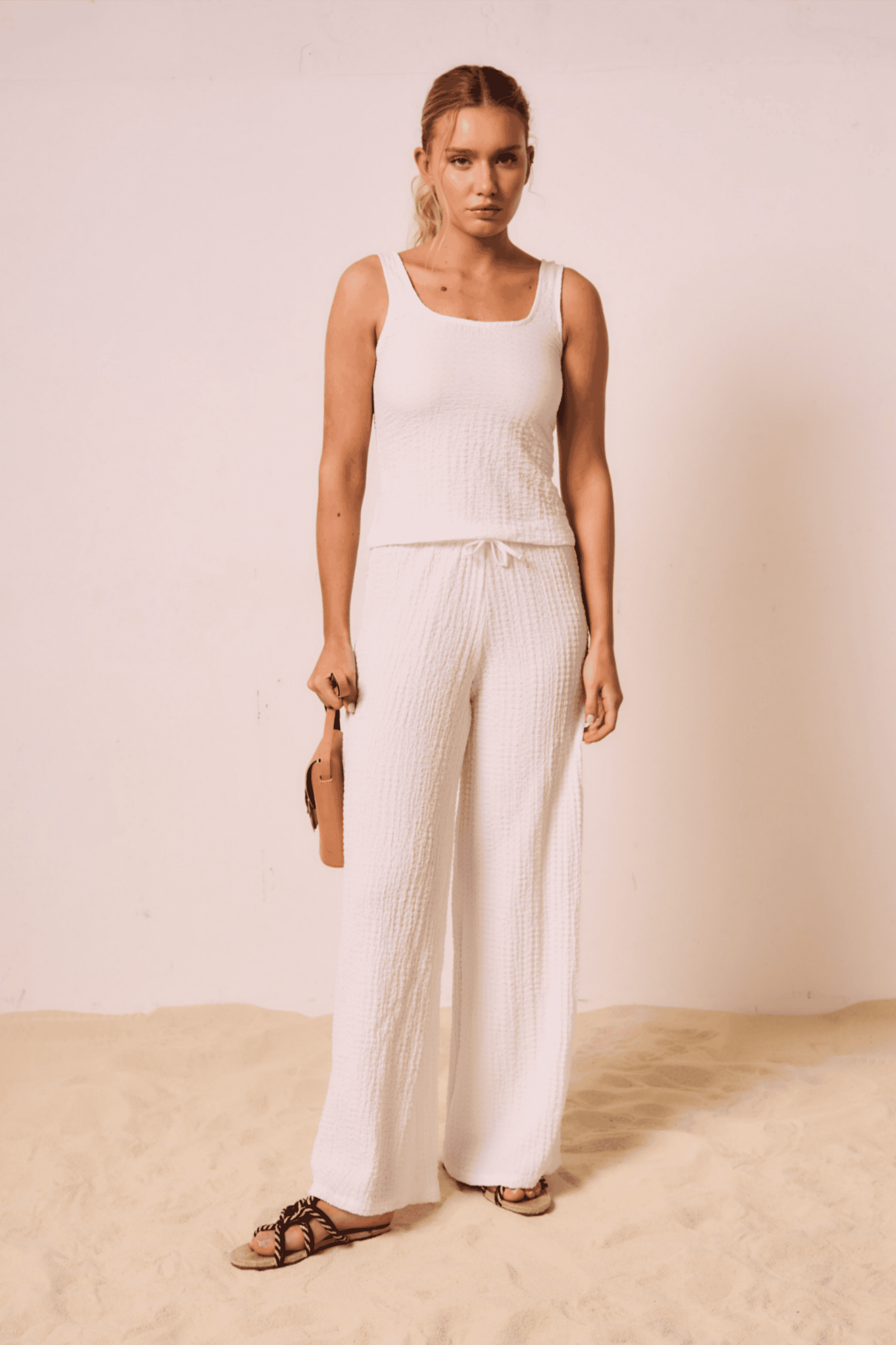 Pantalón de mujer tiro medio estilo palazzo wide leg con cintura elástica y cordón al tono. Confeccionada en bambula.