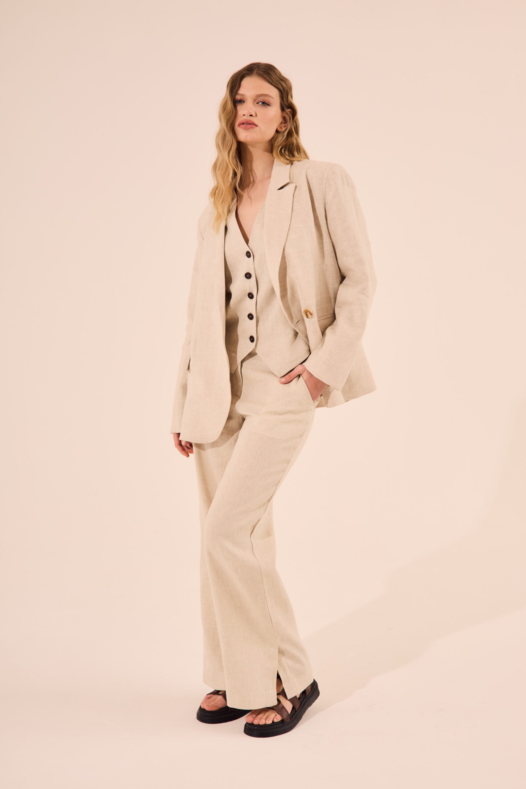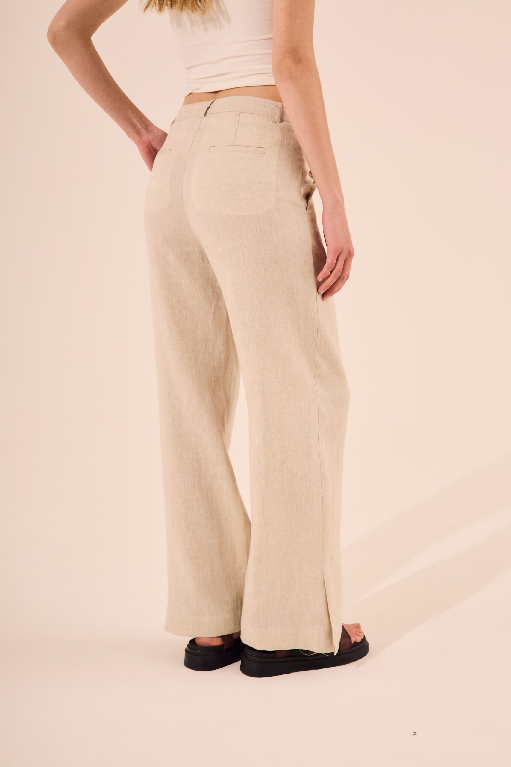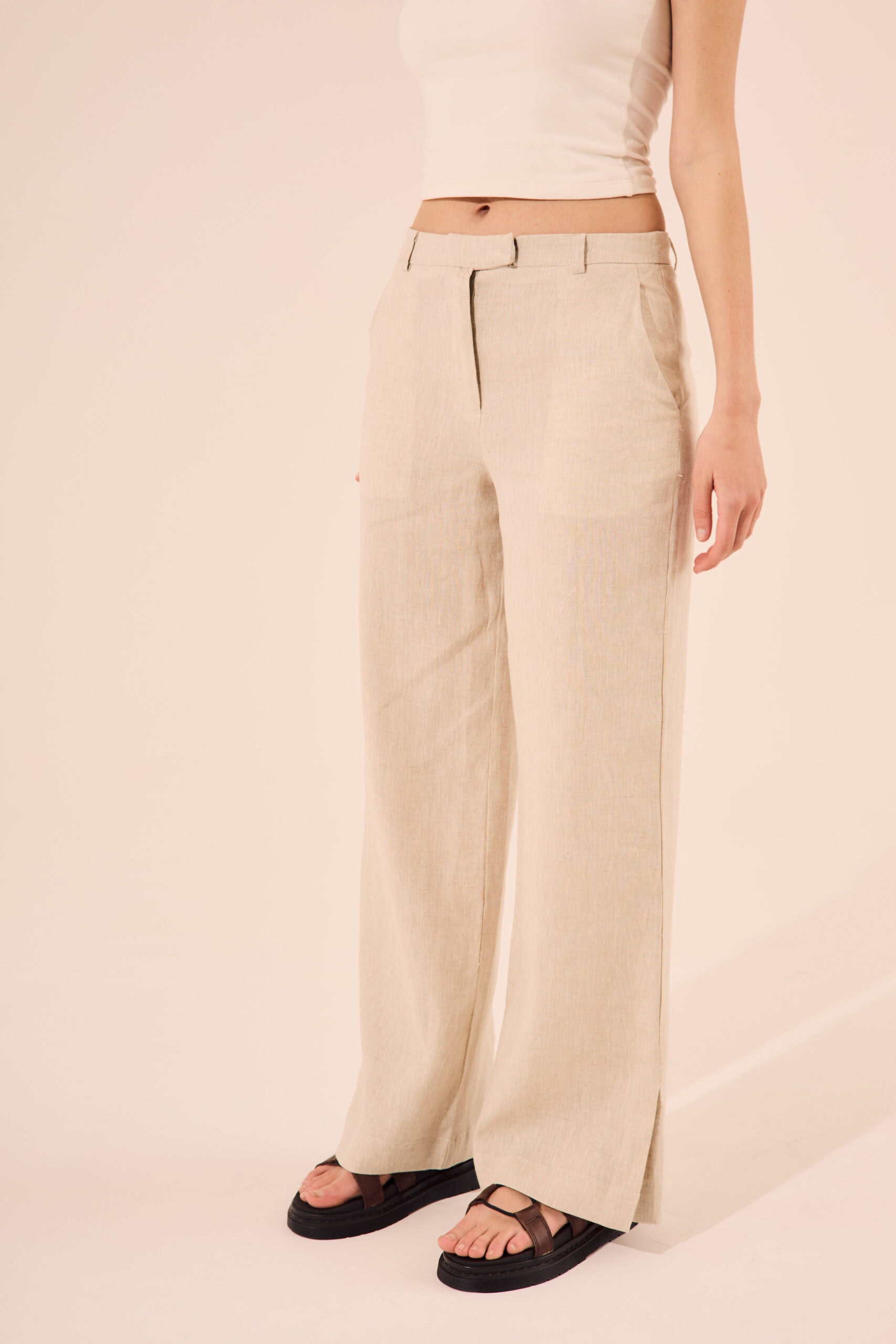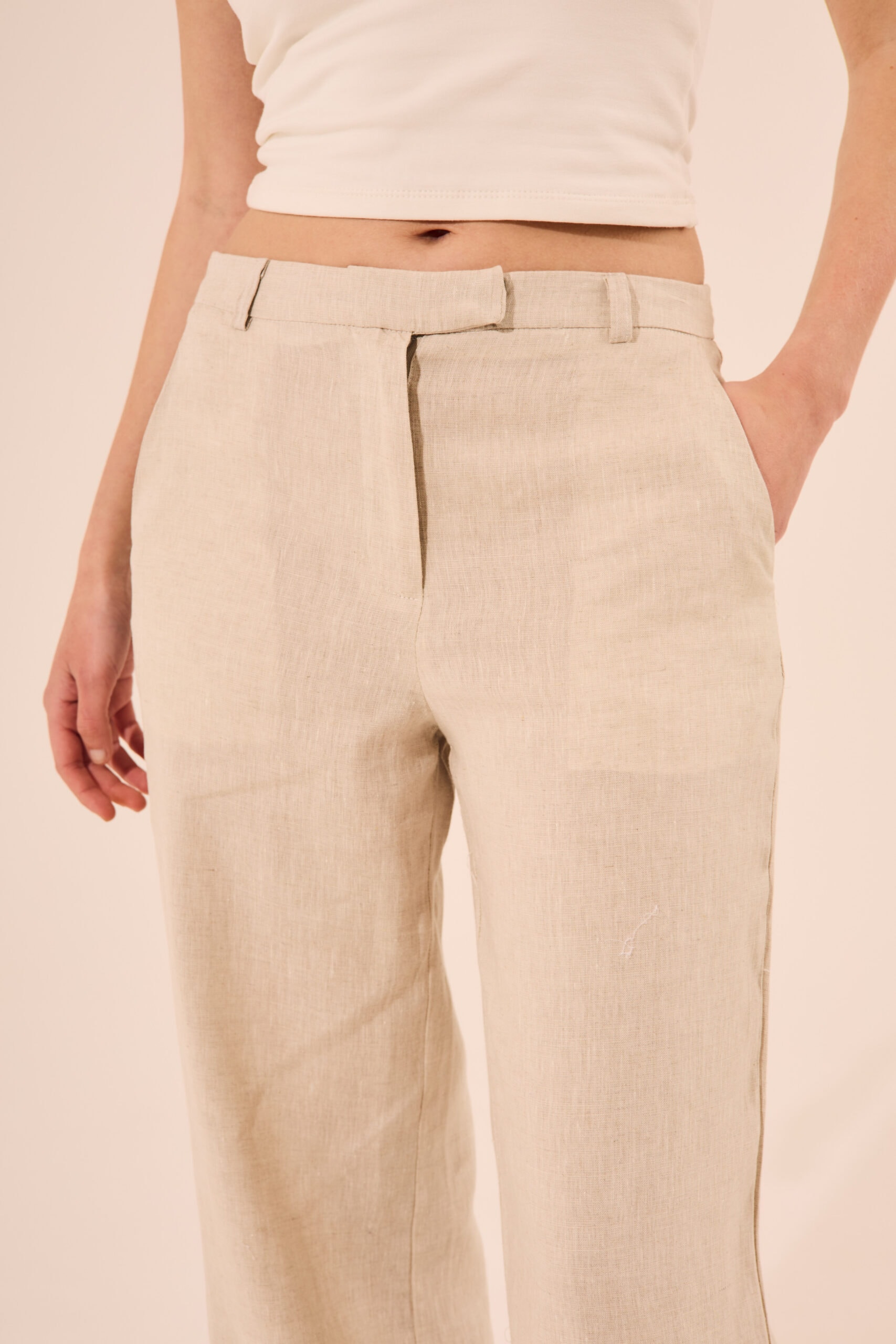 Pantalón tiro medio de calce recto. Lleva bolsillos laterales y ribete en espalda. Cintura con presillas y cruce asimétrico. Detalle de traslape en laterales externos de las piernas. Acceso mediante gancho pantalonero, botón translúcido y cierre. Confeccionado en lino 100% sastrero.