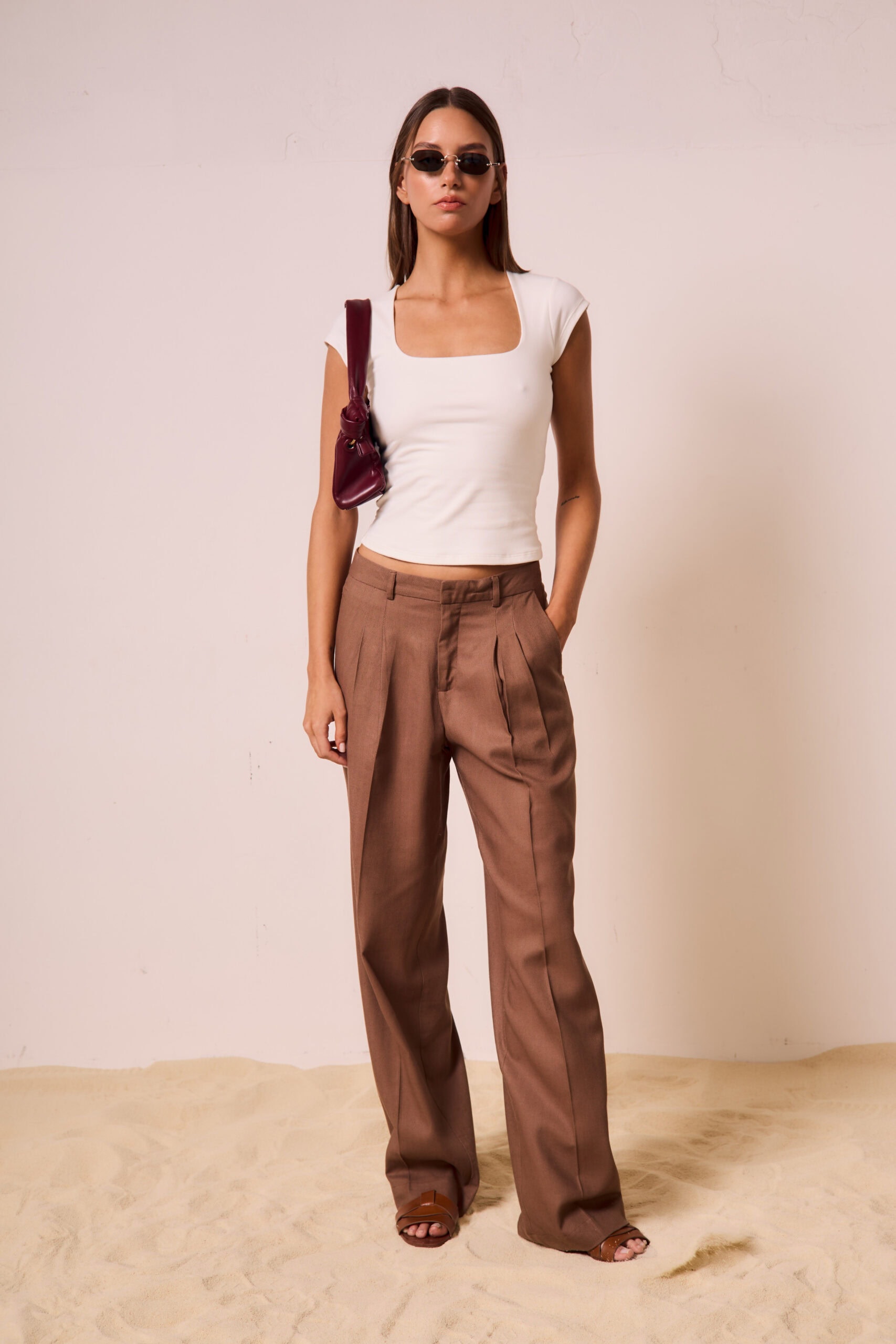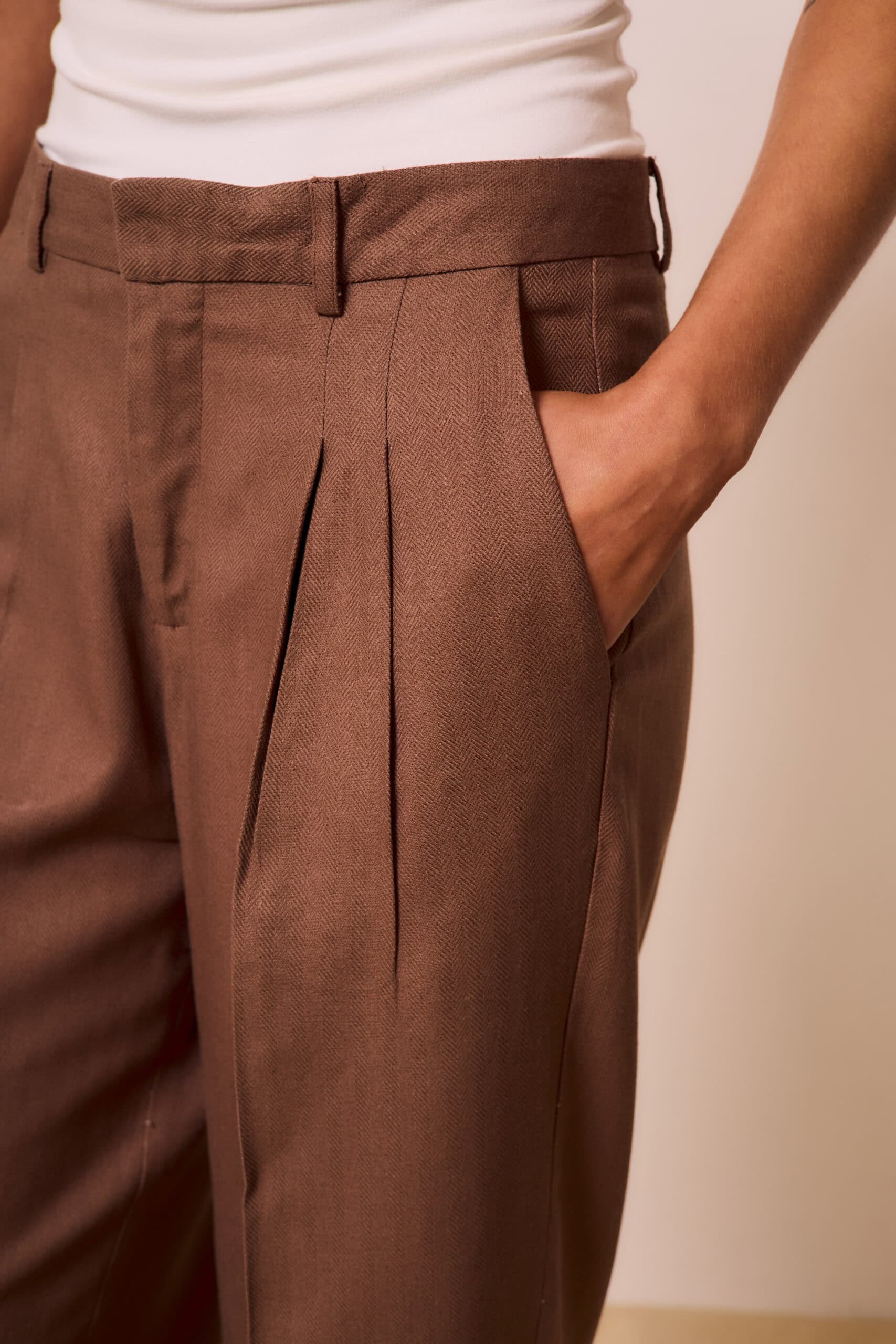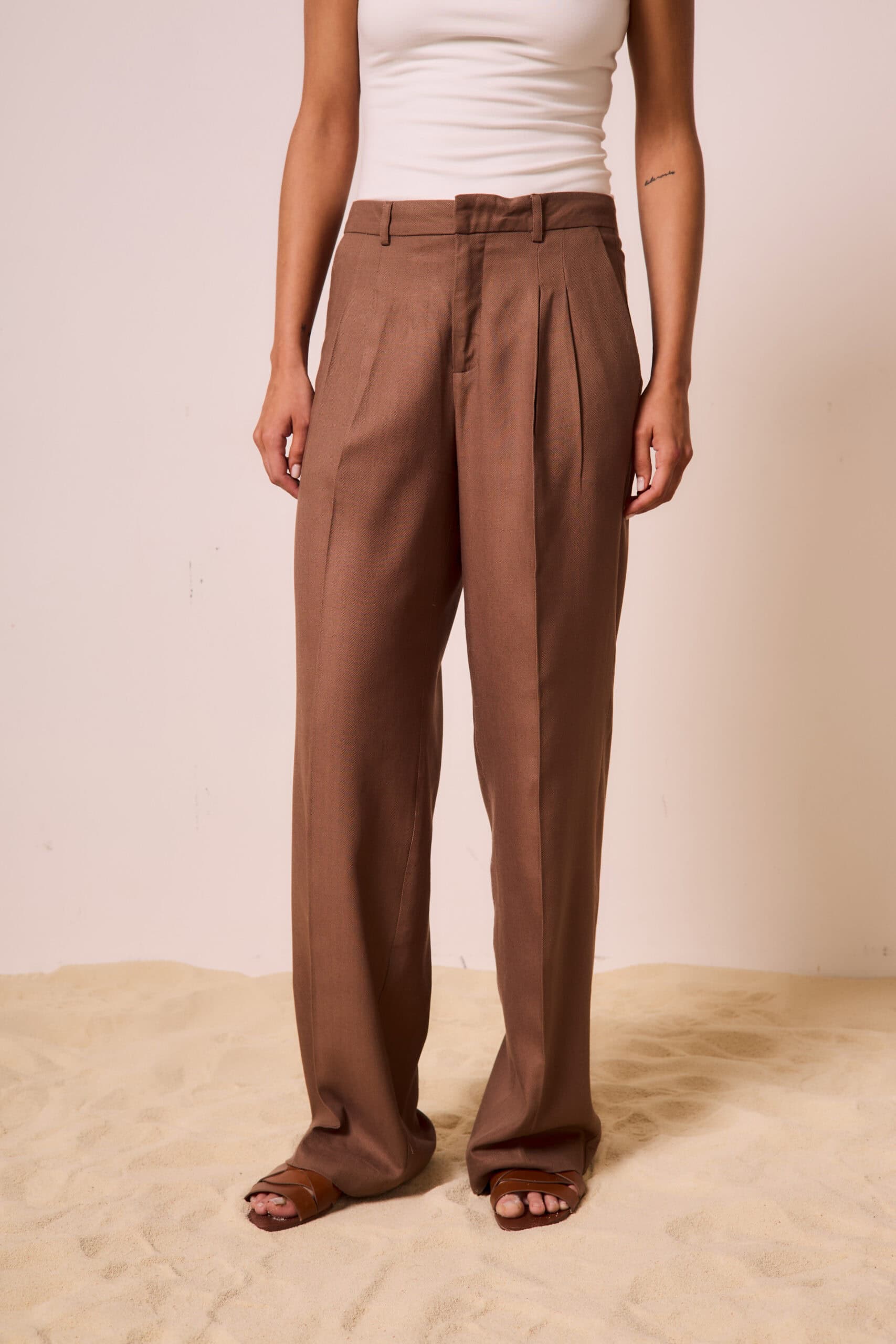 Pantalón sastrero tiro medio hecho en lino sastrero espigado.