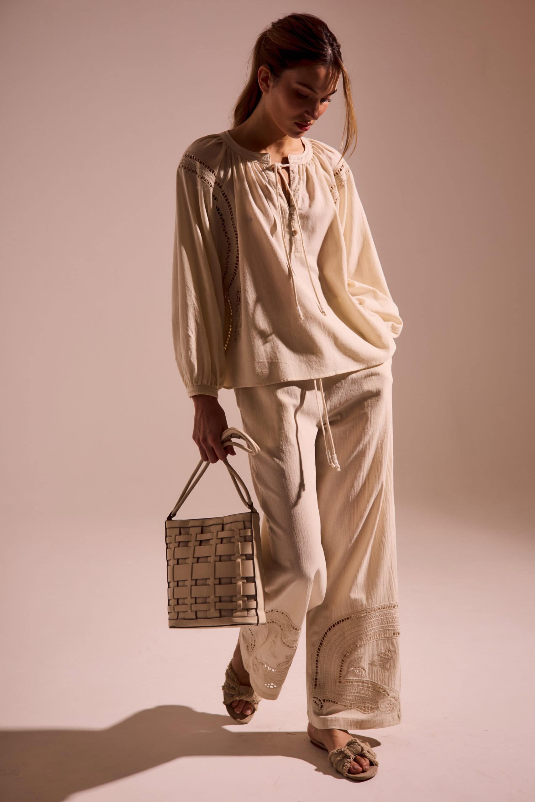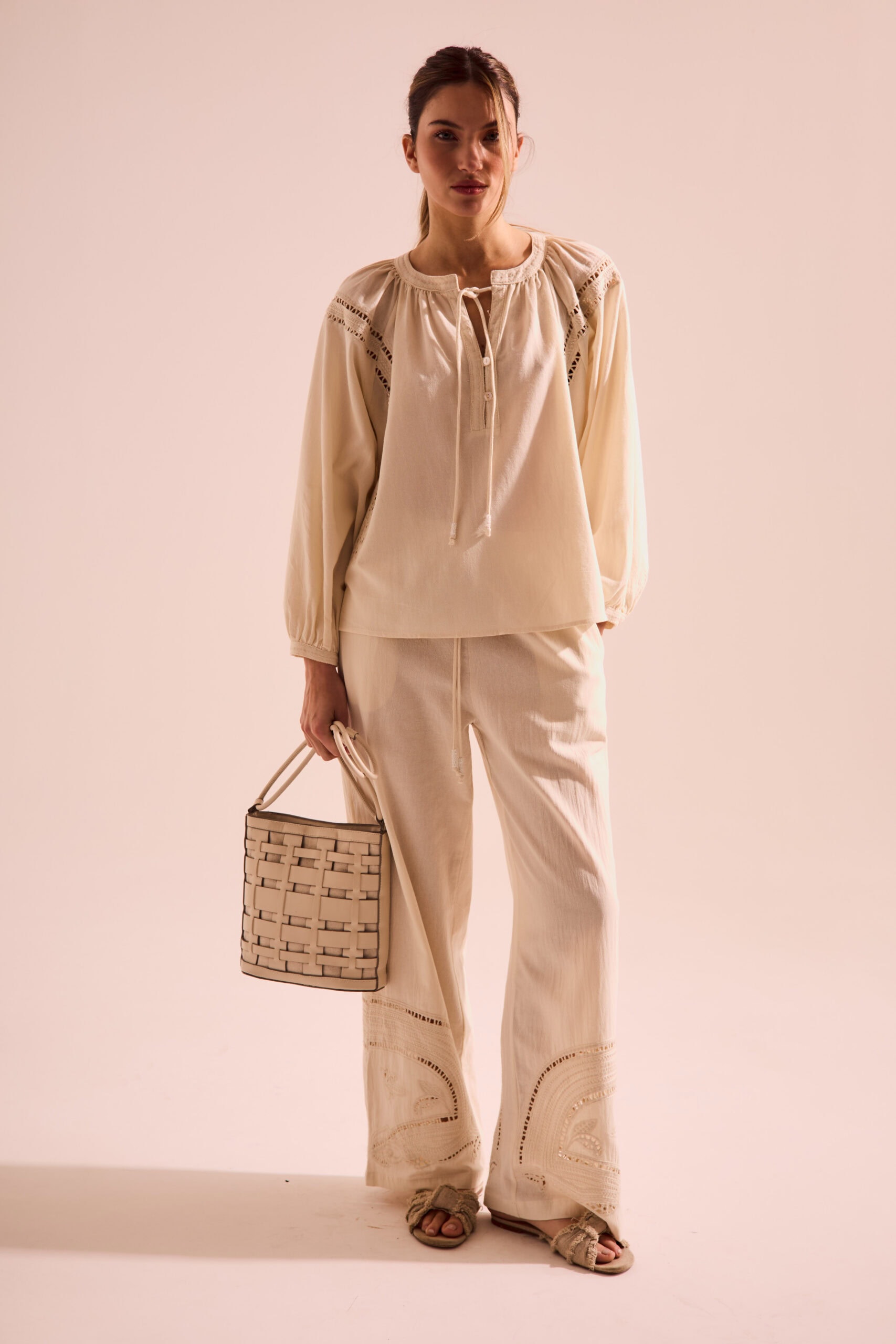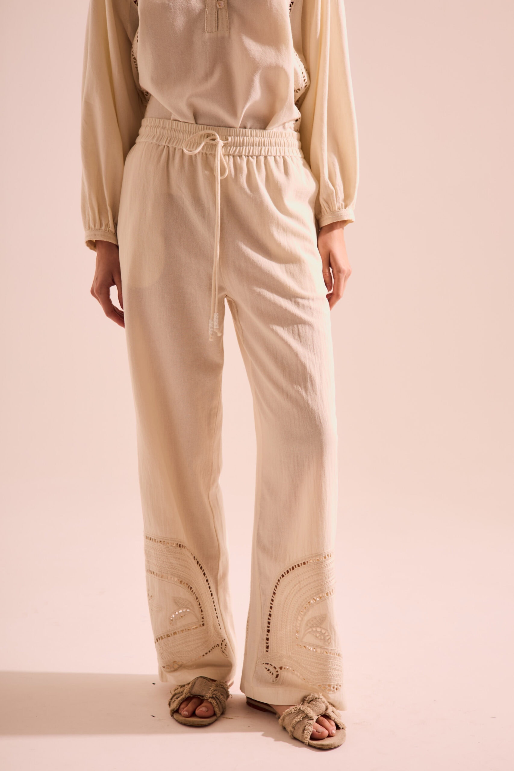 Pantalón importada de mujer de calce relajado tiro medio. Lleva cintura elástica con cordón de ajuste del mismo género con detalle de puntera con mostacillas. Tiene bolsillos laterales y detalle de bordado al tono con calados en el ruedo que recorren el delantero y espalda de ambas piernas. Confeccionado en cey de algodón.