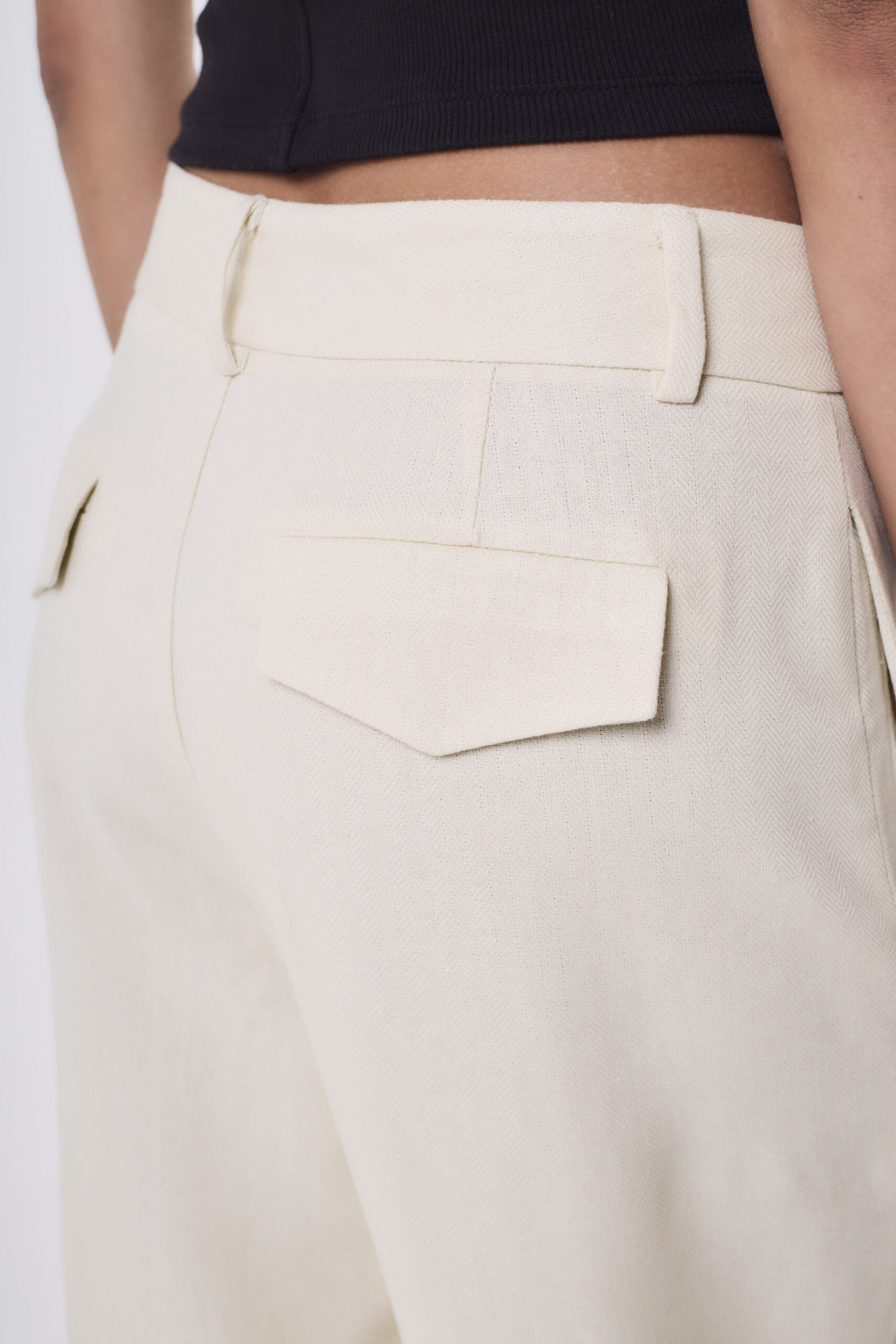 Pantalón de mujer tiro medio de calce holgado, con pierna balloon. La prenda lleva pinzas de entalle en espalda, bolsillos laterales y bolsillos ojal con tapa en espalda. También tiene presillas en pretina. Se accede a la prenda mediante cierre, gancho pantalonero y botón, confeccionado un lino sastrero espigado.