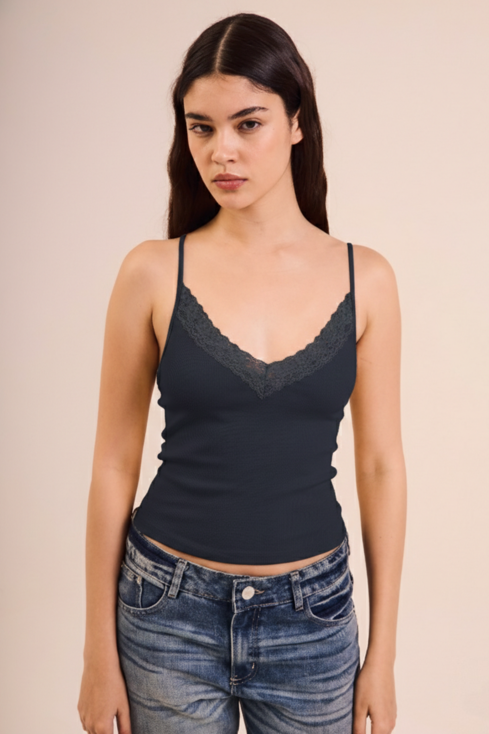 La modelo está usando talle 26 color Natural.