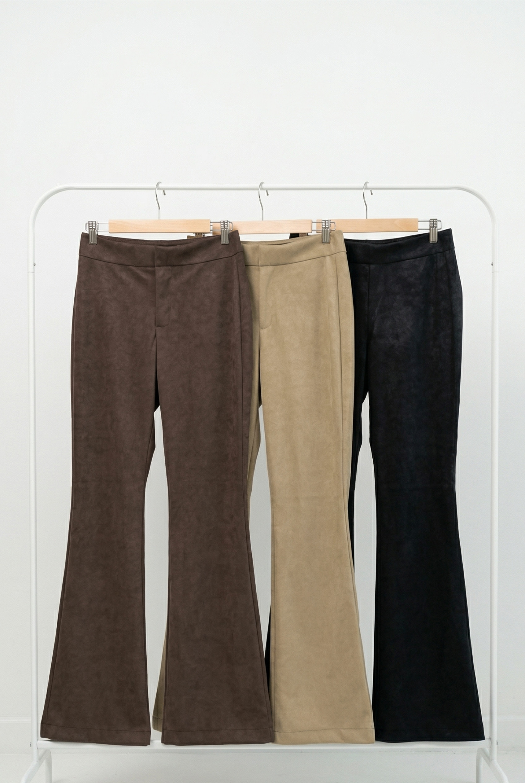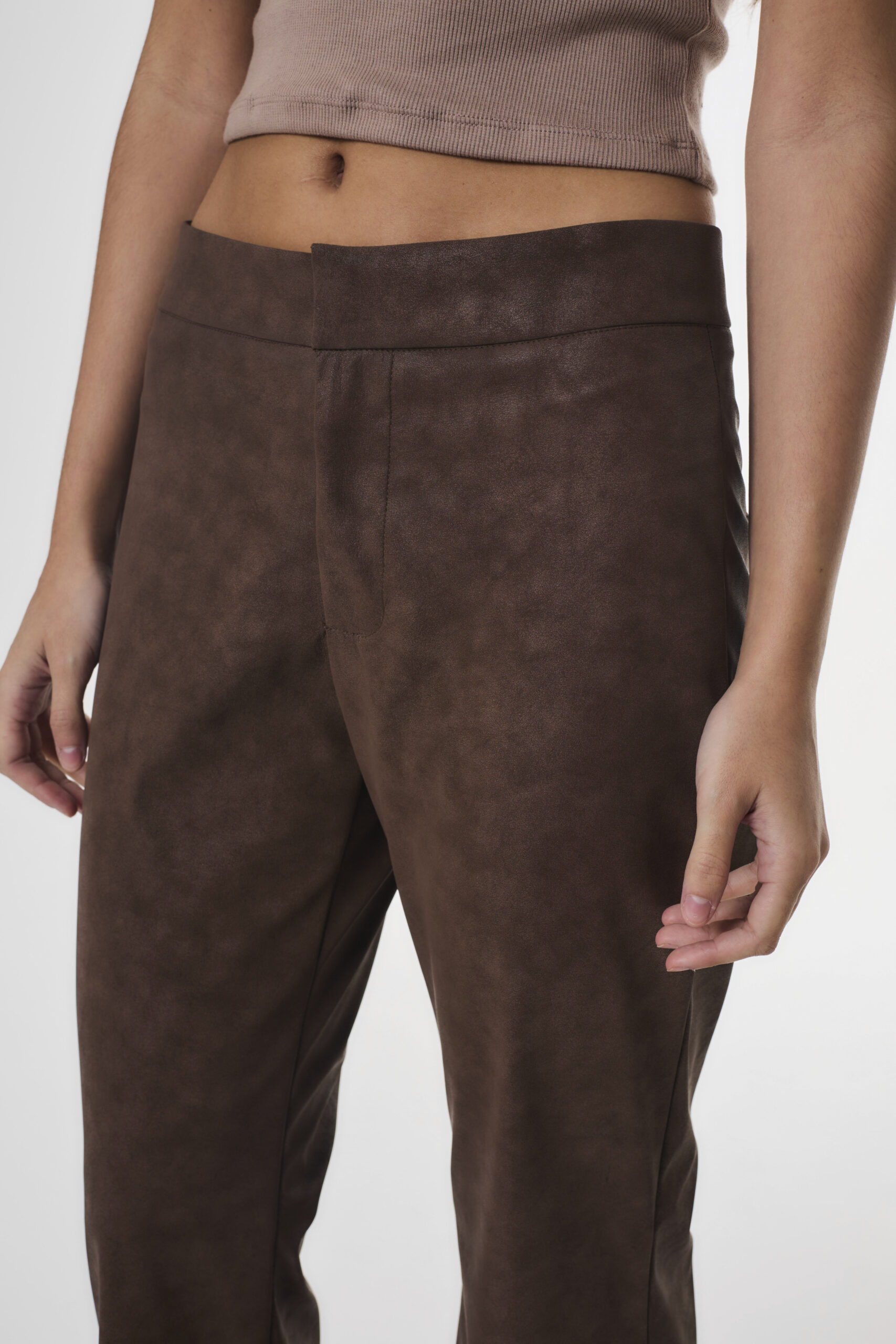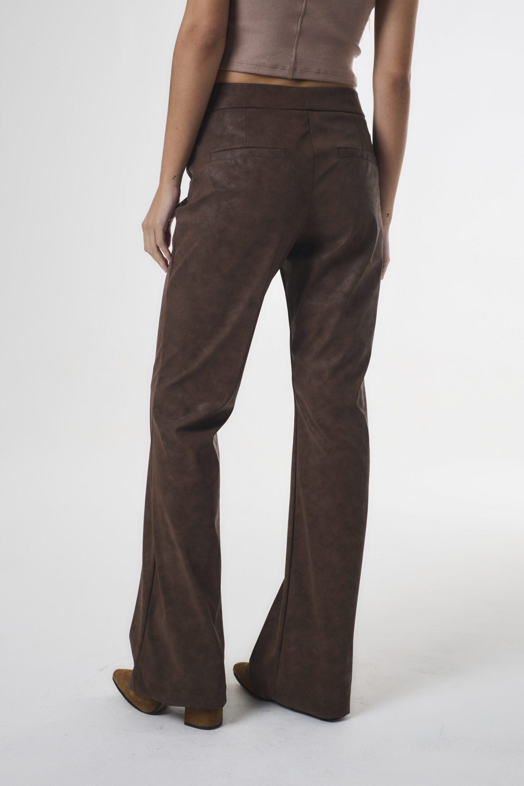 Pantalón de mujer tiro medio de calce flare. Lleva pinzas de entalle y ribetes en espalda. Se accede al pantalón mediante cierre, ganchos pantaloneros y botón, está confeccionado en suede.