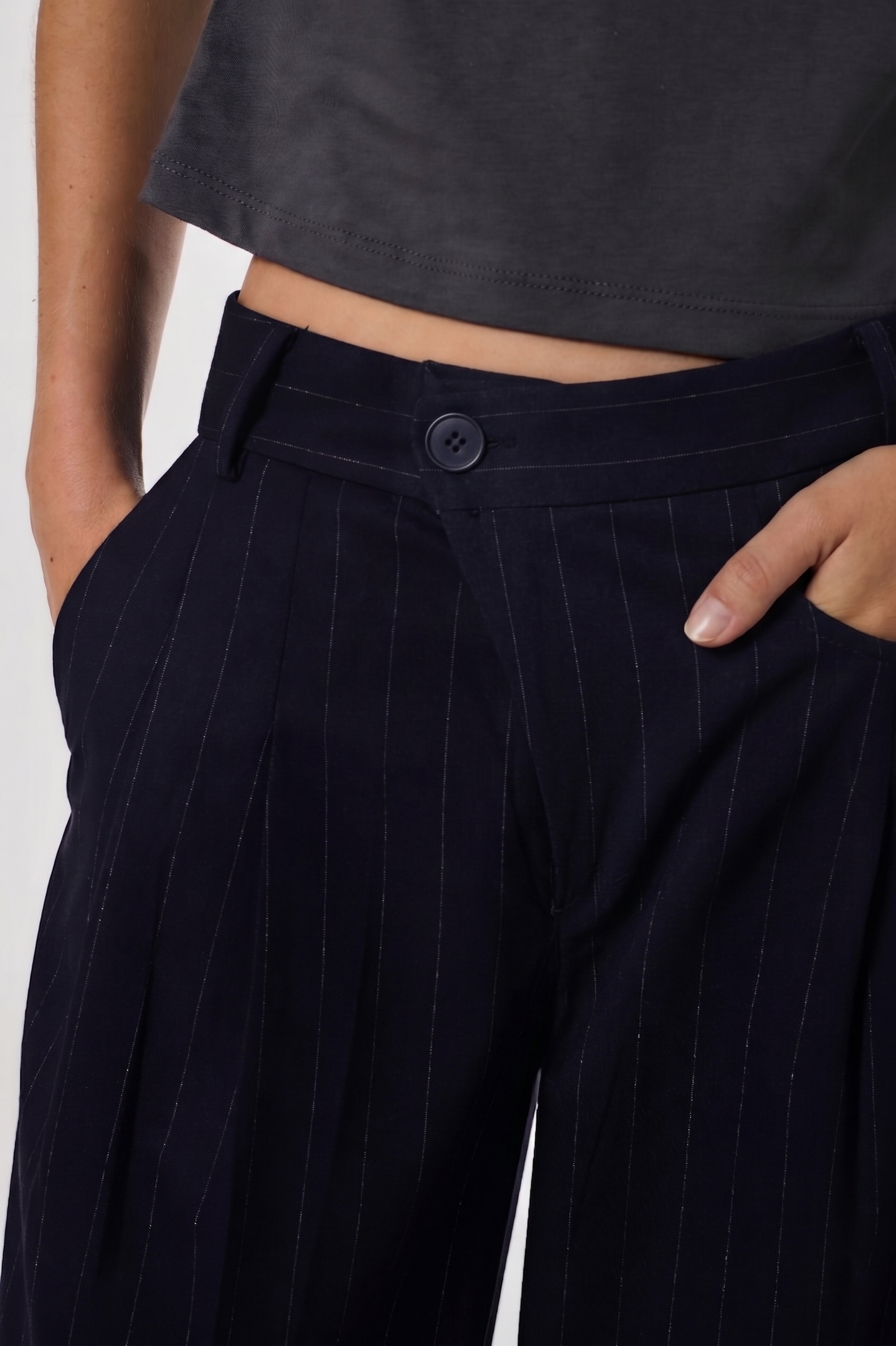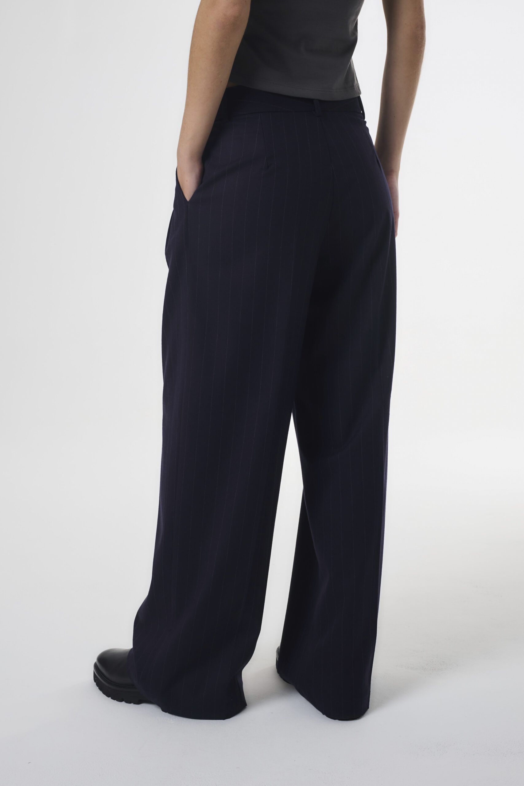 Pantalón de mujer tiro medio de pierna wide leg. La prenda lleva un detalle de cruce irregular en cintura. Posee también bolsillos laterales y pinzas de entalle en espalda. En cintura, lleva presillas y se accede a la prenda mediante cierre y botón. El pantalón está confeccionado en género sastrero.