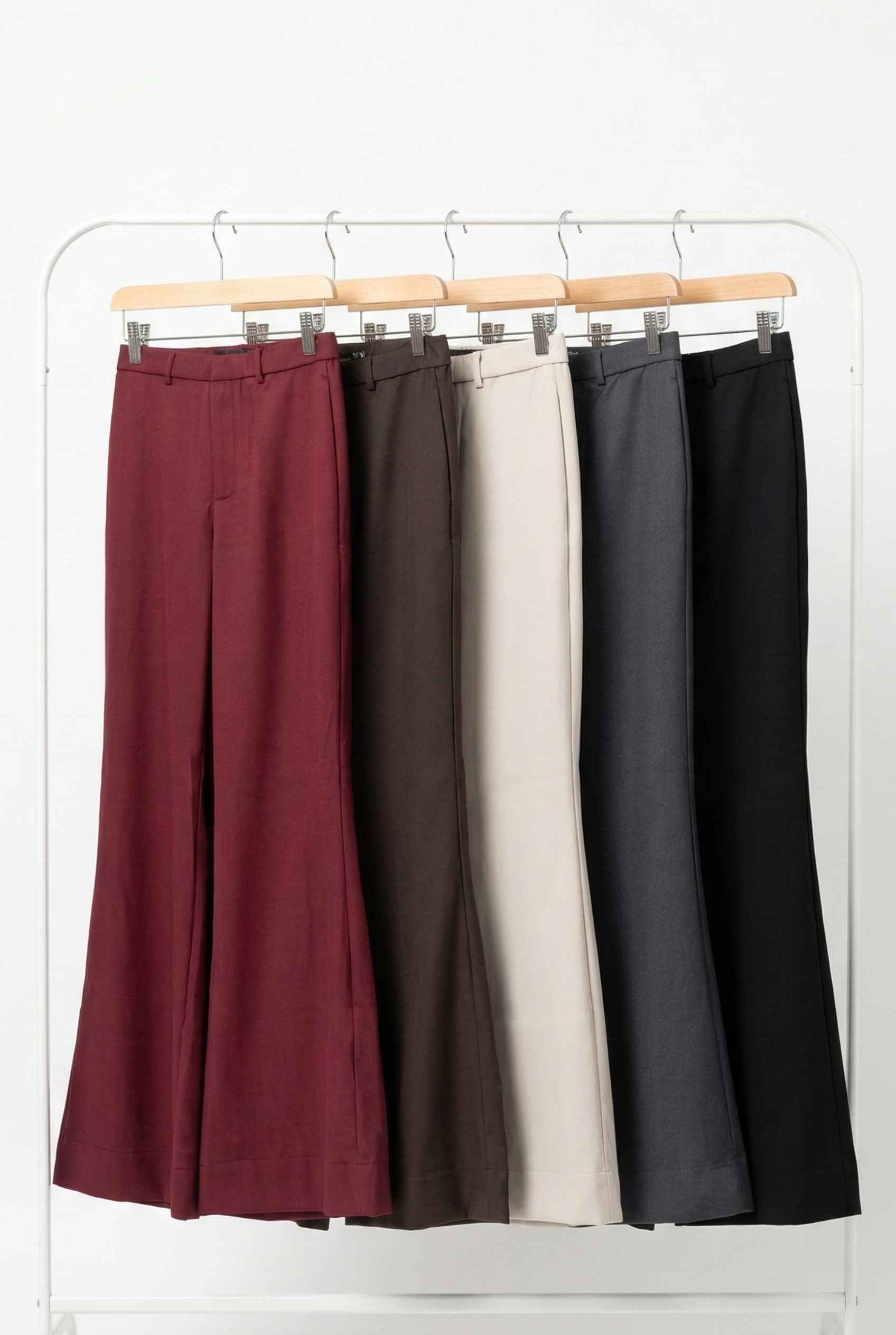 Pantalón de mujer tiro medio de calce flare, siendo ajustado en la parte superior y suelto de la rodilla hacia abajo. El pantalón lleva elástico en toda la cintura, bolsillos laterales y bolsillos ojal en la espalda. Bocamanga ancha doblada. Se accede a la prenda mediante cierre común, gancho pantalonero y botón interno. El pantalón está confeccionado en genero sastrero.