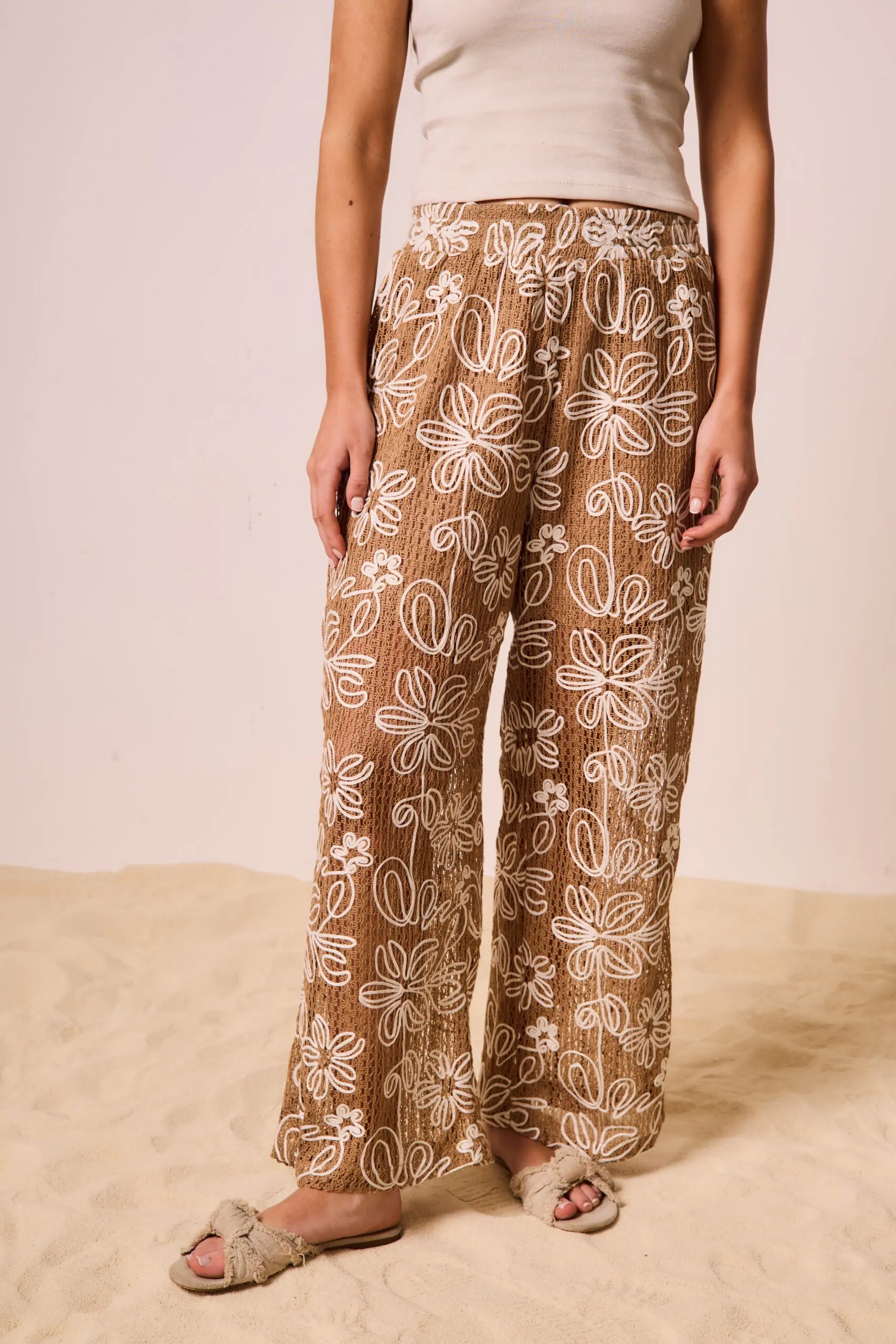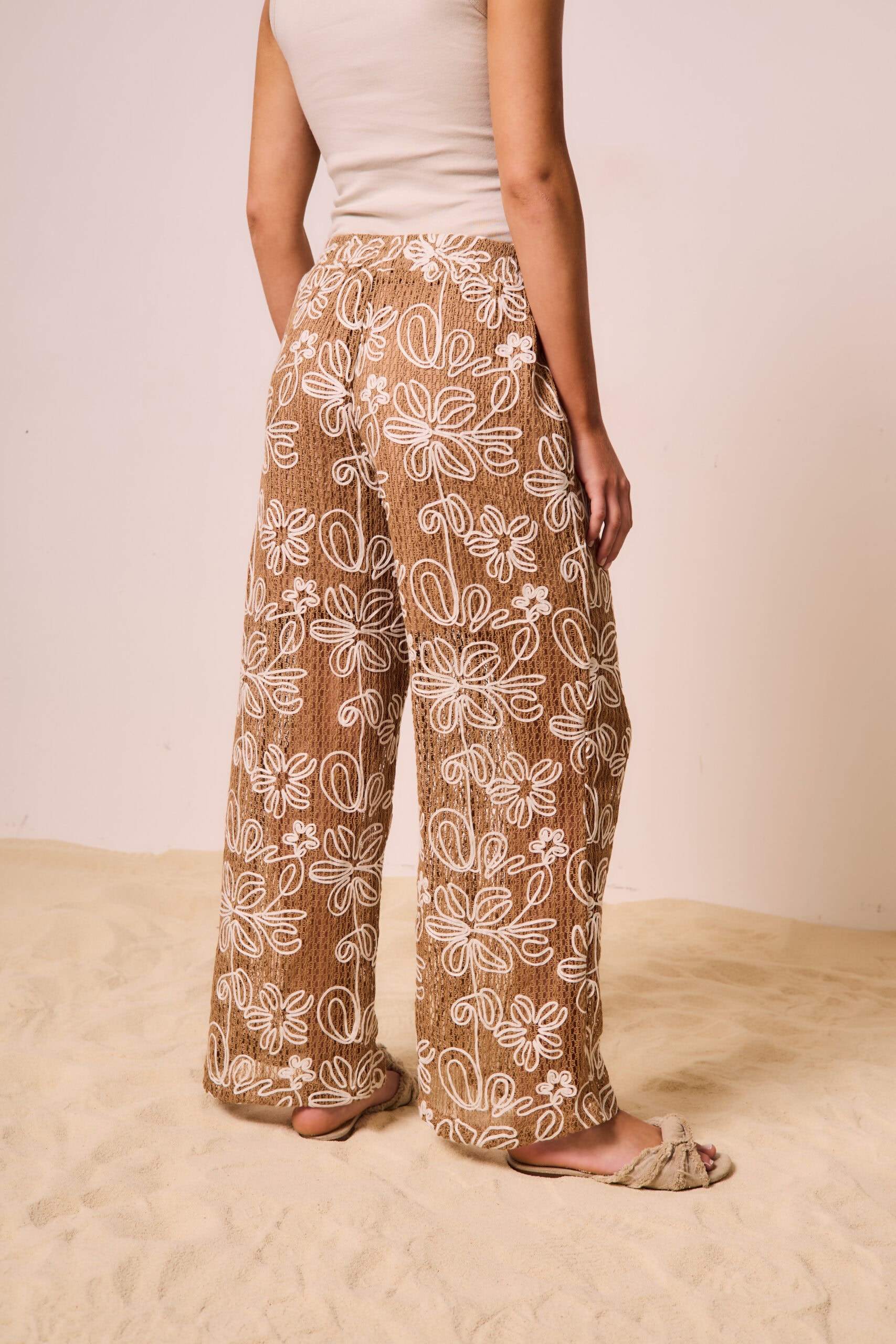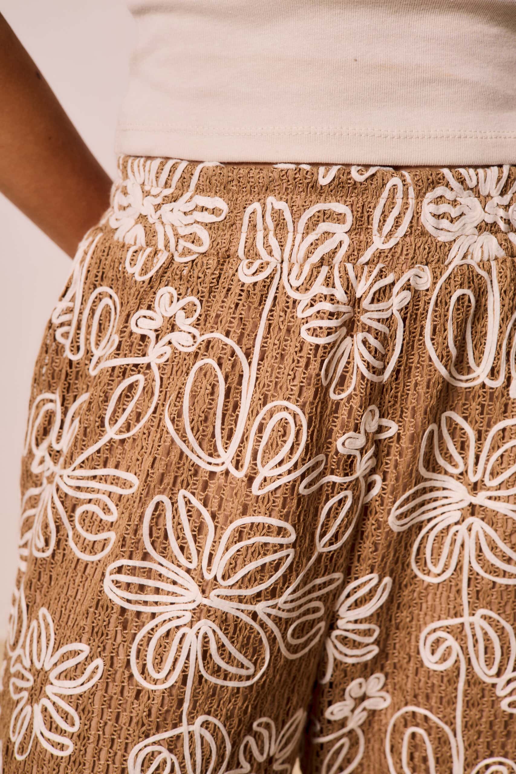 Pantalón importado de mujer de tejido con borados en motivo floral a sobretono. Es tiro medio y de calce recto. Tiene bolsillos laterales y forrería interna. Lleva cintura elástica. Composición 100% Algodón La modelo está usando S color Mocha Mousse