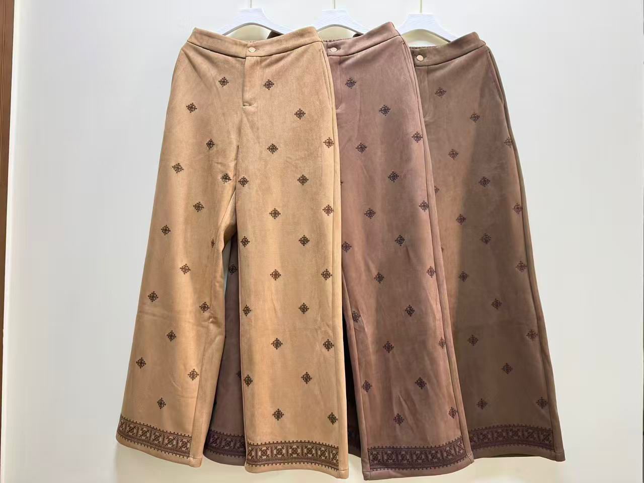 Pantalón de mujer tiro medio de calce recto. La prenda se destaca por llevar bordados en sobretono en punto cruz. También, posee un bordado en el recorrido del ruedo y cintura elástica en espalda. La prenda está confeccionada en símil gamuza y se concede acceso a la prenda mediante cierre y botón.