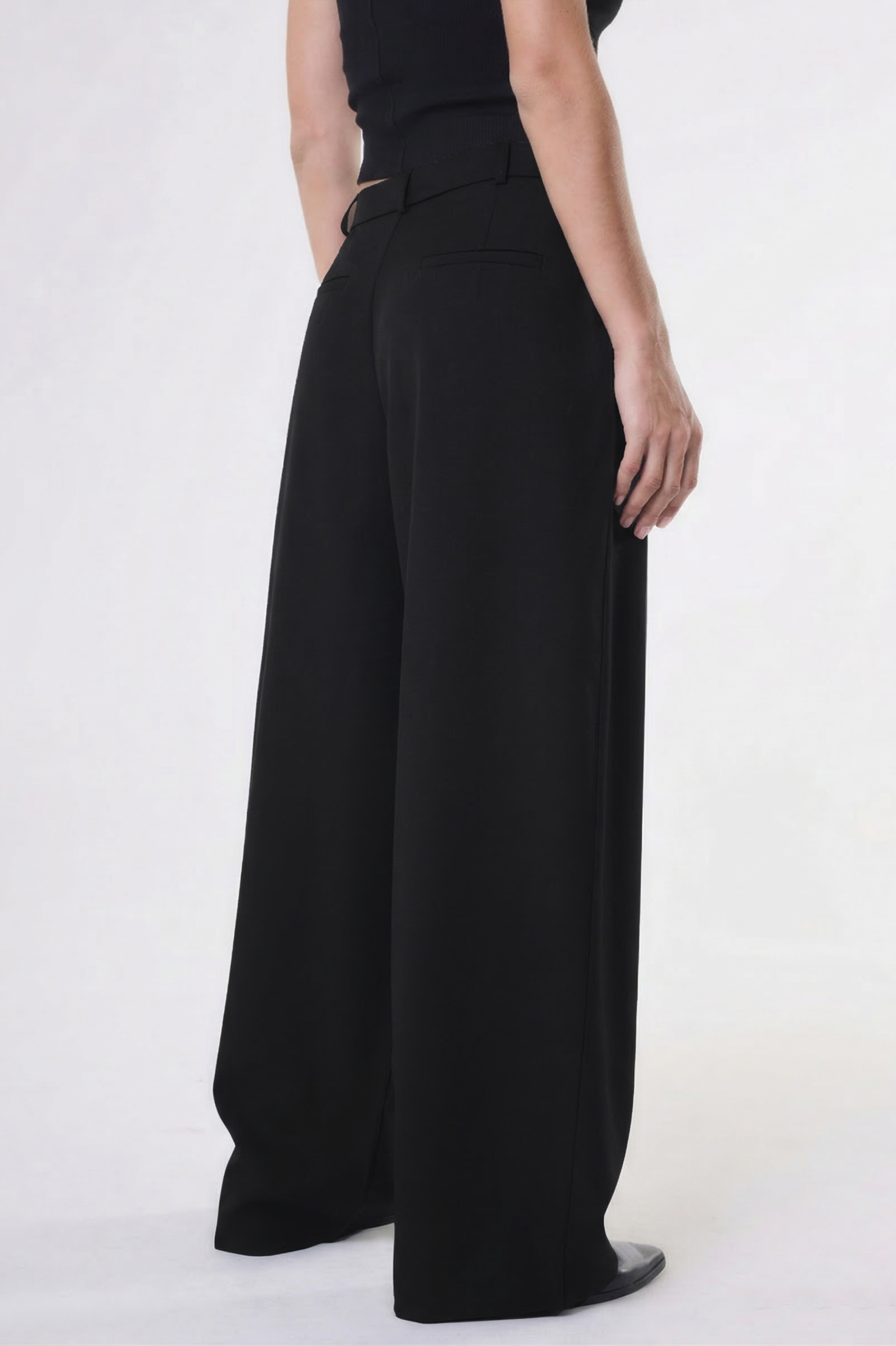 Pantalón de mujer tiro medio de calce wide leg. La prenda posee tablas en delantero y pinzas en espalda, al igual que bolsillos delanteros y bolsillos ojal en espalda. El pantalón lleva presillas y cruce asimétrico en cintura. La prenda está confeccionada en género sastrero y se concedde acceso a la misma mediante cierre, gancho pantalonero y botón interno.