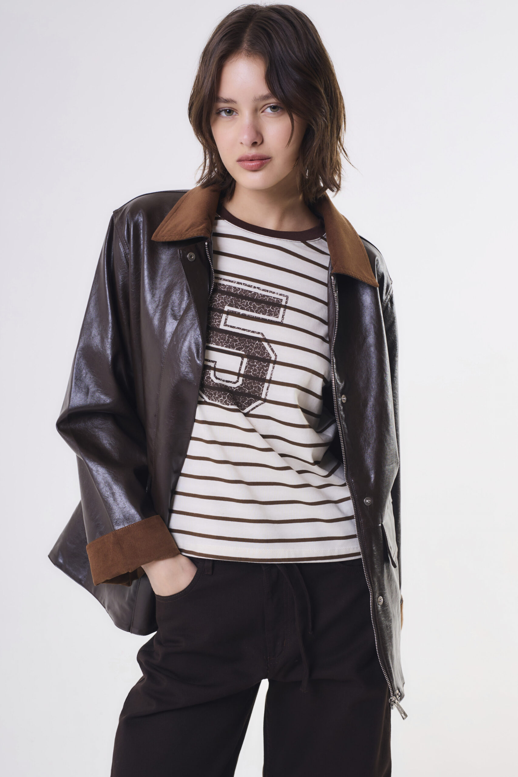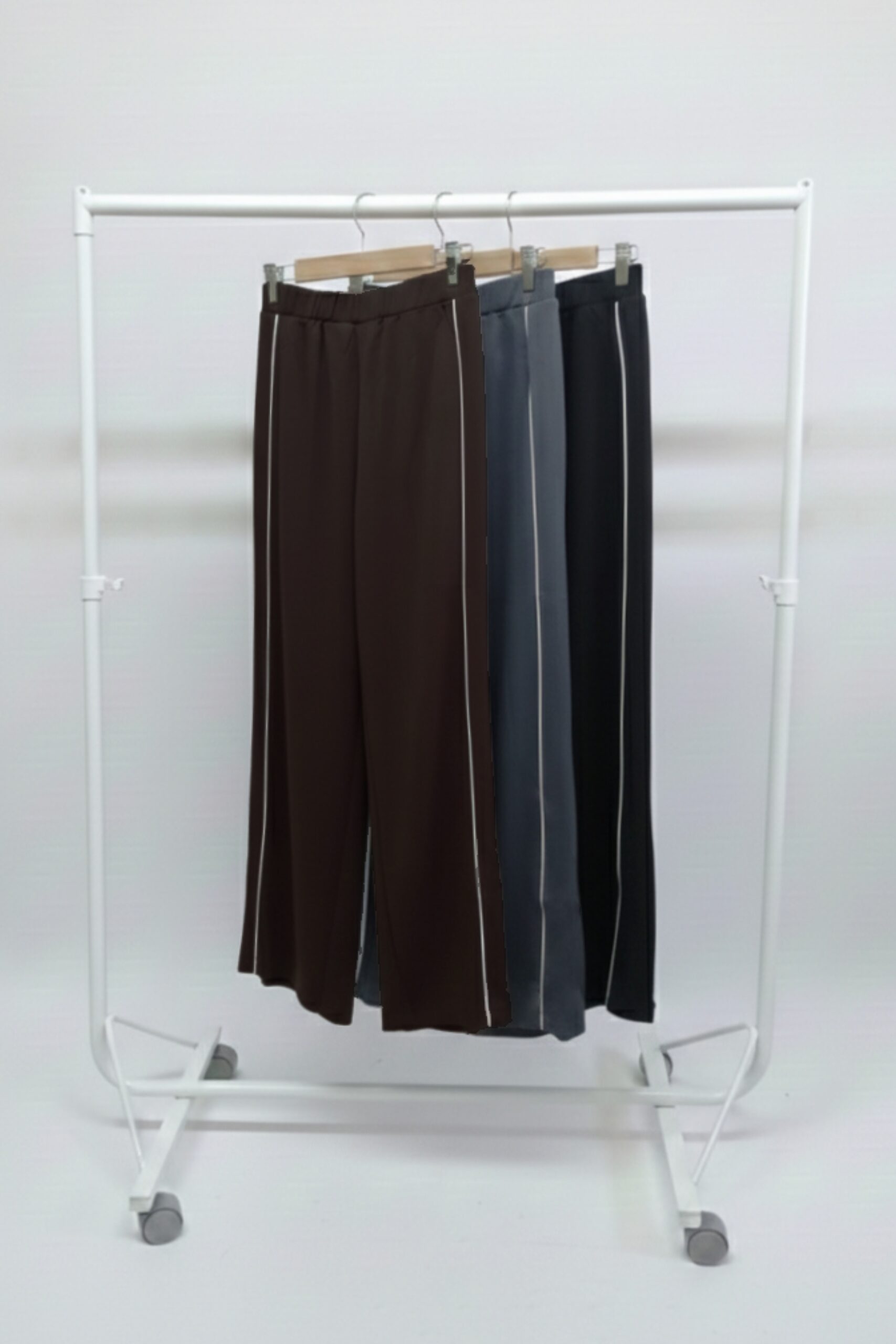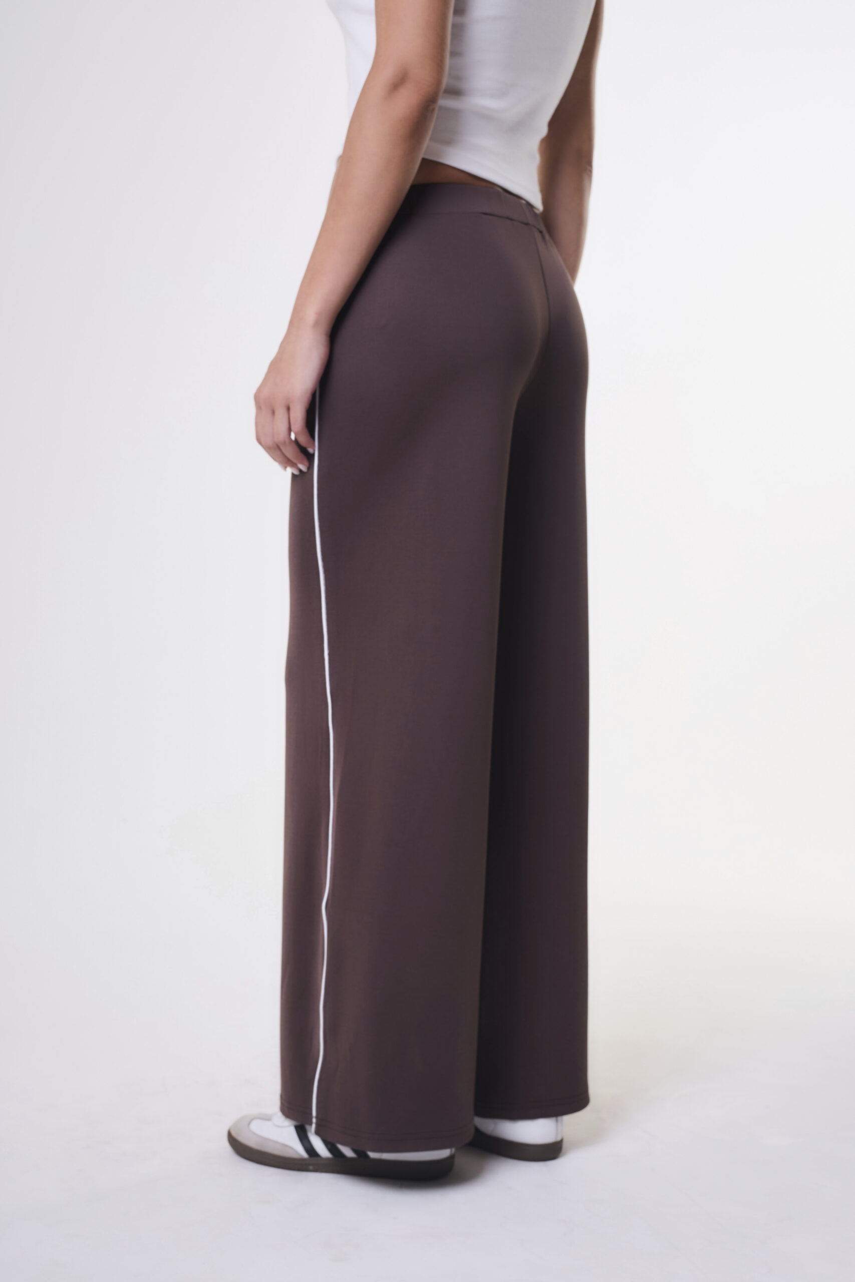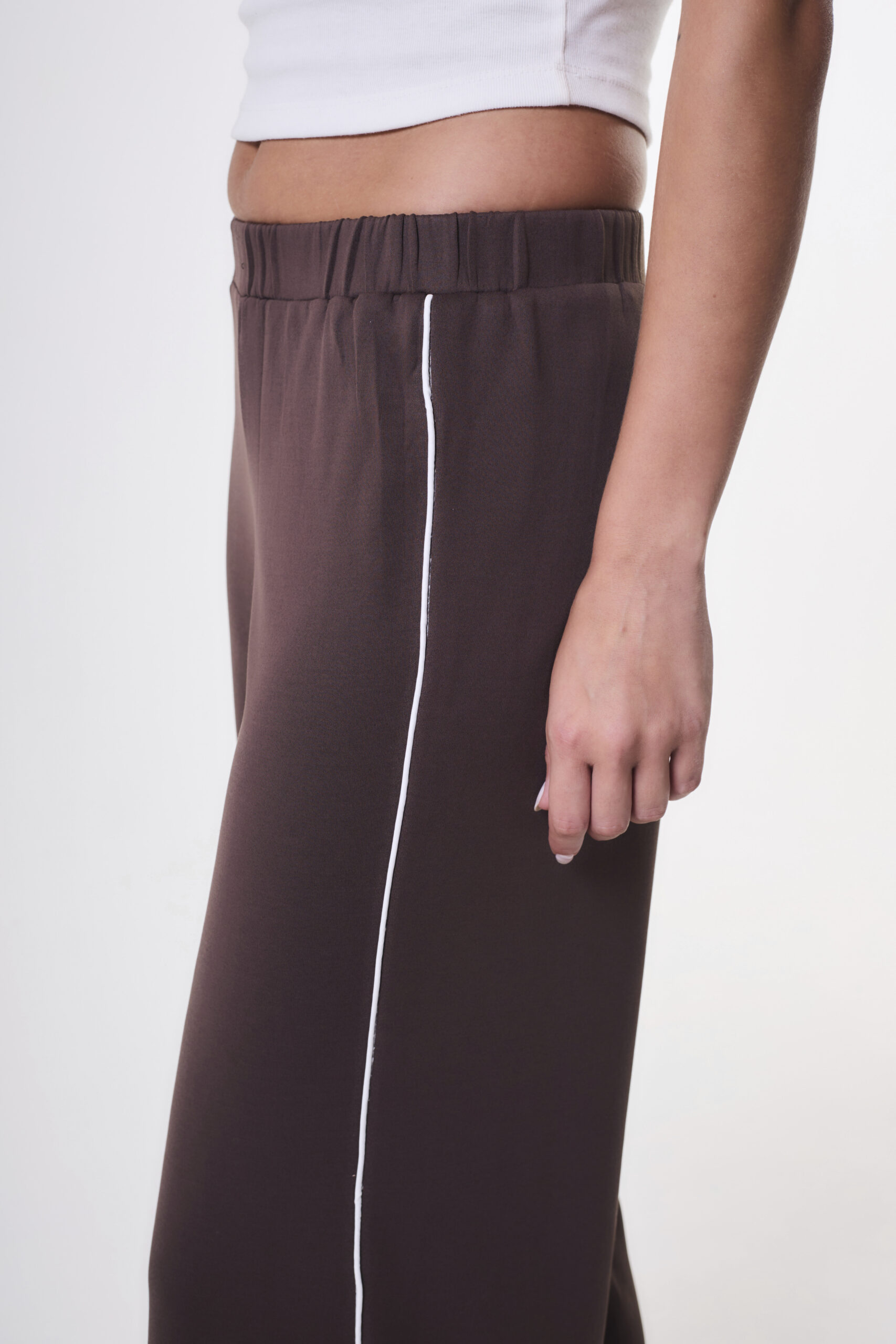 Pantalón palazzo wide leg de rústico diferenciado con detalle de vivo blanco en el delantero de la prenda.